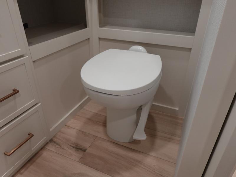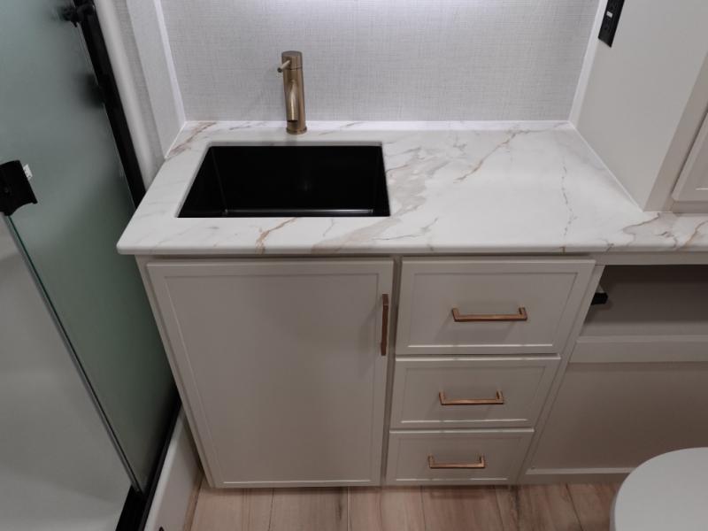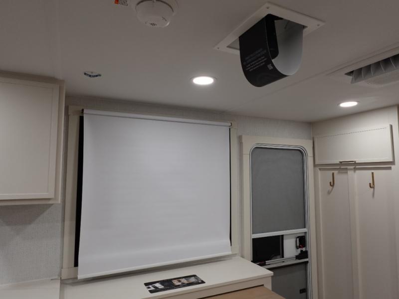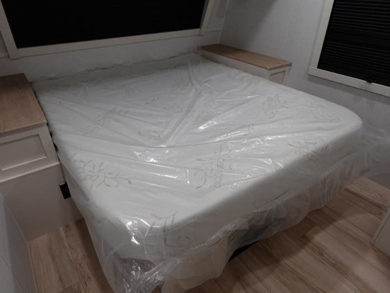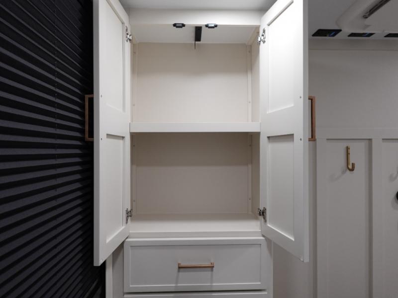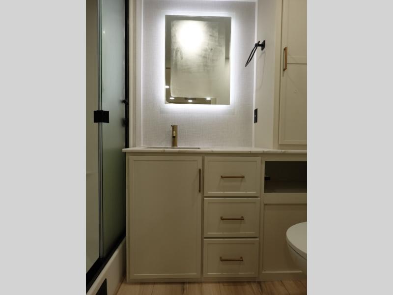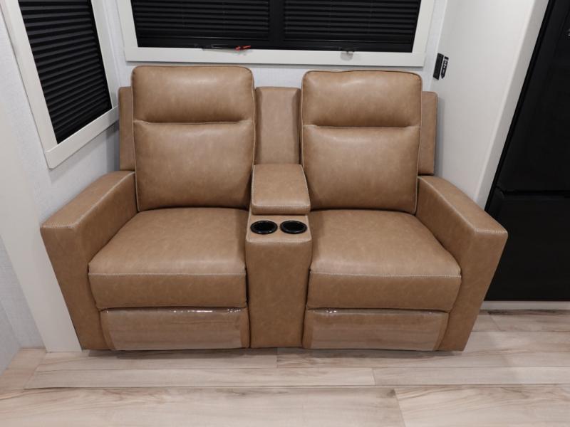 One look at this travel trailer and you'll be sold! The full rear bath features a spacious 42" x 30" shower with a built-in seat and Maxxair fan to name a few comforts. The front private bedroom features a 66" x 80" king bed with a MaxSpace Split-Level Wardrobe underneath to store shoes, clothes, and more! A slide out in the combined living area and kitchen makes your space more open, and you'll enjoy relaxing on the theater seating here in the evenings. The full kitchen includes a three burner stovetop, residential 30" convection microwave, 12 cu. ft. 12V refrigerator, plus a trash bin and Stow N' Go paper towel holder for added convenience. You can choose to eat outdoors under the 19' electric awning with LED lights or stay inside to dine at the pull-out dining table with a drawer for added storage!