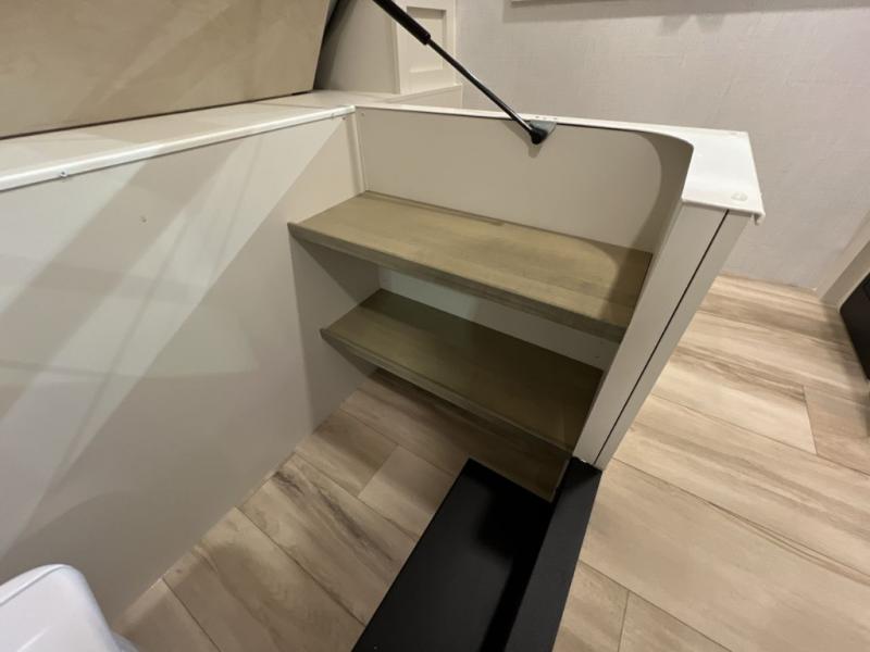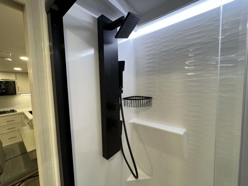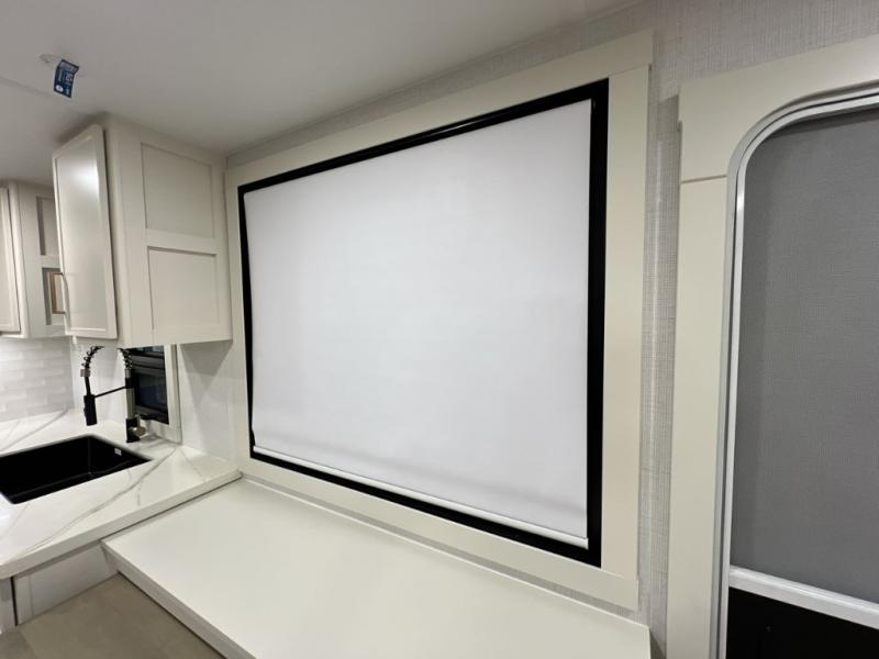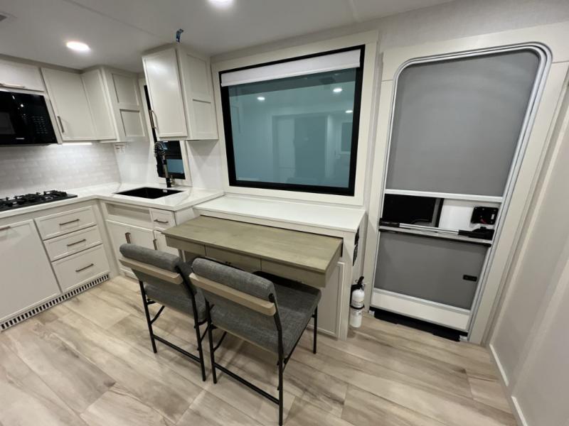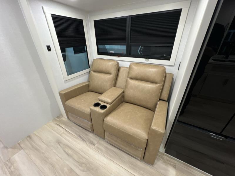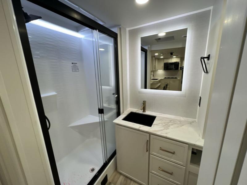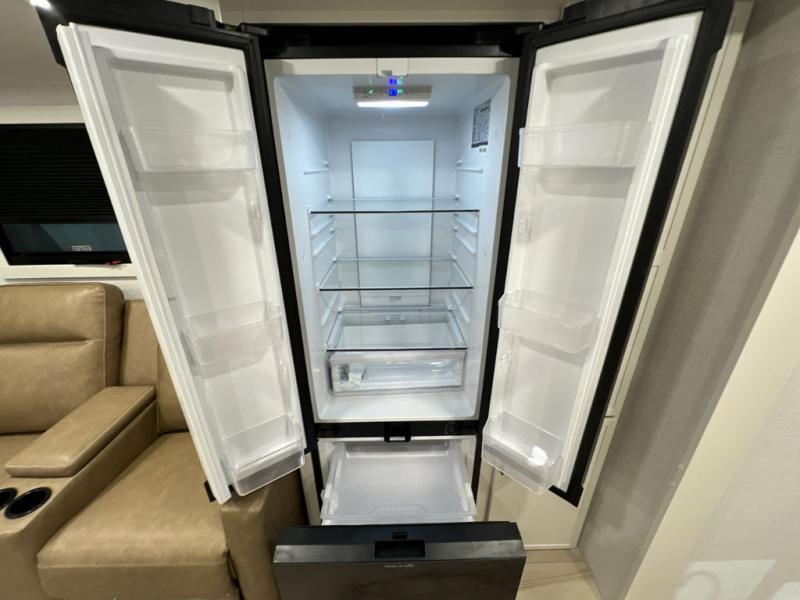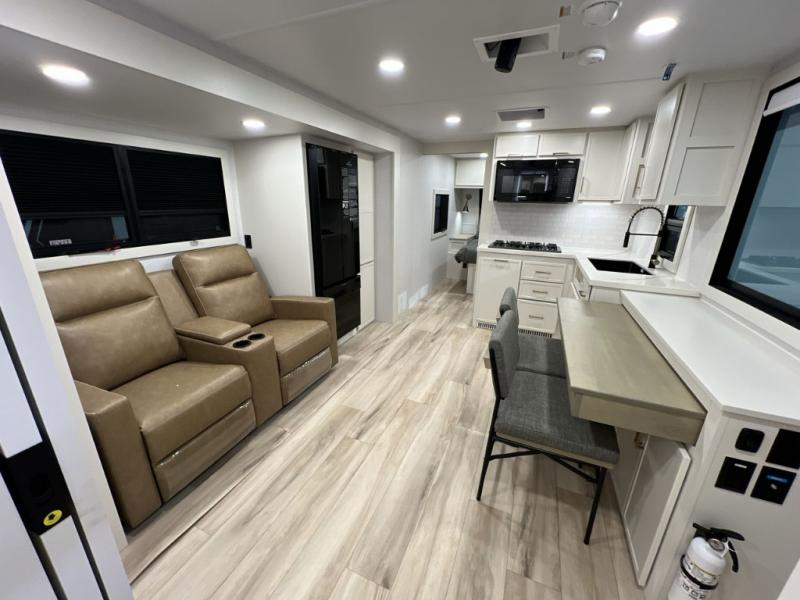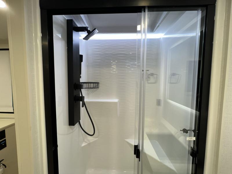 One look at this travel trailer and you'll be sold! The full rear bath features a spacious 30" x 42" shower with a glass shower door, built-in seat, and Maxxair fan to name a few comforts. The front private bedroom features a 66" x 80" king bed with a MaxSpace split-level wardrobe underneath to store shoes, clothes, and more! A slide out in the combined living area and kitchen makes your space more open, and you'll enjoy relaxing on the theater seating here in the evenings. There is also a 48" x 40" smart window with a screen that will allow you to view your indoor/outdoor projector screen for movies! The full kitchen includes a three burner stovetop, residential 30" convection microwave, 12 cu. ft. 12V refrigerator, plus a trash bin and Stow N' Go paper towel holder for added convenience. You can choose to eat outdoors under the 19' electric awning with LED lights or stay inside to dine at the pull-out dining table with a drawer for added storage!