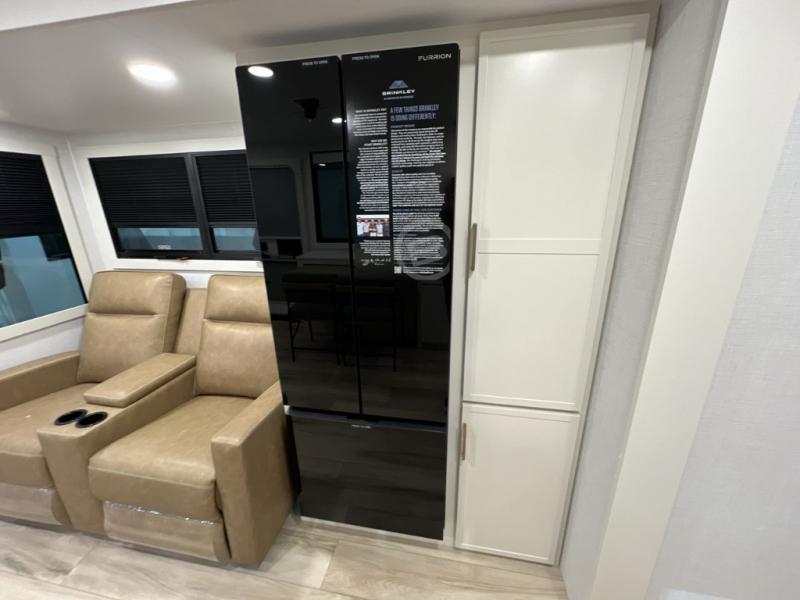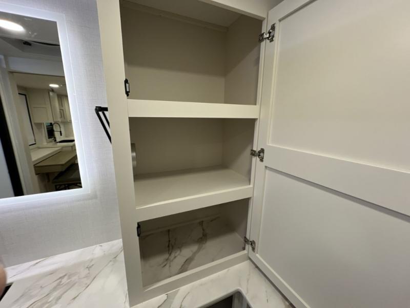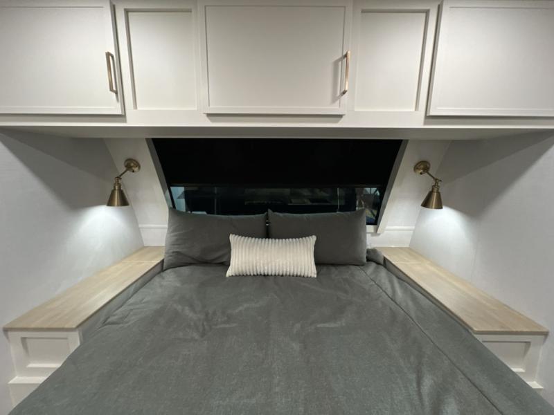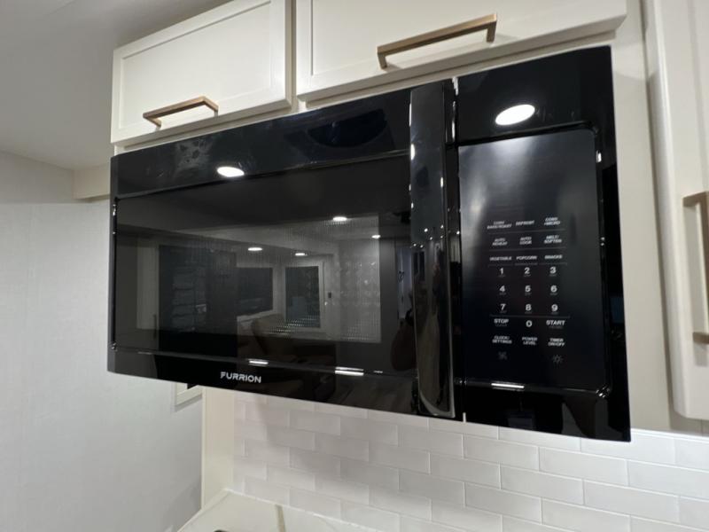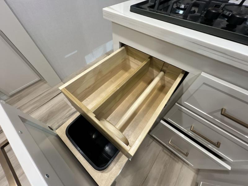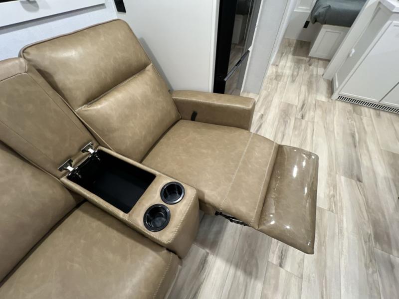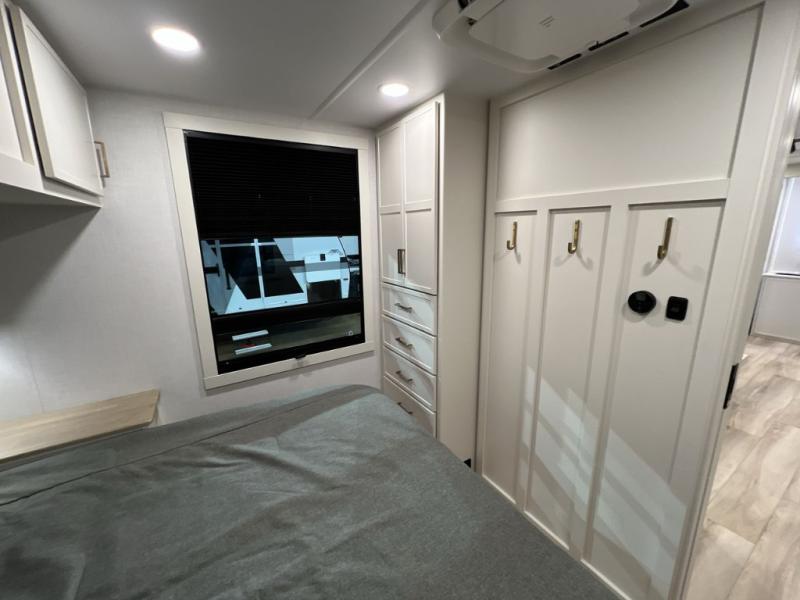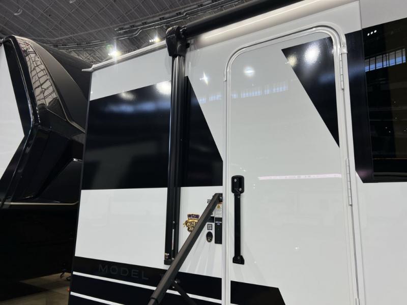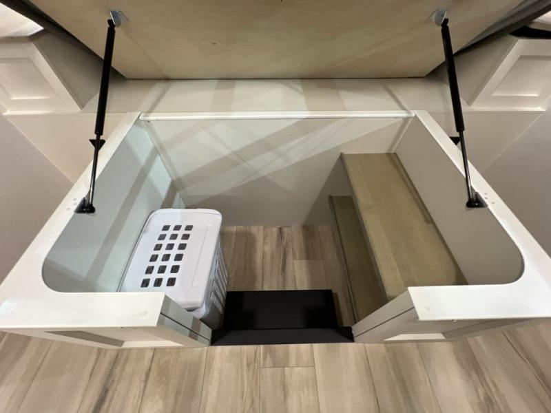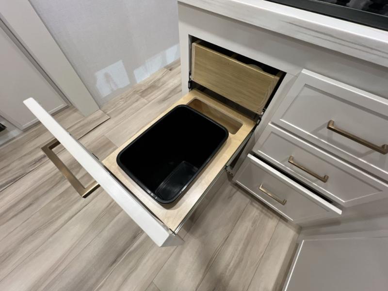 One look at this travel trailer and you'll be sold! The full rear bath features a spacious 30" x 42" shower with a glass shower door, built-in seat, and Maxxair fan to name a few comforts. The front private bedroom features a 66" x 80" king bed with a MaxSpace split-level wardrobe underneath to store shoes, clothes, and more! A slide out in the combined living area and kitchen makes your space more open, and you'll enjoy relaxing on the theater seating here in the evenings. There is also a 48" x 40" smart window with a screen that will allow you to view your indoor/outdoor projector screen for movies! The full kitchen includes a three burner stovetop, residential 30" convection microwave, 12 cu. ft. 12V refrigerator, plus a trash bin and Stow N' Go paper towel holder for added convenience. You can choose to eat outdoors under the 19' electric awning with LED lights or stay inside to dine at the pull-out dining table with a drawer for added storage!