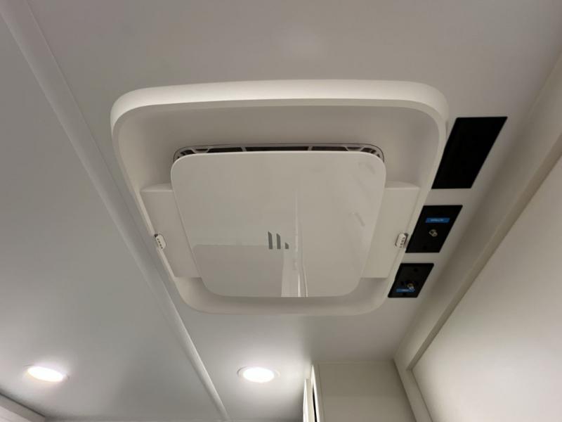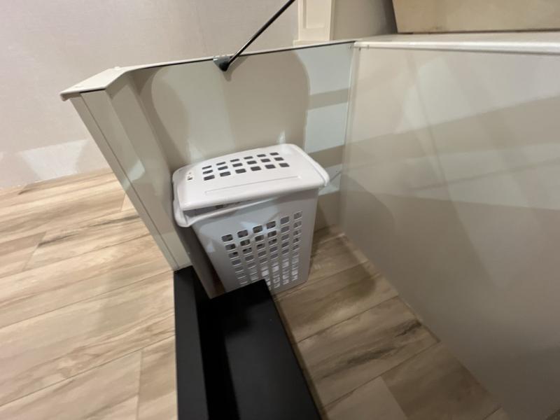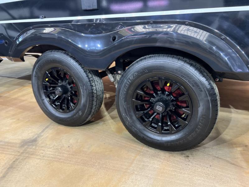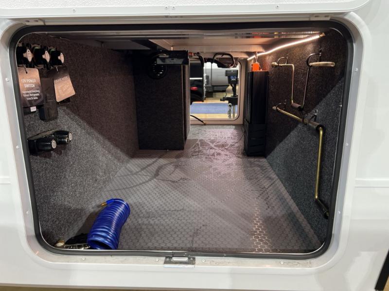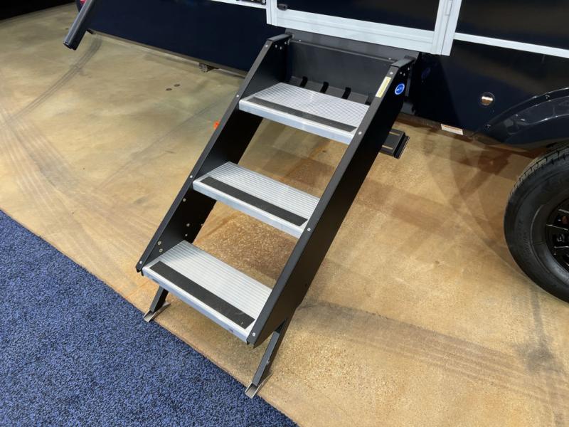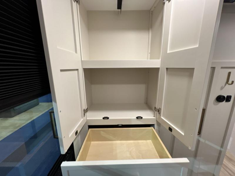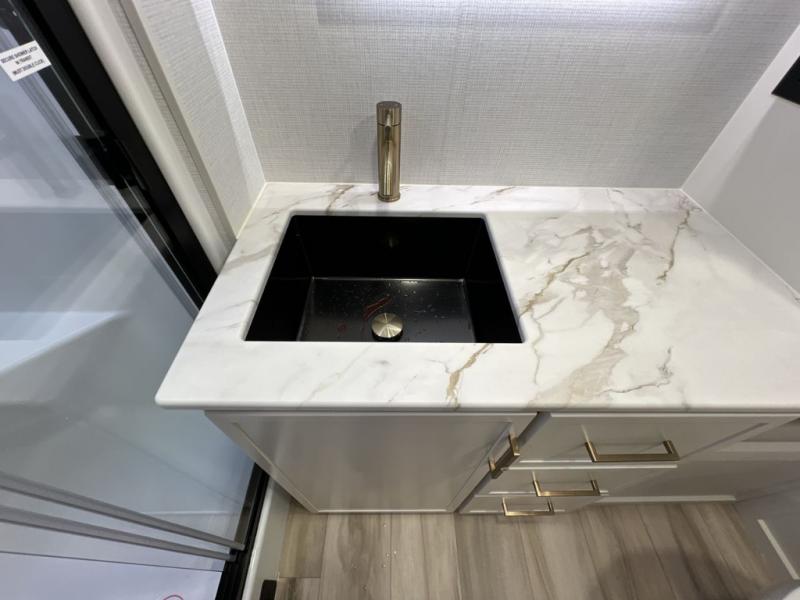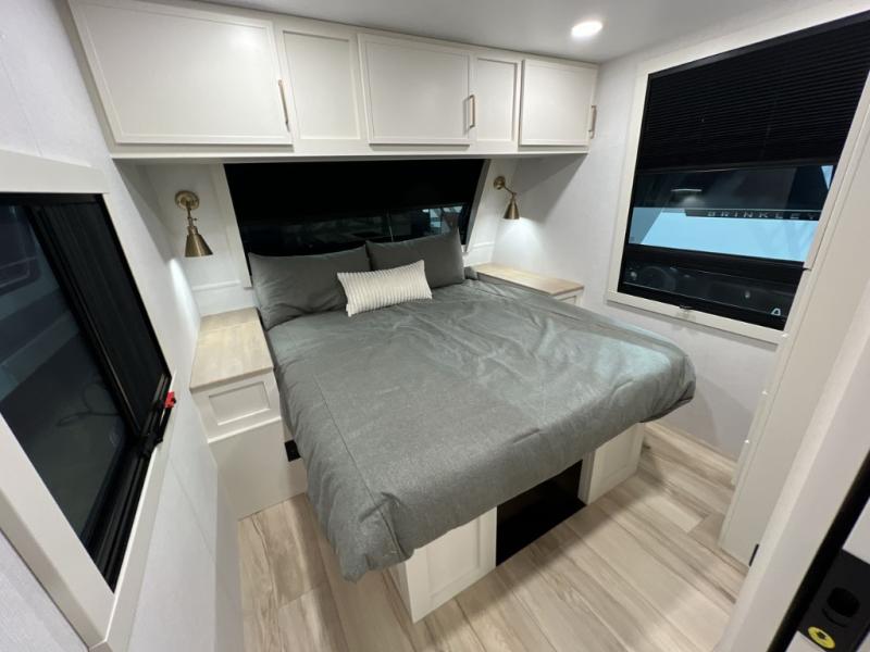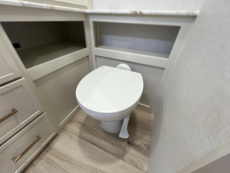 One look at this travel trailer and you'll be sold! The full rear bath features a spacious 30" x 42" shower with a glass shower door, built-in seat, and Maxxair fan to name a few comforts. The front private bedroom features a 66" x 80" king bed with a MaxSpace split-level wardrobe underneath to store shoes, clothes, and more! A slide out in the combined living area and kitchen makes your space more open, and you'll enjoy relaxing on the theater seating here in the evenings. There is also a 48" x 40" smart window with a screen that will allow you to view your indoor/outdoor projector screen for movies! The full kitchen includes a three burner stovetop, residential 30" convection microwave, 12 cu. ft. 12V refrigerator, plus a trash bin and Stow N' Go paper towel holder for added convenience. You can choose to eat outdoors under the 19' electric awning with LED lights or stay inside to dine at the pull-out dining table with a drawer for added storage!