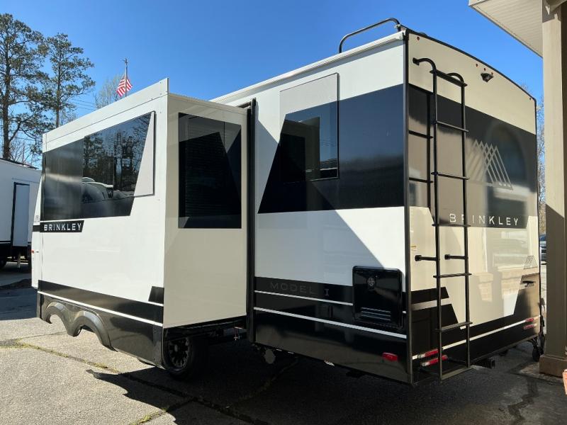 The lightweight Model I travel trailer by Brinkley is the perfect choice for those looking for an easy tow and at-home comforts! There is a drop-frame chassis, high-performance Road Armor suspension equalizer system, and Demco EZ Latch trailer coupler that automatically latches when dropped onto a hitch ball without the need of a safety pin. Additional exterior features include square Euro frameless windows, automotive-grade paint, full-width LED strip lighting in the pass-thru, and a pet & property security campside tie-down to keep your gear and furry friends safe. Inside, you'll be wowed by Brinkley's CraftSense wood trim construction, residential solid surface kitchen countertops, dimmable bedroom lights, and marine-grade neon LED shower lighting to name a few stand-out features!
