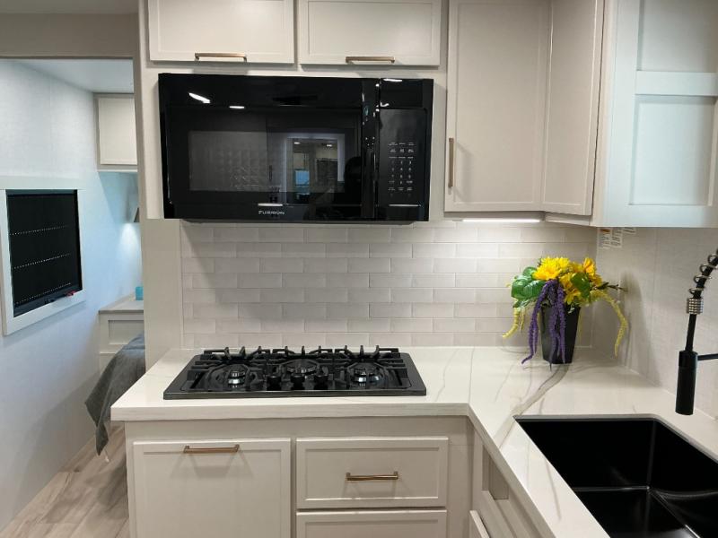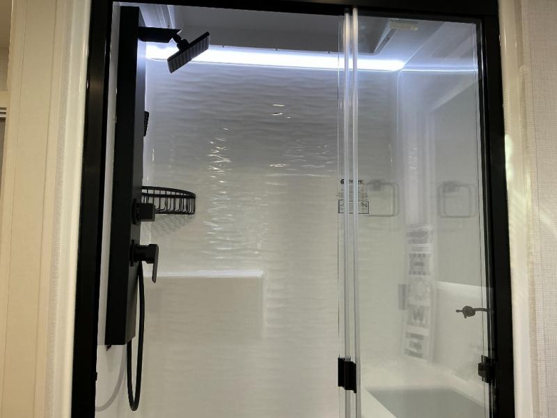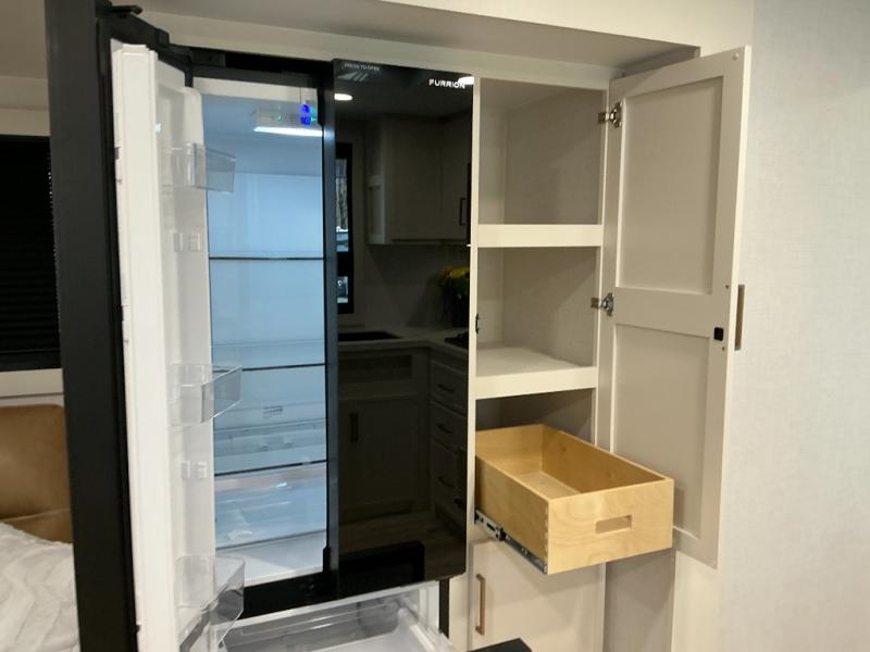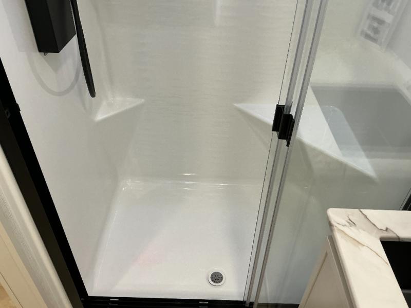 One look at this travel trailer and you'll be sold! The full rear bath features a spacious 42" x 30" shower with a built-in seat and Maxxair fan to name a few comforts. The front private bedroom features a 66" x 80" king bed with a MaxSpace Split-Level Wardrobe underneath to store shoes, clothes, and more! A slide out in the combined living area and kitchen makes your space more open, and you'll enjoy relaxing on the theater seating here in the evenings. The full kitchen includes a three burner stovetop, residential 30" convection microwave, 12 cu. ft. 12V refrigerator, plus a trash bin and Stow N' Go paper towel holder for added convenience. You can choose to eat outdoors under the 19' electric awning with LED lights or stay inside to dine at the pull-out dining table with a drawer for added storage! And if you're needing more sleeping space, just choose the optional tri-fold sofa in place of the theater seating!