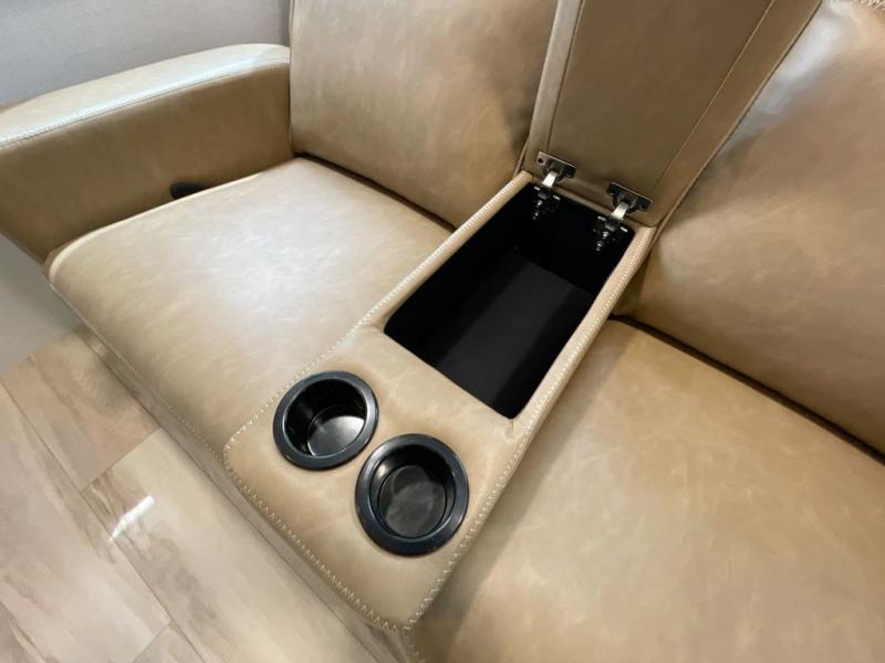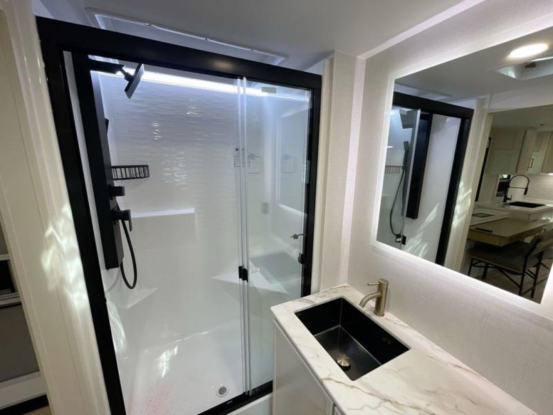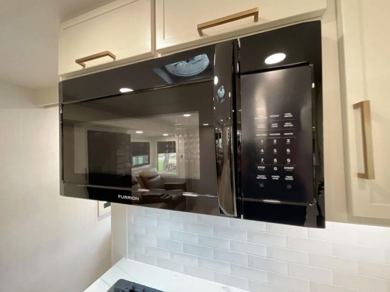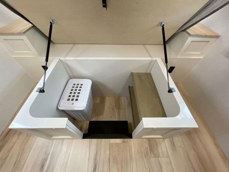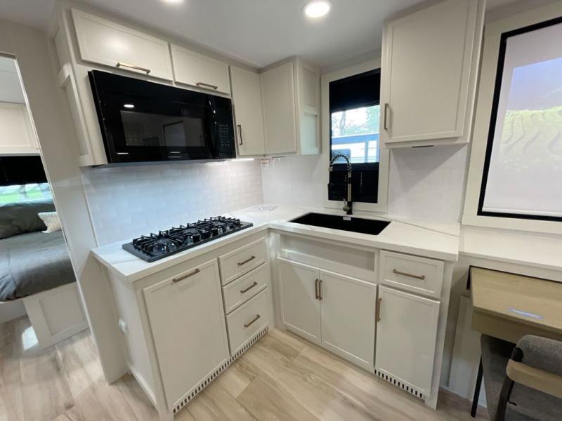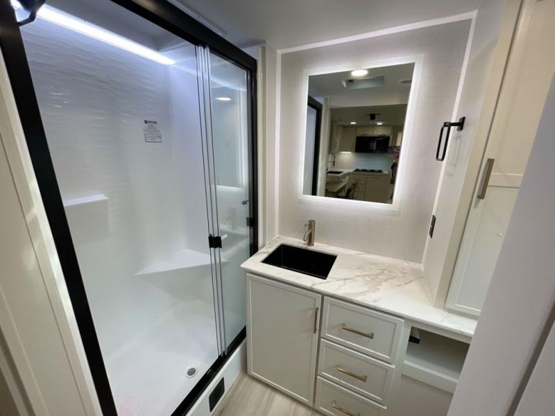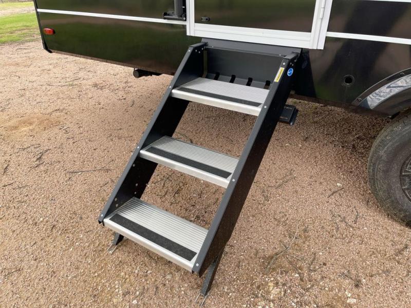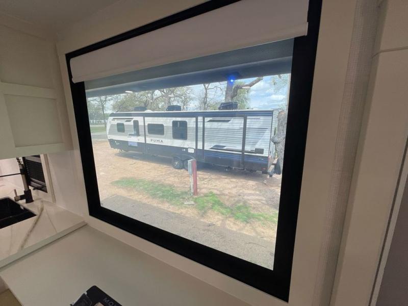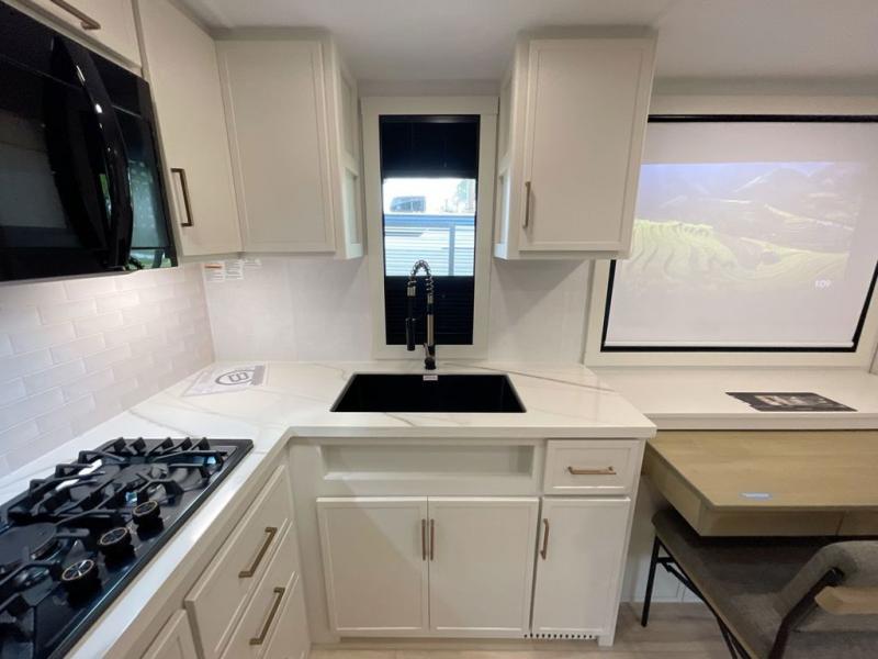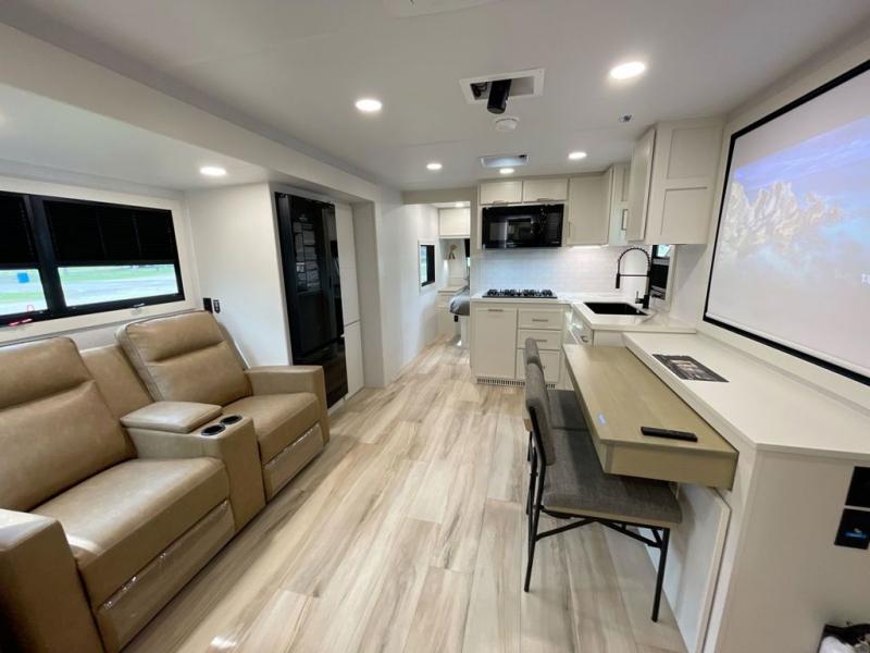 One look at this travel trailer and you'll be sold! The full rear bath features a spacious 30" x 42" shower with a glass shower door, built-in seat, and Maxxair fan to name a few comforts. The front private bedroom features a 66" x 80" king bed with a MaxSpace split-level wardrobe underneath to store shoes, clothes, and more! A slide out in the combined living area and kitchen makes your space more open, and you'll enjoy relaxing on the theater seating here in the evenings. There is also a 48" x 40" smart window with a screen that will allow you to view your indoor/outdoor projector screen for movies! The full kitchen includes a three burner stovetop, residential 30" convection microwave, 12 cu. ft. 12V refrigerator, plus a trash bin and Stow N' Go paper towel holder for added convenience. You can choose to eat outdoors under the 19' electric awning with LED lights or stay inside to dine at the pull-out dining table with a drawer for added storage!