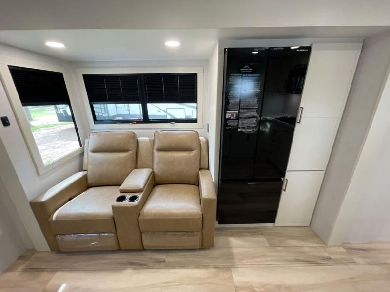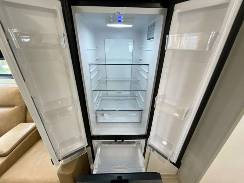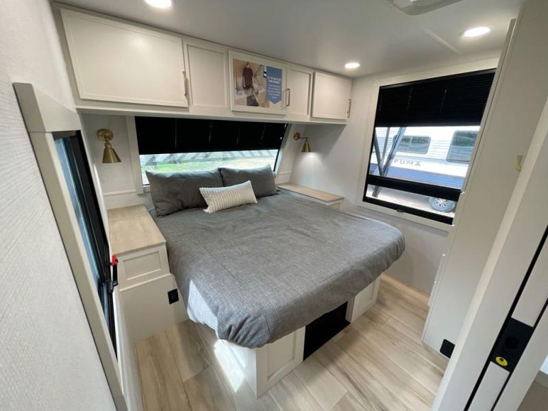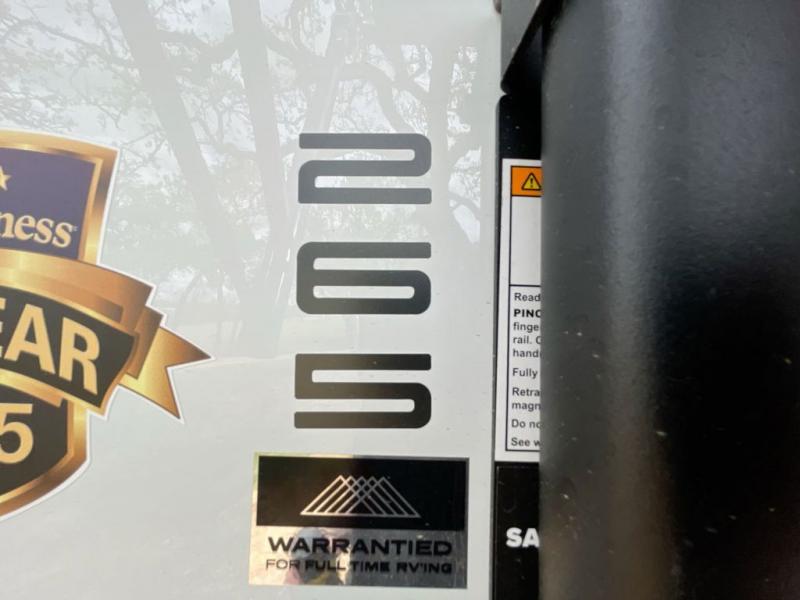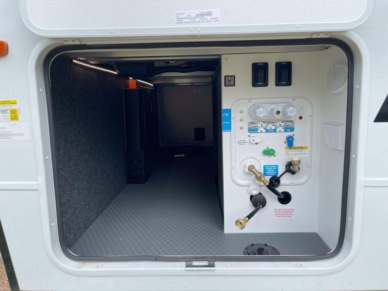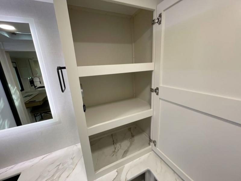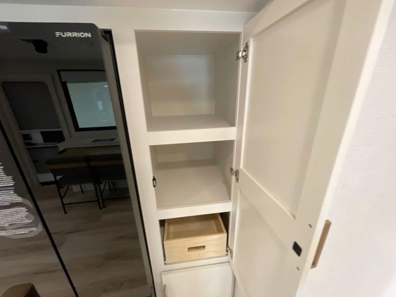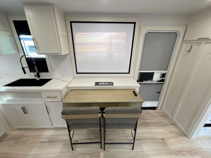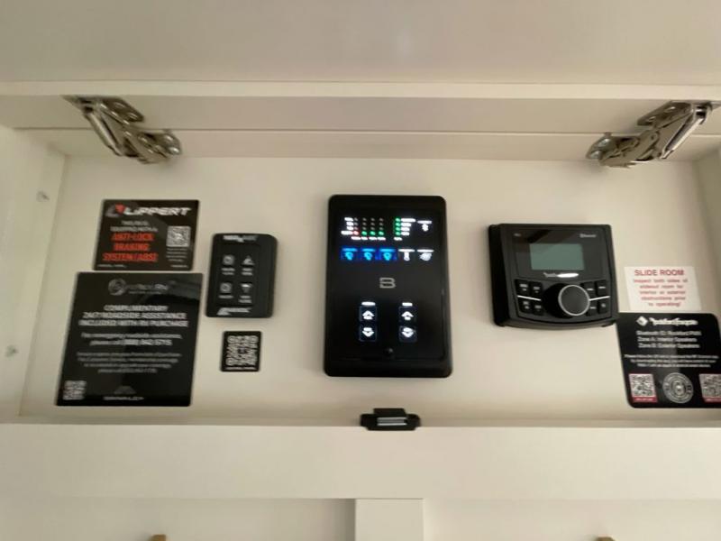 One look at this travel trailer and you'll be sold! The full rear bath features a spacious 30" x 42" shower with a glass shower door, built-in seat, and Maxxair fan to name a few comforts. The front private bedroom features a 66" x 80" king bed with a MaxSpace split-level wardrobe underneath to store shoes, clothes, and more! A slide out in the combined living area and kitchen makes your space more open, and you'll enjoy relaxing on the theater seating here in the evenings. There is also a 48" x 40" smart window with a screen that will allow you to view your indoor/outdoor projector screen for movies! The full kitchen includes a three burner stovetop, residential 30" convection microwave, 12 cu. ft. 12V refrigerator, plus a trash bin and Stow N' Go paper towel holder for added convenience. You can choose to eat outdoors under the 19' electric awning with LED lights or stay inside to dine at the pull-out dining table with a drawer for added storage!