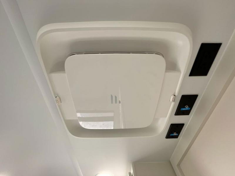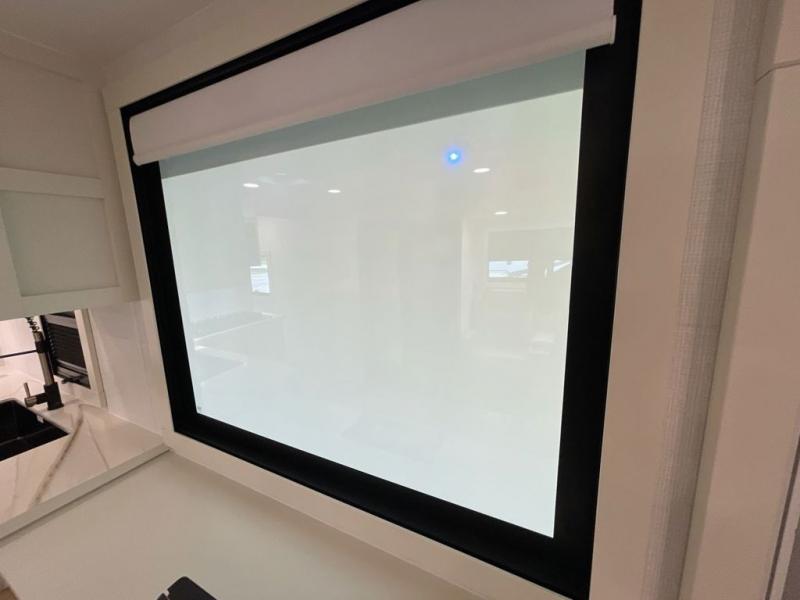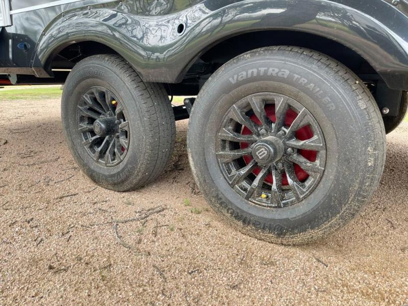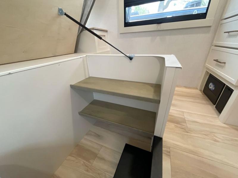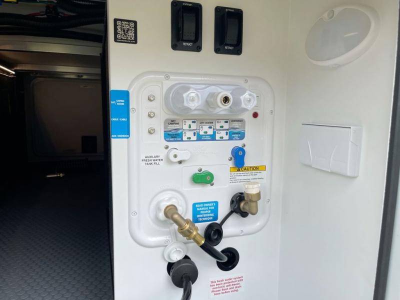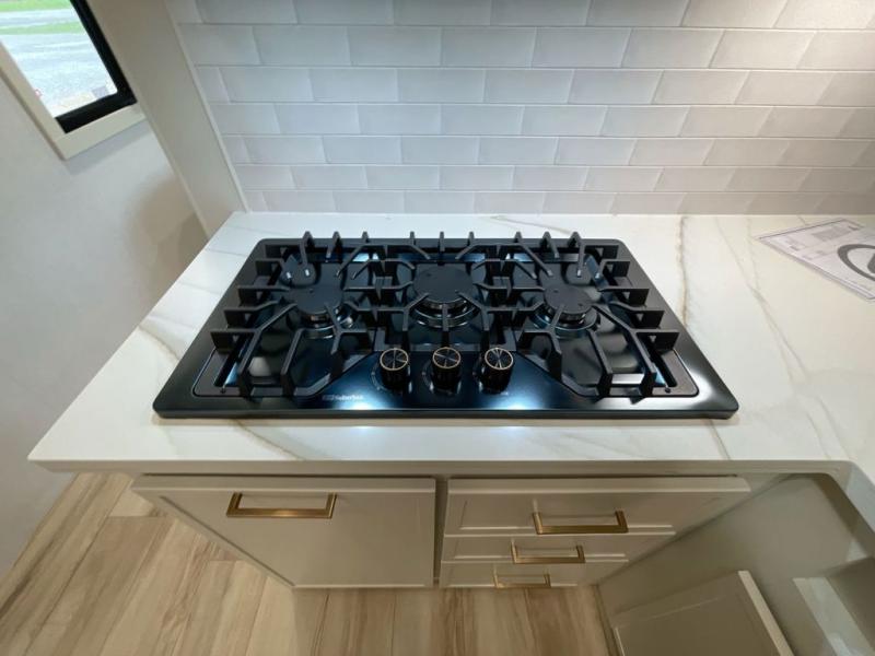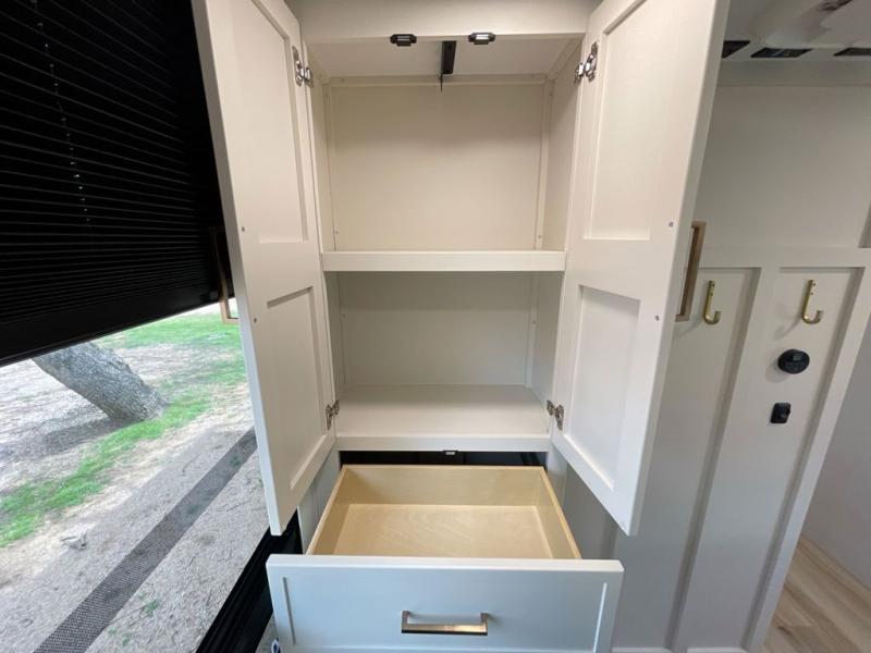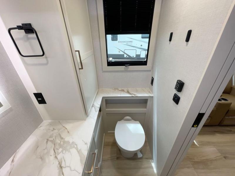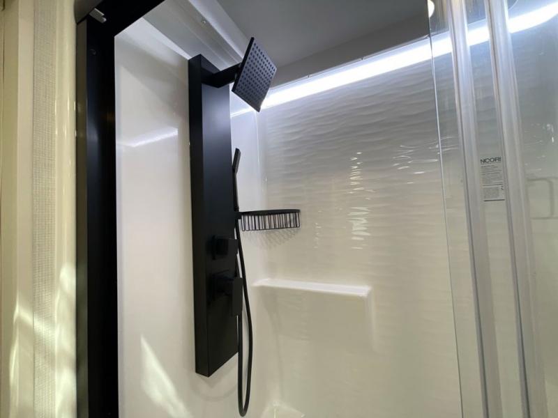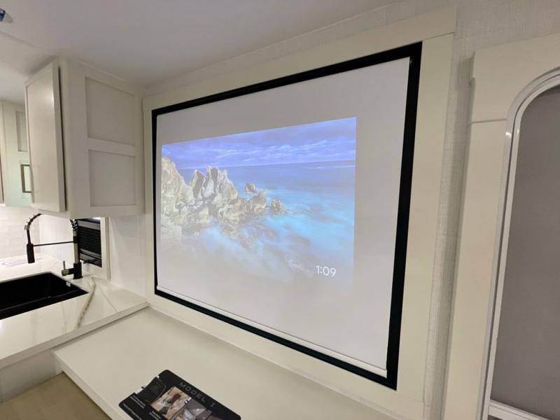 One look at this travel trailer and you'll be sold! The full rear bath features a spacious 30" x 42" shower with a glass shower door, built-in seat, and Maxxair fan to name a few comforts. The front private bedroom features a 66" x 80" king bed with a MaxSpace split-level wardrobe underneath to store shoes, clothes, and more! A slide out in the combined living area and kitchen makes your space more open, and you'll enjoy relaxing on the theater seating here in the evenings. There is also a 48" x 40" smart window with a screen that will allow you to view your indoor/outdoor projector screen for movies! The full kitchen includes a three burner stovetop, residential 30" convection microwave, 12 cu. ft. 12V refrigerator, plus a trash bin and Stow N' Go paper towel holder for added convenience. You can choose to eat outdoors under the 19' electric awning with LED lights or stay inside to dine at the pull-out dining table with a drawer for added storage!