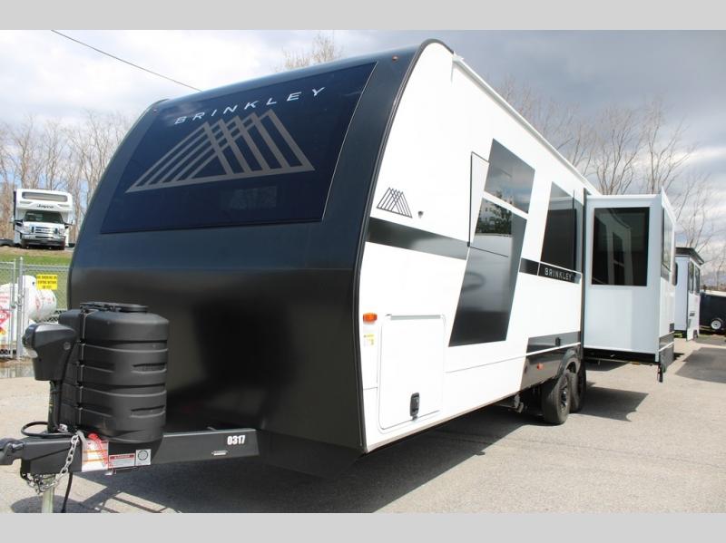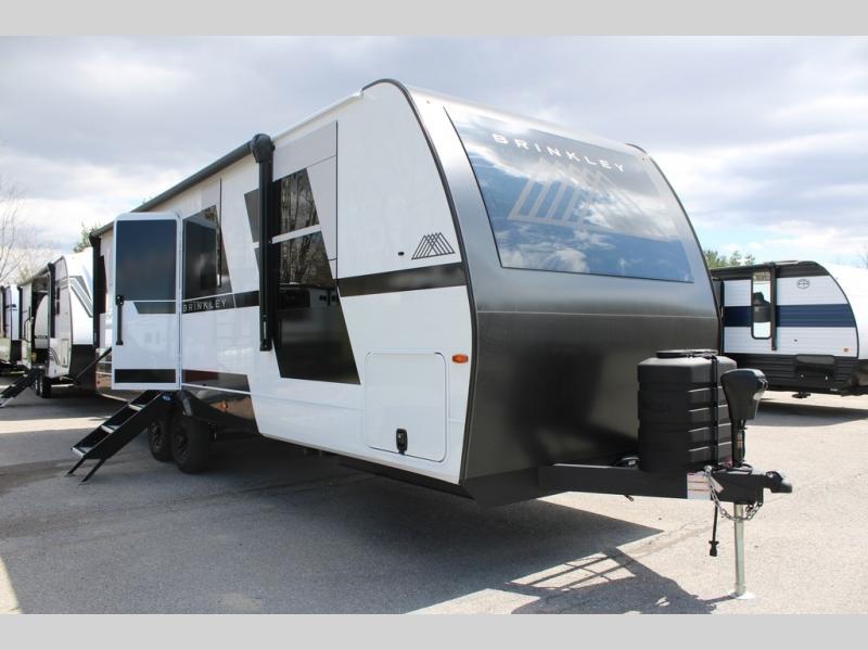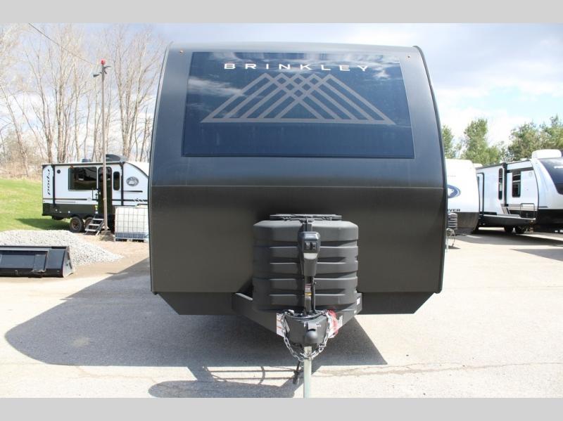 The lightweight Model I travel trailer by Brinkley is the perfect choice for those looking for an easy tow and at-home comforts! There is a drop-frame chassis, high-performance Road Armor suspension equalizer system, and Demco EZ Latch trailer coupler that automatically latches when dropped onto a hitch ball without the need of a safety pin. Additional exterior features include square Euro frameless windows, automotive-grade paint, full-width LED strip lighting in the pass-thru, and a pet & property security campside tie-down to keep your gear and furry friends safe. Inside, you'll be wowed by Brinkley's CraftSense wood trim construction, residential solid surface kitchen countertops, dimmable bedroom lights, and marine-grade neon LED shower lighting to name a few stand-out features!