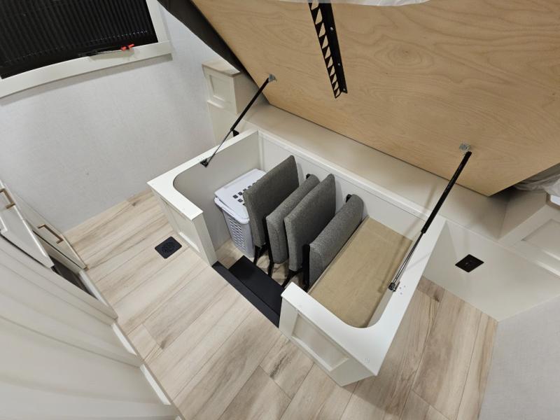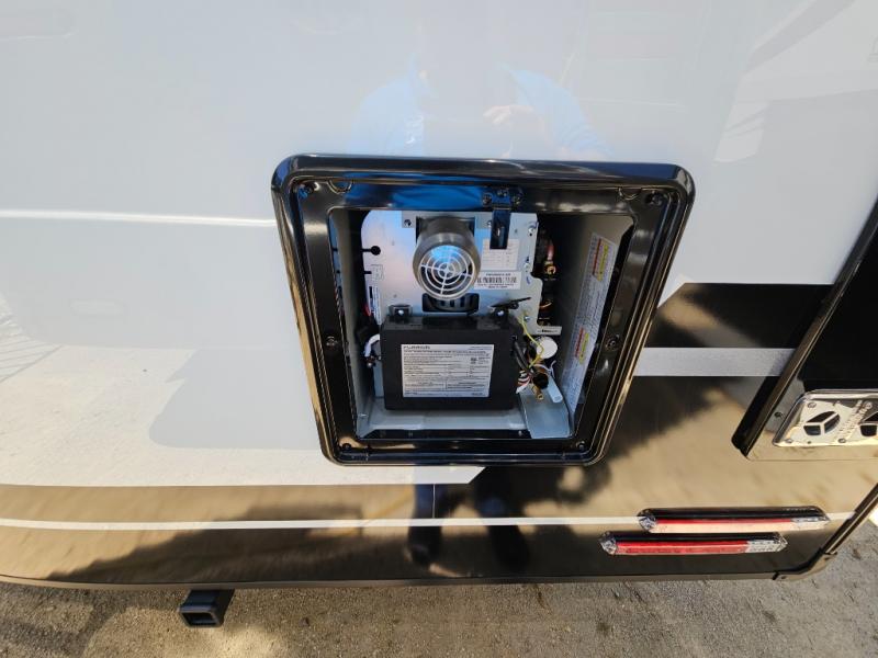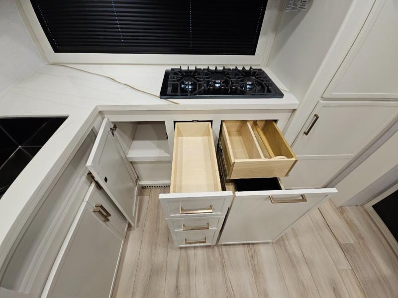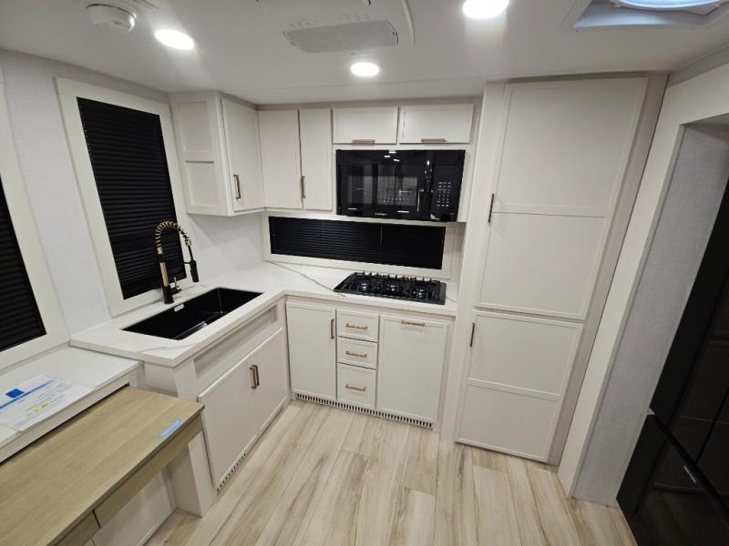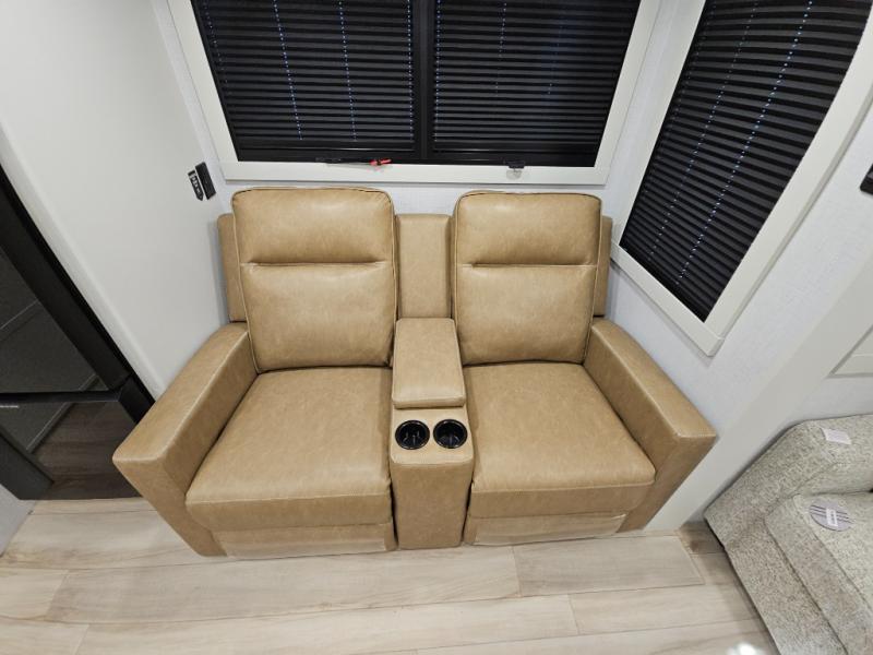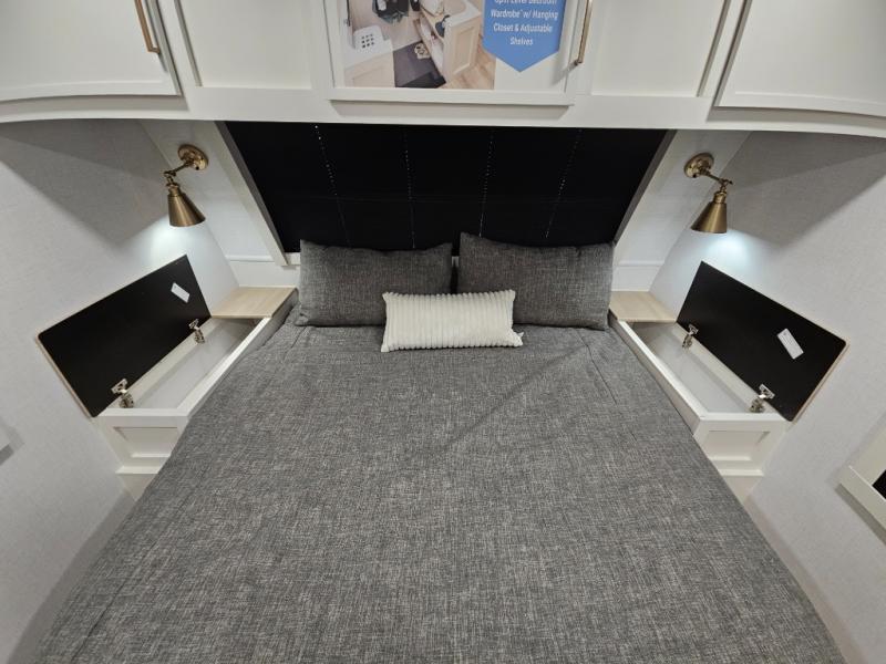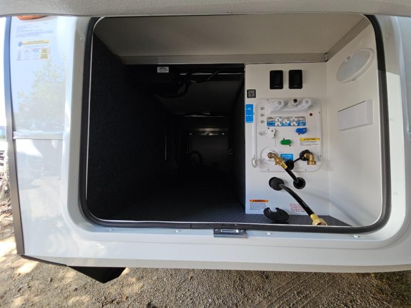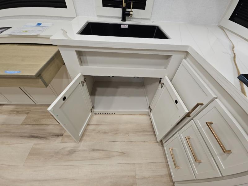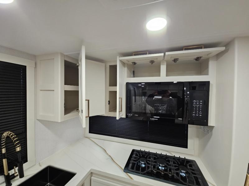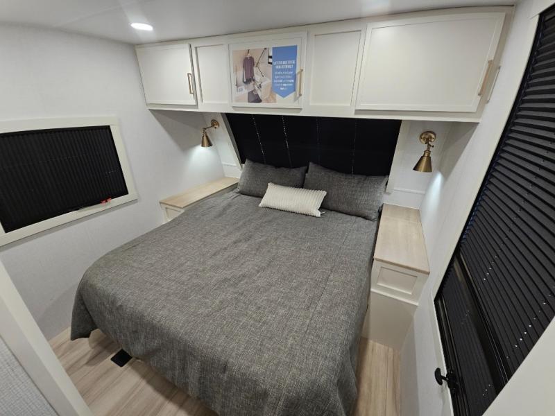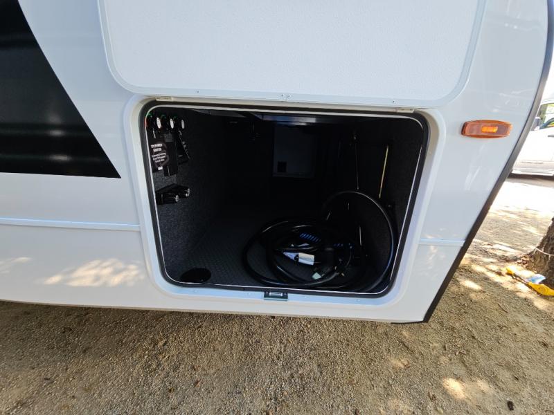 This travel trailer can comfortably sleep four with the king bed in the private bedroom and the tri-fold sofa in the main living area! The full bath features a spacious 42" x 30" shower with a built-in seat and Maxxair fan to name a few comforts. The front private bedroom features a 66" x 80" king bed with a MaxSpace Split-Level Wardrobe underneath to store shoes, clothes, and more! A slide out in the combined living area and rear kitchen makes your space more open, and you'll enjoy relaxing on the theater seating here in the evenings. The full kitchen includes a three burner stovetop, residential 30" convection microwave, 12 cu. ft. 12V refrigerator, plus a trash bin and Stow N' Go paper towel holder for added convenience. You can choose to eat outdoors under the 19' electric awning with LED lights or stay inside to dine at the pull-out dining table with a drawer for added storage!