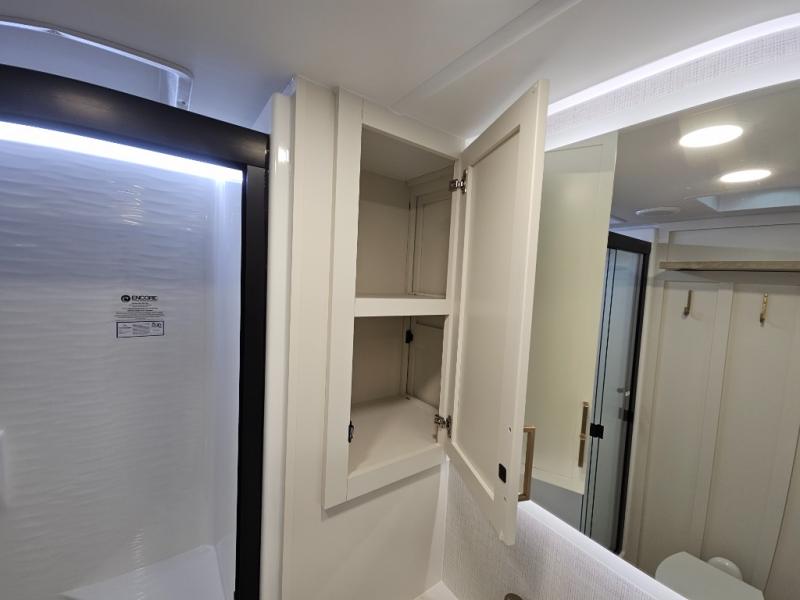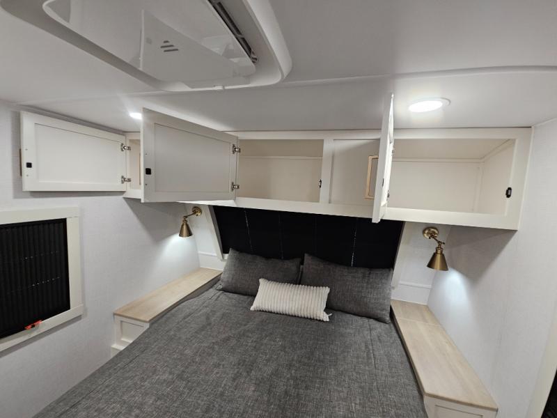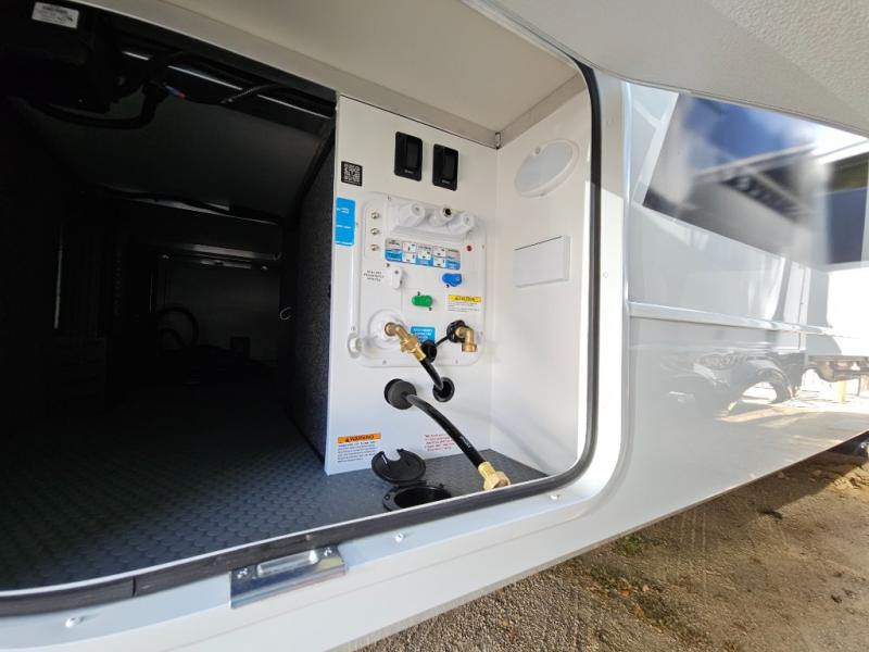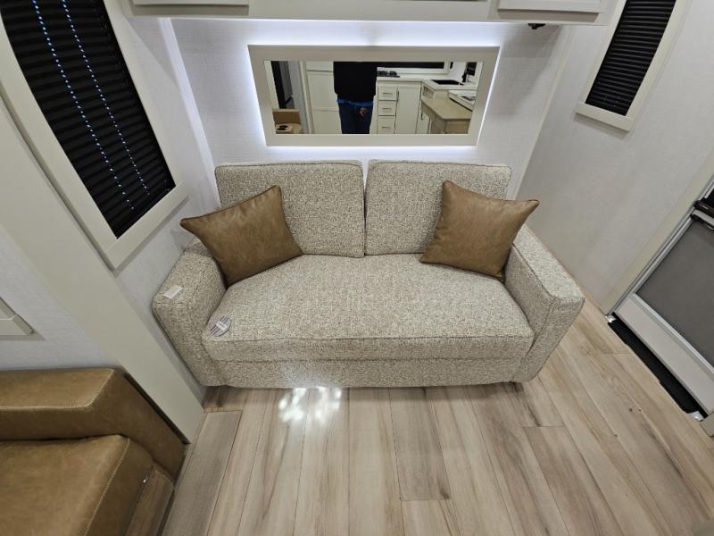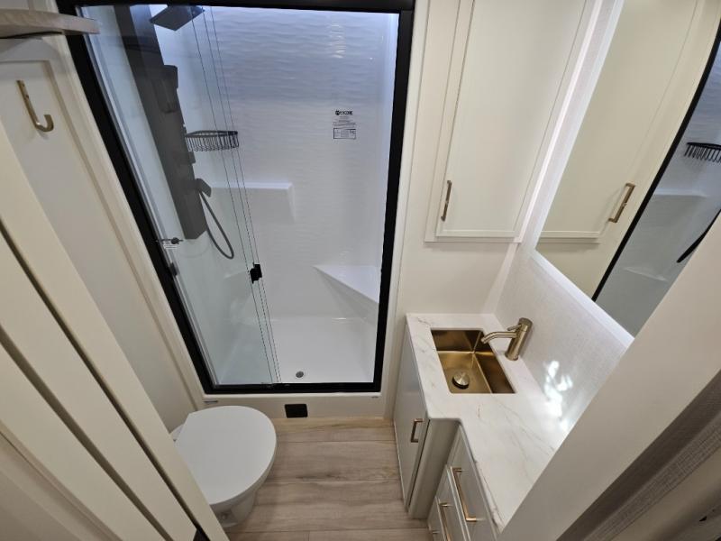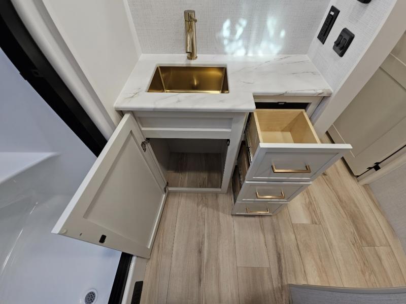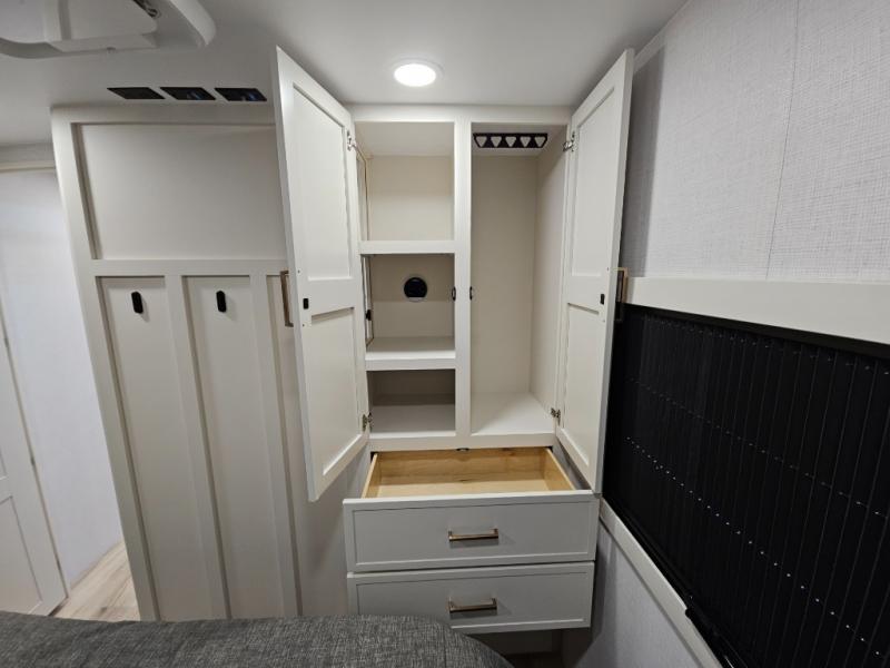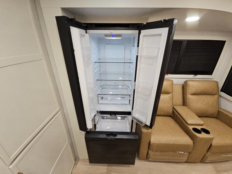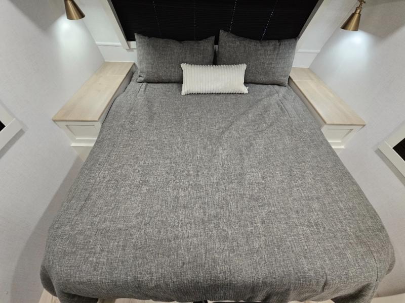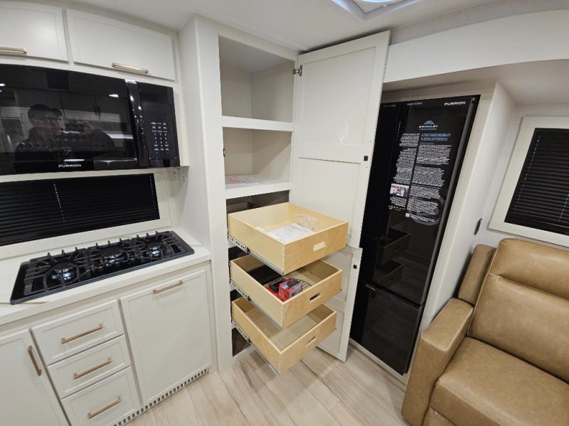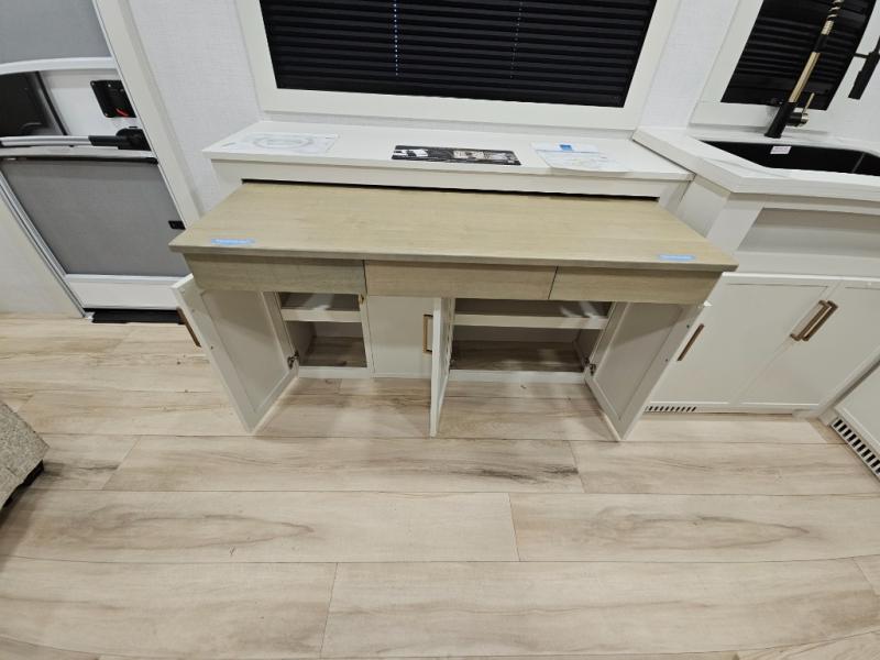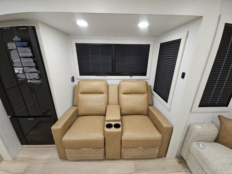 This travel trailer can comfortably sleep four with the king bed in the private bedroom and the tri-fold sofa in the main living area! The full bath features a spacious 42" x 30" shower with a built-in seat and Maxxair fan to name a few comforts. The front private bedroom features a 66" x 80" king bed with a MaxSpace Split-Level Wardrobe underneath to store shoes, clothes, and more! A slide out in the combined living area and rear kitchen makes your space more open, and you'll enjoy relaxing on the theater seating here in the evenings. The full kitchen includes a three burner stovetop, residential 30" convection microwave, 12 cu. ft. 12V refrigerator, plus a trash bin and Stow N' Go paper towel holder for added convenience. You can choose to eat outdoors under the 19' electric awning with LED lights or stay inside to dine at the pull-out dining table with a drawer for added storage!