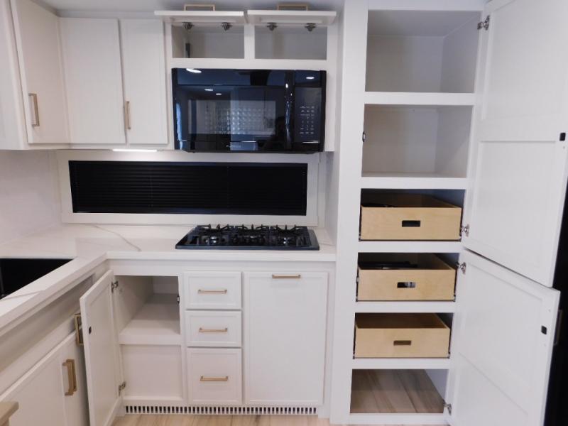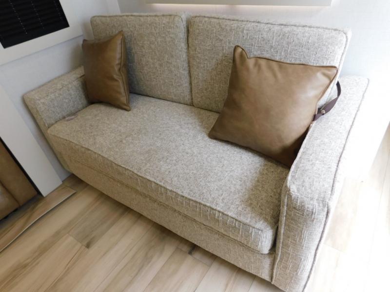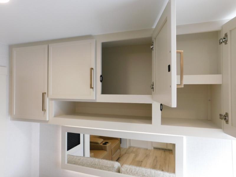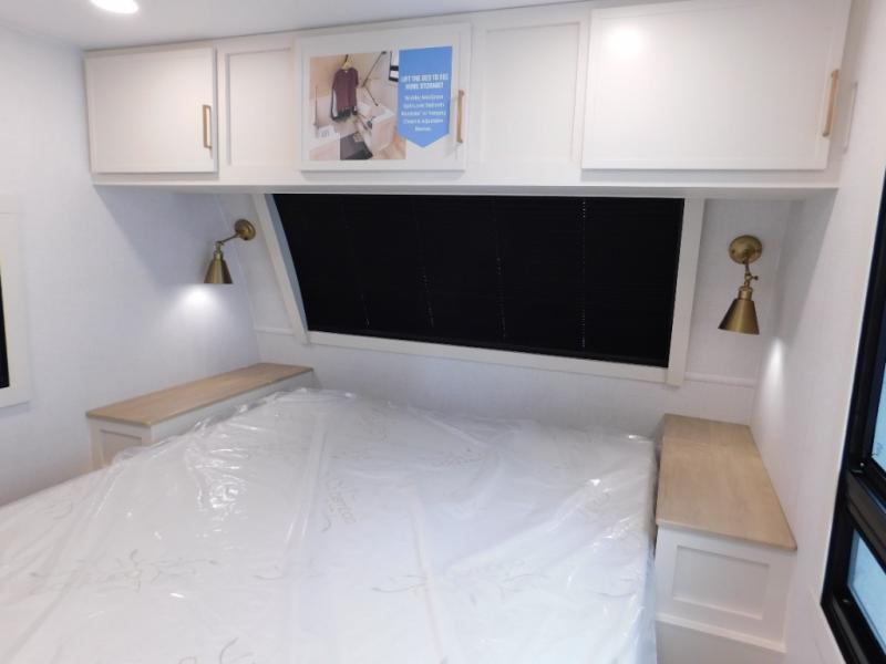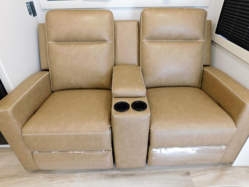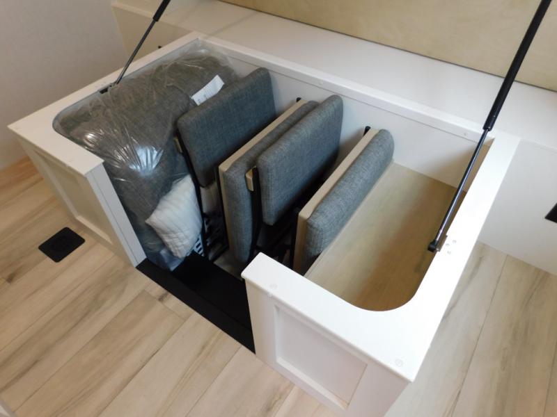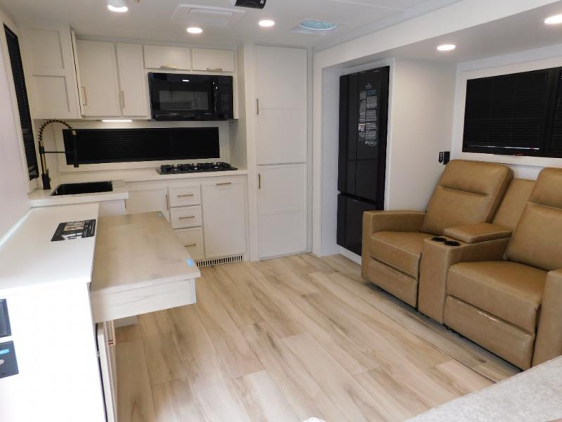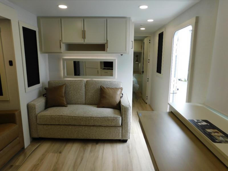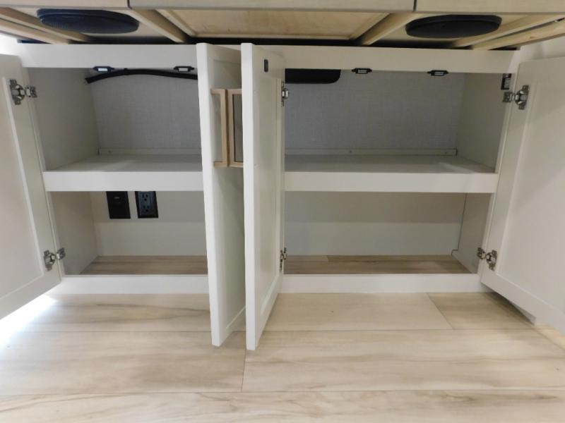 This travel trailer can comfortably sleep four with the king bed in the private bedroom and the tri-fold sofa in the main living area! The full bath features a spacious 42" x 30" shower with a built-in seat and Maxxair fan to name a few comforts. The front private bedroom features a 66" x 80" king bed with a MaxSpace Split-Level Wardrobe underneath to store shoes, clothes, and more! A slide out in the combined living area and rear kitchen makes your space more open, and you'll enjoy relaxing on the theater seating here in the evenings. The full kitchen includes a three burner stovetop, residential 30" convection microwave, 12 cu. ft. 12V refrigerator, plus a trash bin and Stow N' Go paper towel holder for added convenience. You can choose to eat outdoors under the 19' electric awning with LED lights or stay inside to dine at the pull-out dining table with a drawer for added storage!