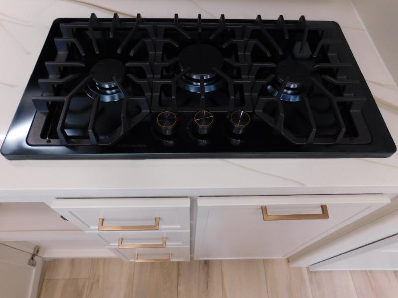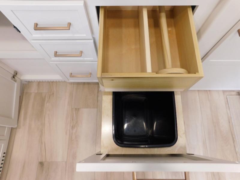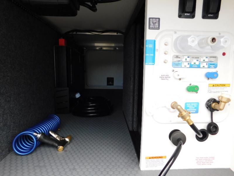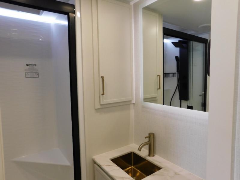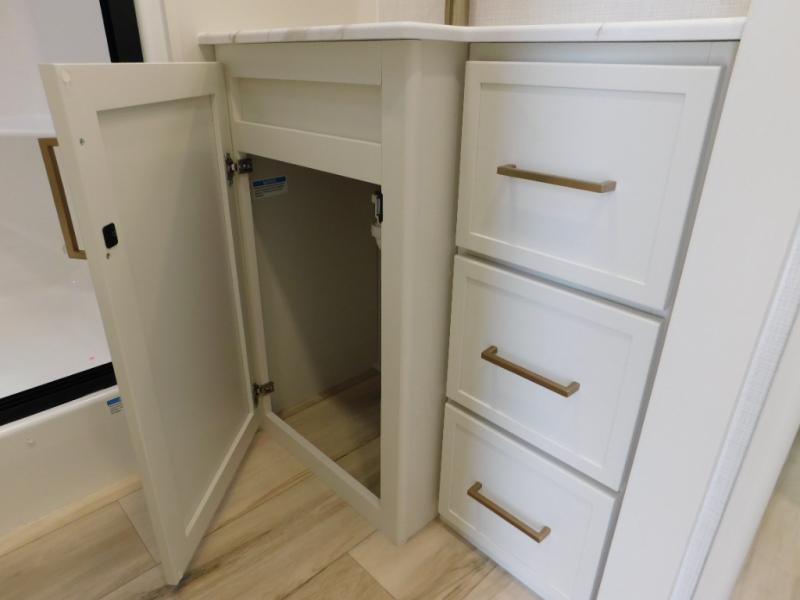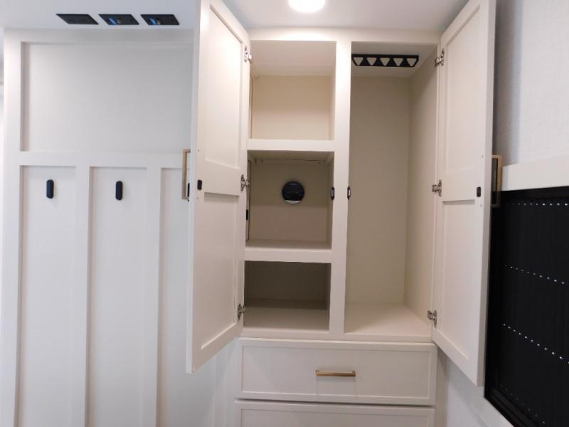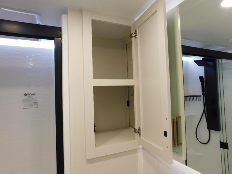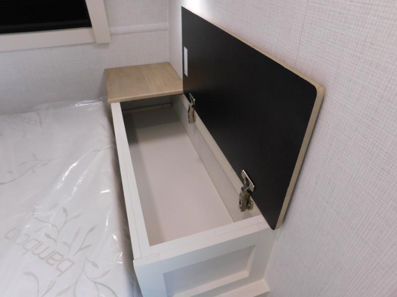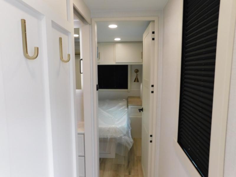 This travel trailer can comfortably sleep four with the king bed in the private bedroom and the tri-fold sofa in the main living area! The full bath features a spacious 42" x 30" shower with a built-in seat and Maxxair fan to name a few comforts. The front private bedroom features a 66" x 80" king bed with a MaxSpace Split-Level Wardrobe underneath to store shoes, clothes, and more! A slide out in the combined living area and rear kitchen makes your space more open, and you'll enjoy relaxing on the theater seating here in the evenings. The full kitchen includes a three burner stovetop, residential 30" convection microwave, 12 cu. ft. 12V refrigerator, plus a trash bin and Stow N' Go paper towel holder for added convenience. You can choose to eat outdoors under the 19' electric awning with LED lights or stay inside to dine at the pull-out dining table with a drawer for added storage!