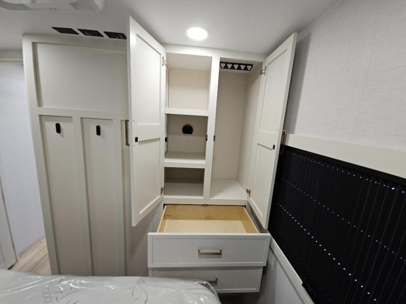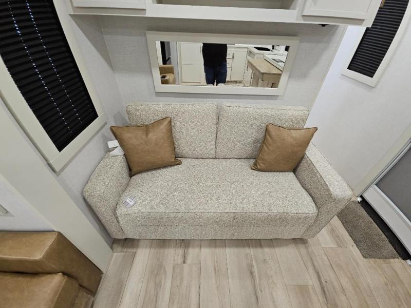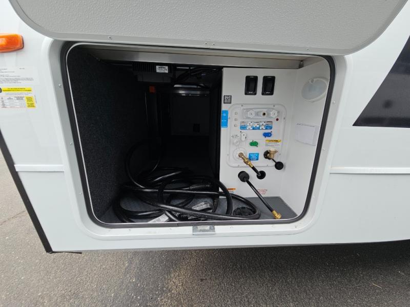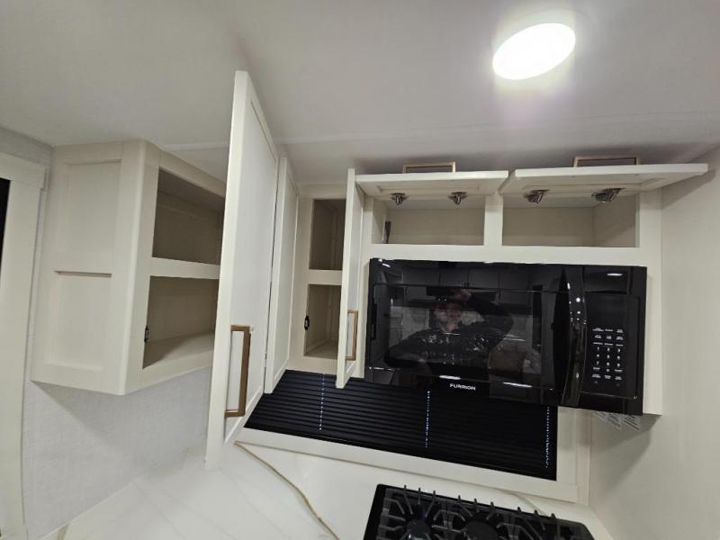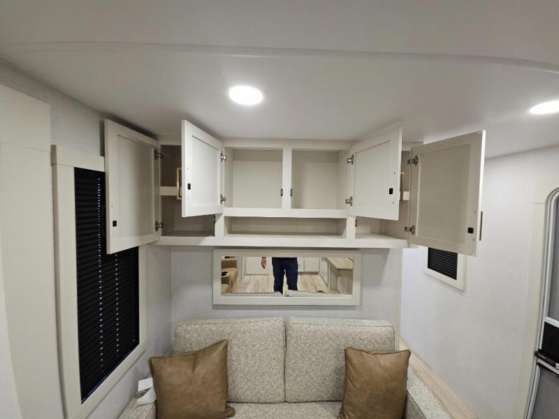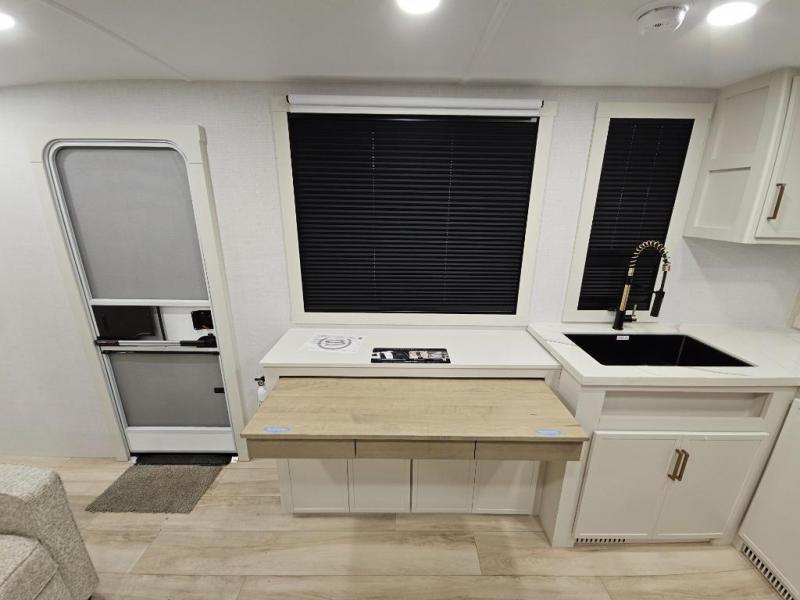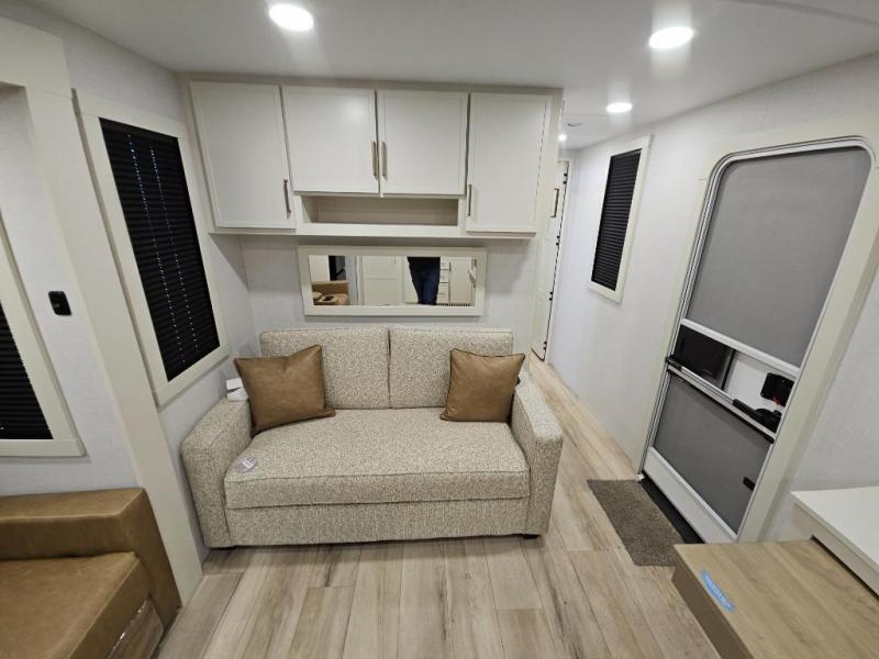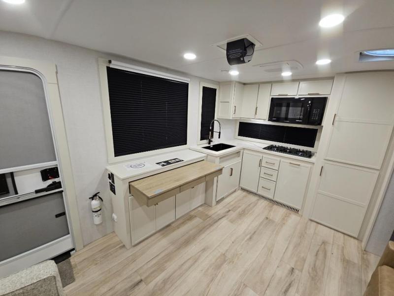 This travel trailer can comfortably sleep four with the king bed in the private bedroom and the tri-fold sofa in the main living area! The full bath features a spacious 42" x 30" shower with a built-in seat and Maxxair fan to name a few comforts. The front private bedroom features a 66" x 80" king bed with a MaxSpace Split-Level Wardrobe underneath to store shoes, clothes, and more! A slide out in the combined living area and rear kitchen makes your space more open, and you'll enjoy relaxing on the theater seating here in the evenings. The full kitchen includes a three burner stovetop, residential 30" convection microwave, 12 cu. ft. 12V refrigerator, plus a trash bin and Stow N' Go paper towel holder for added convenience. You can choose to eat outdoors under the 19' electric awning with LED lights or stay inside to dine at the pull-out dining table with a drawer for added storage!