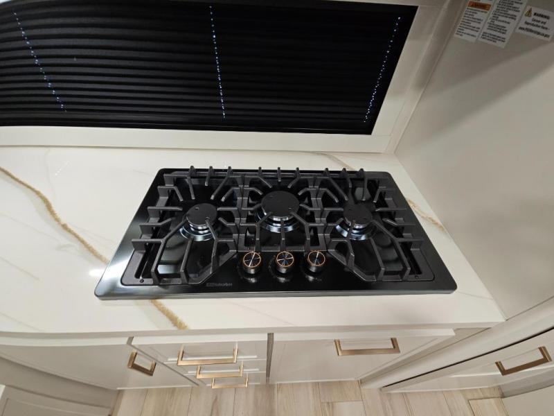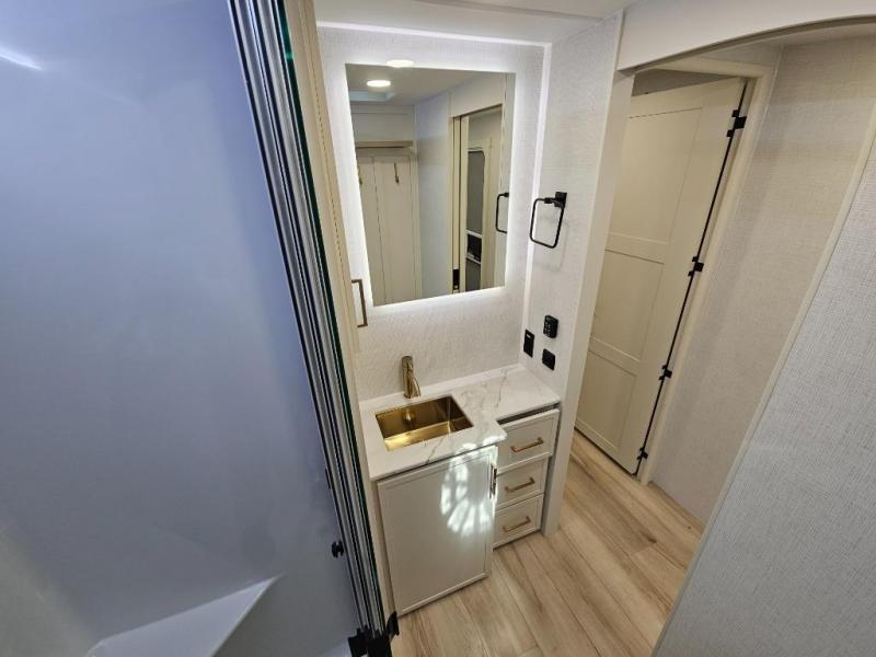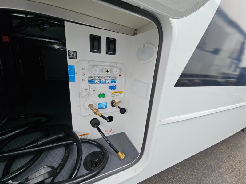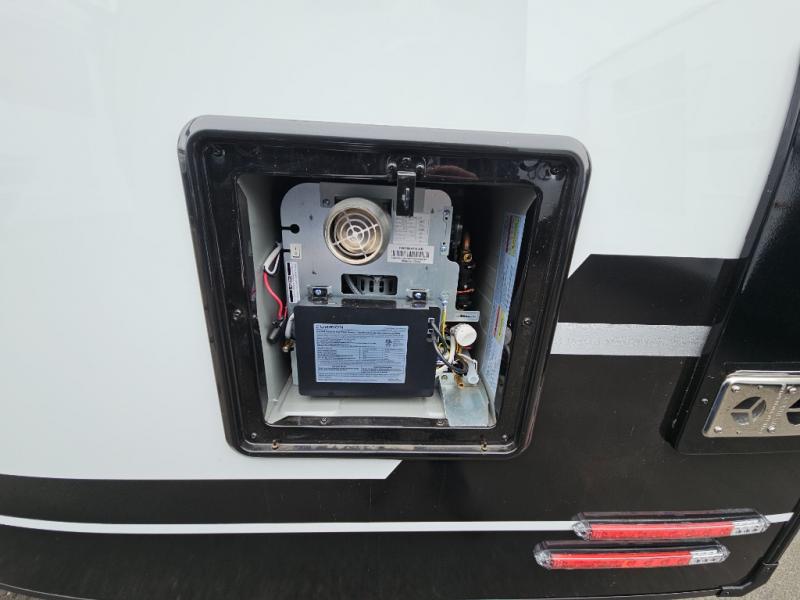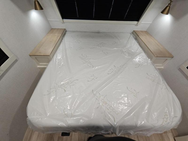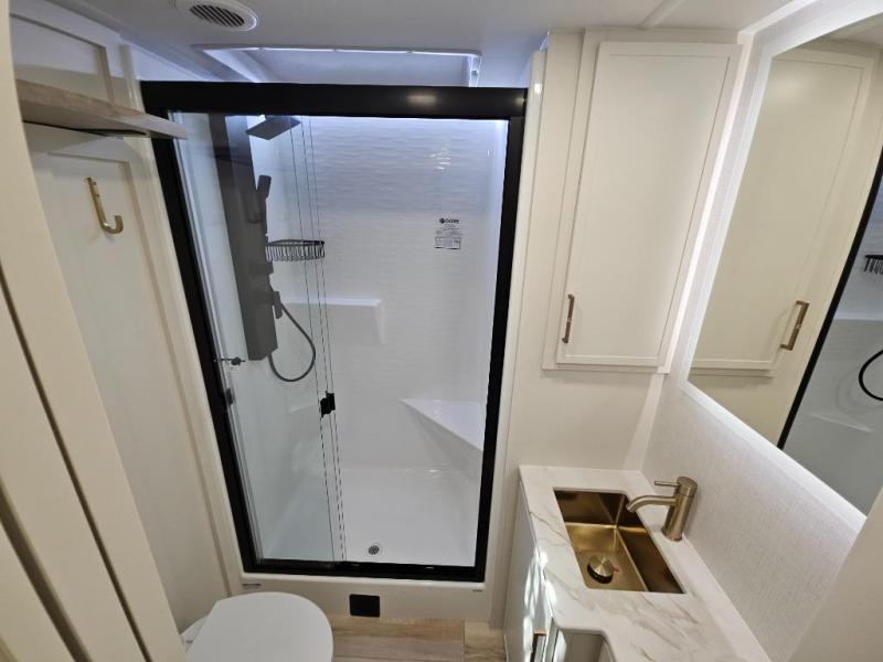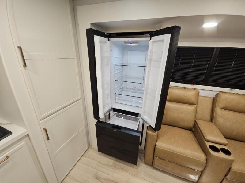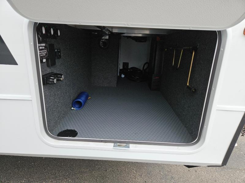 This travel trailer can comfortably sleep four with the king bed in the private bedroom and the tri-fold sofa in the main living area! The full bath features a spacious 42" x 30" shower with a built-in seat and Maxxair fan to name a few comforts. The front private bedroom features a 66" x 80" king bed with a MaxSpace Split-Level Wardrobe underneath to store shoes, clothes, and more! A slide out in the combined living area and rear kitchen makes your space more open, and you'll enjoy relaxing on the theater seating here in the evenings. The full kitchen includes a three burner stovetop, residential 30" convection microwave, 12 cu. ft. 12V refrigerator, plus a trash bin and Stow N' Go paper towel holder for added convenience. You can choose to eat outdoors under the 19' electric awning with LED lights or stay inside to dine at the pull-out dining table with a drawer for added storage!