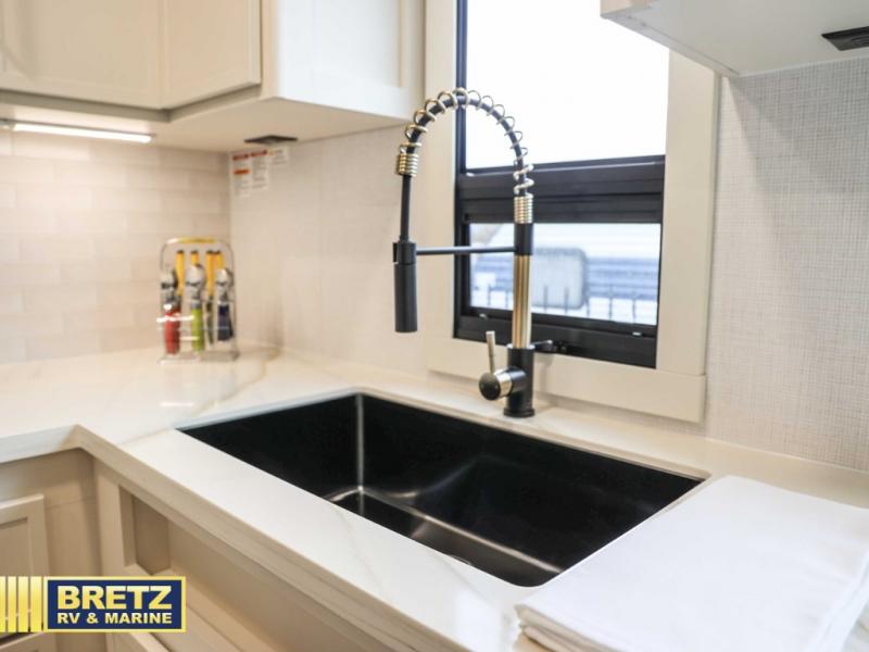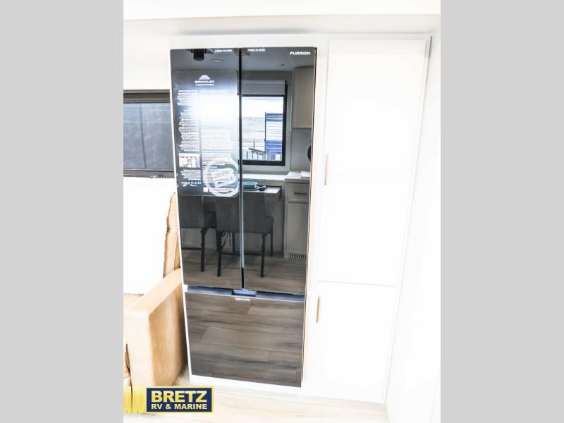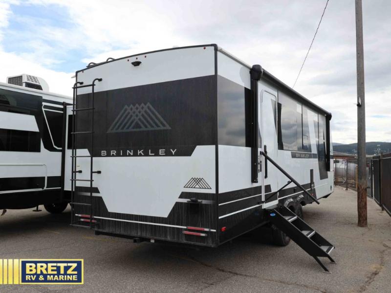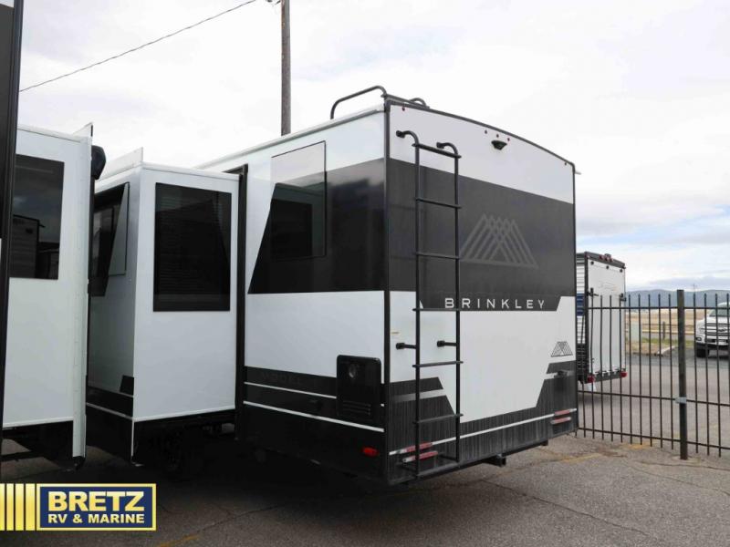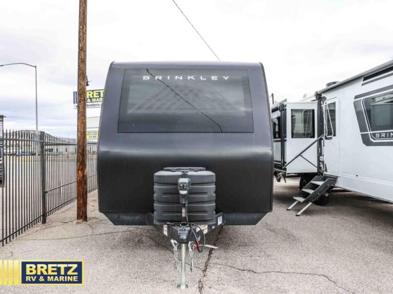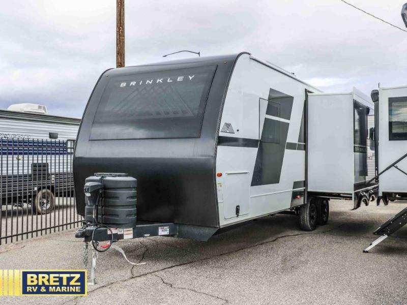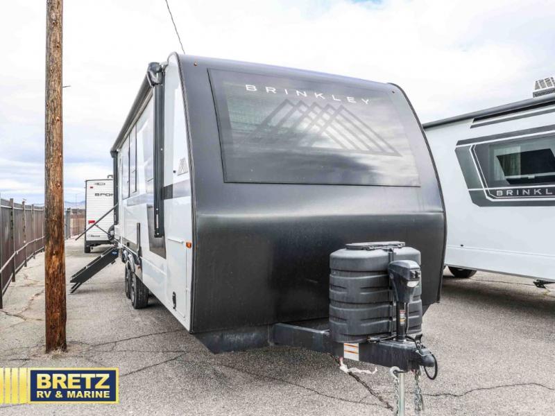 The lightweight Model I travel trailer by Brinkley is the perfect choice for those looking for an easy tow and at-home comforts! There is a drop-frame chassis, high-performance Road Armor suspension equalizer system, and Demco EZ Latch trailer coupler that automatically latches when dropped onto a hitch ball without the need of a safety pin. Additional exterior features include square Euro frameless windows, automotive-grade paint, full-width LED strip lighting in the pass-thru, and a pet & property security campside tie-down to keep your gear and furry friends safe. Inside, you'll be wowed by Brinkley's CraftSense wood trim construction, residential solid surface kitchen countertops, dimmable bedroom lights, and marine-grade neon LED shower lighting to name a few stand-out features!