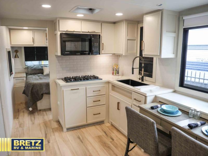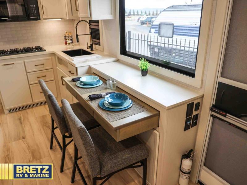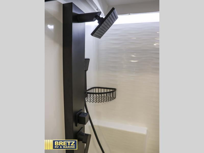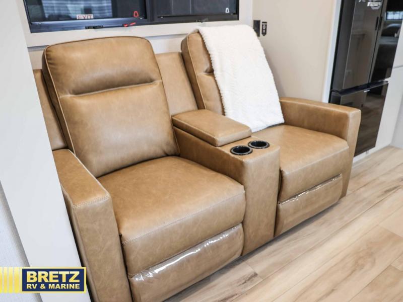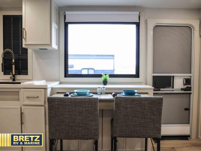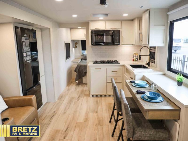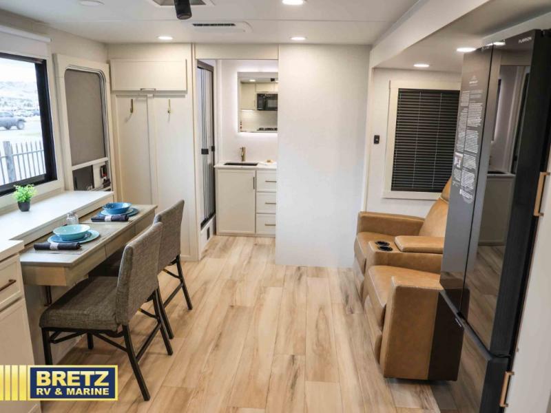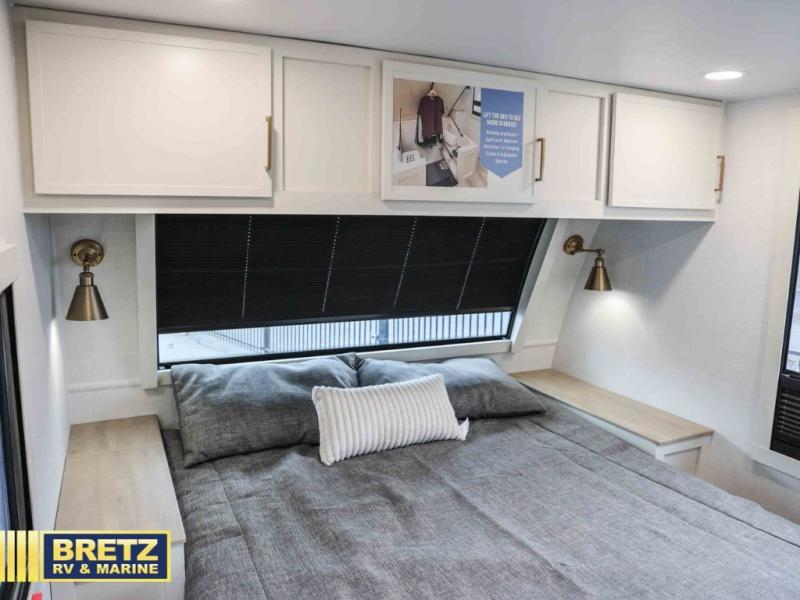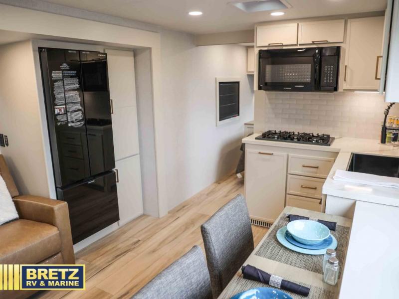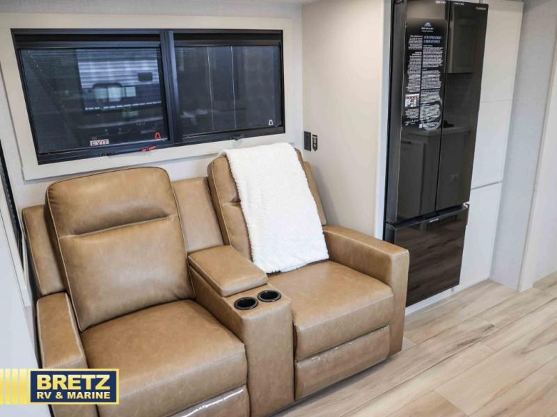 One look at this travel trailer and you'll be sold! The full rear bath features a spacious 42" x 30" shower with a built-in seat and Maxxair fan to name a few comforts. The front private bedroom features a 66" x 80" king bed with a MaxSpace Split-Level Wardrobe underneath to store shoes, clothes, and more! A slide out in the combined living area and kitchen makes your space more open, and you'll enjoy relaxing on the theater seating here in the evenings. The full kitchen includes a three burner stovetop, residential 30" convection microwave, 12 cu. ft. 12V refrigerator, plus a trash bin and Stow N' Go paper towel holder for added convenience. You can choose to eat outdoors under the 19' electric awning with LED lights or stay inside to dine at the pull-out dining table with a drawer for added storage! And if you're needing more sleeping space, just choose the optional tri-fold sofa in place of the theater seating!