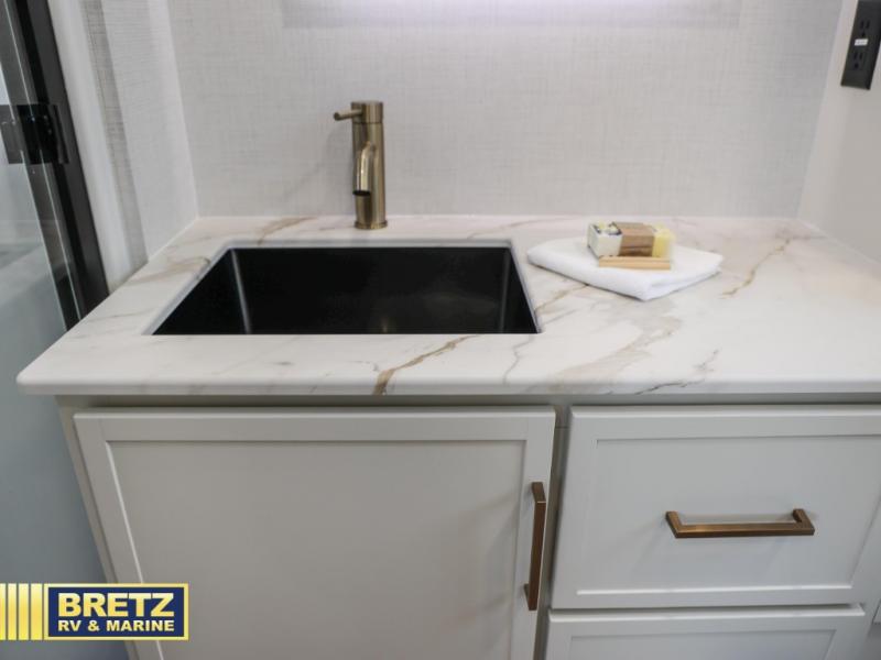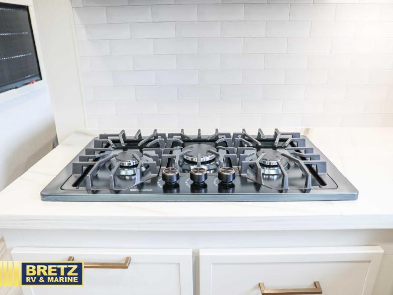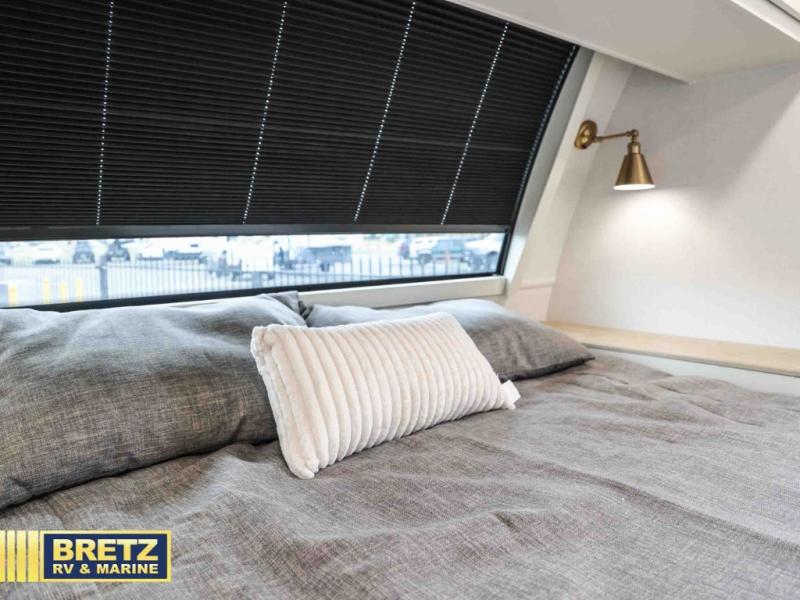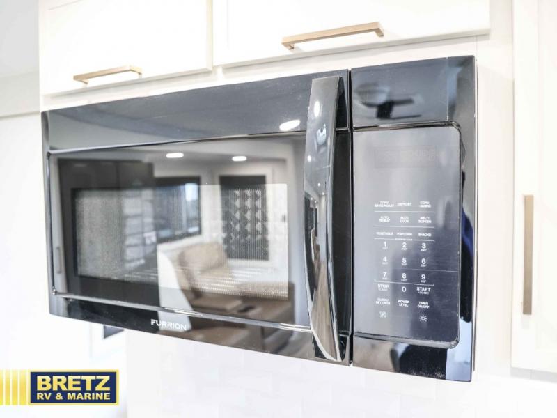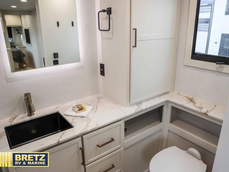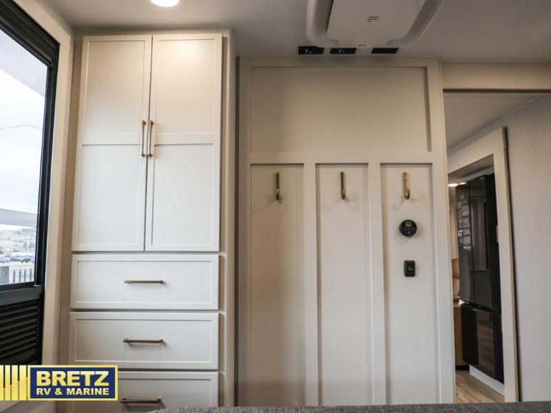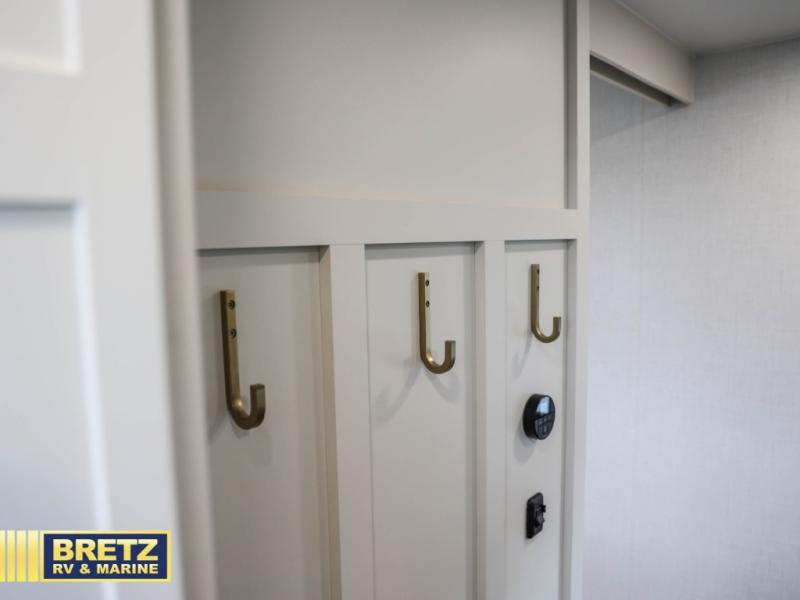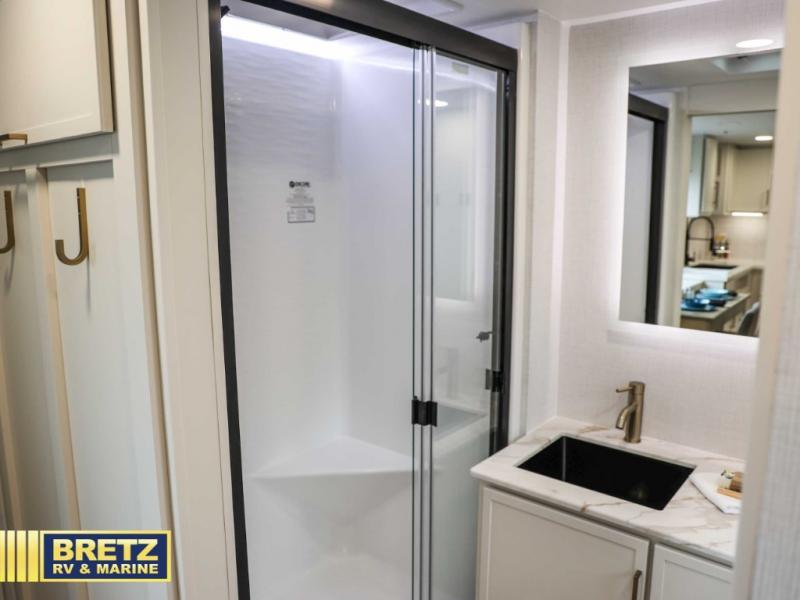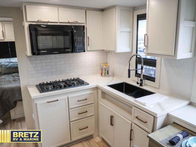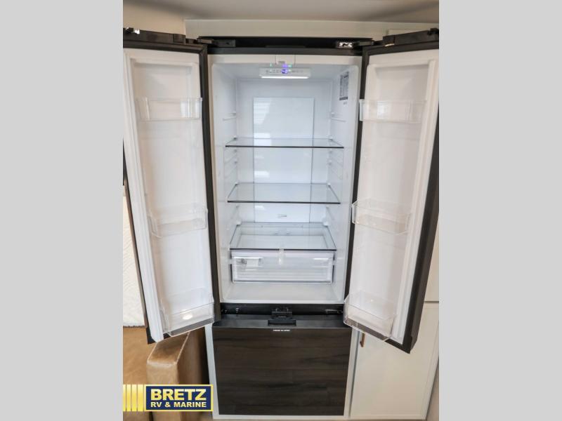 One look at this travel trailer and you'll be sold! The full rear bath features a spacious 42" x 30" shower with a built-in seat and Maxxair fan to name a few comforts. The front private bedroom features a 66" x 80" king bed with a MaxSpace Split-Level Wardrobe underneath to store shoes, clothes, and more! A slide out in the combined living area and kitchen makes your space more open, and you'll enjoy relaxing on the theater seating here in the evenings. The full kitchen includes a three burner stovetop, residential 30" convection microwave, 12 cu. ft. 12V refrigerator, plus a trash bin and Stow N' Go paper towel holder for added convenience. You can choose to eat outdoors under the 19' electric awning with LED lights or stay inside to dine at the pull-out dining table with a drawer for added storage! And if you're needing more sleeping space, just choose the optional tri-fold sofa in place of the theater seating!
