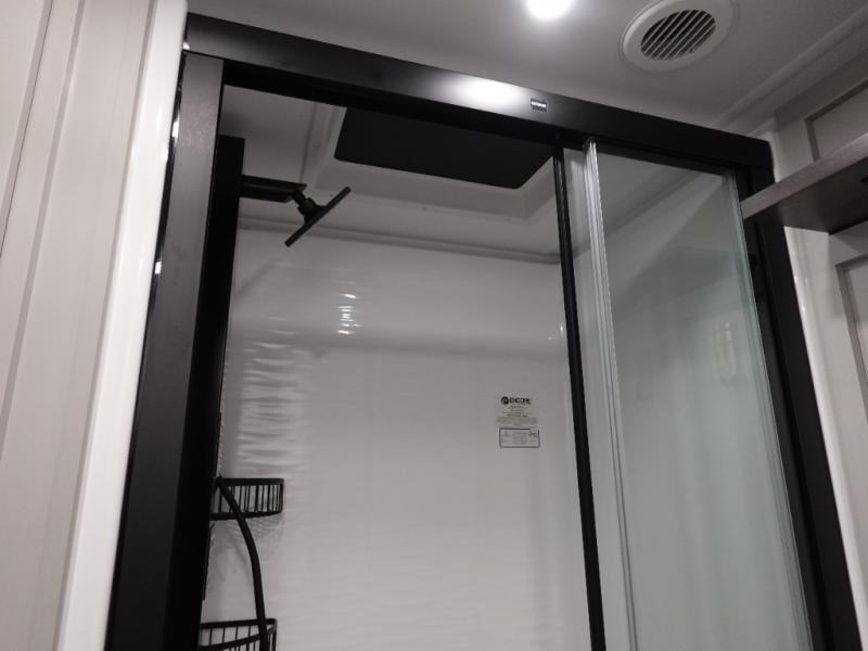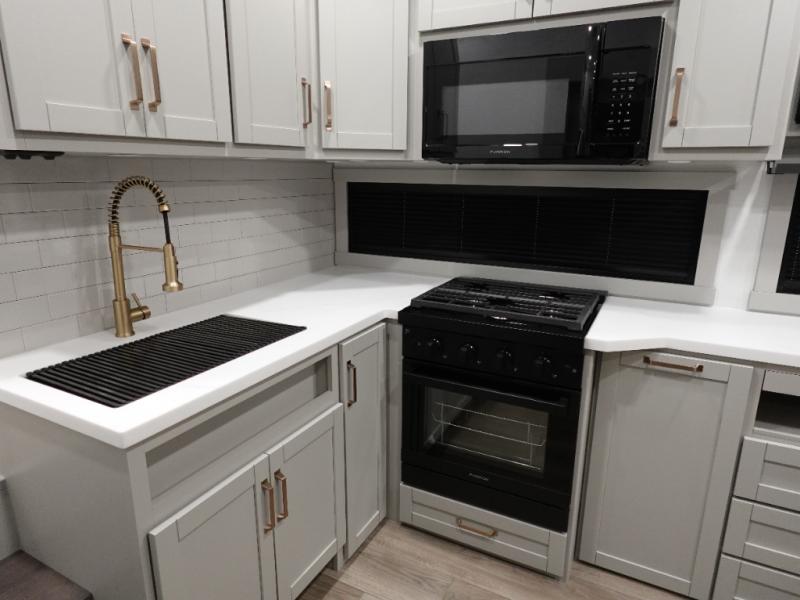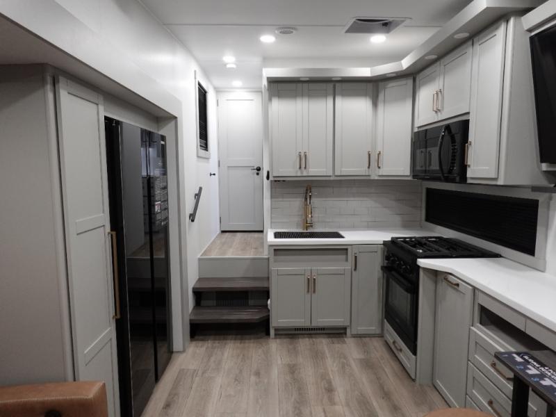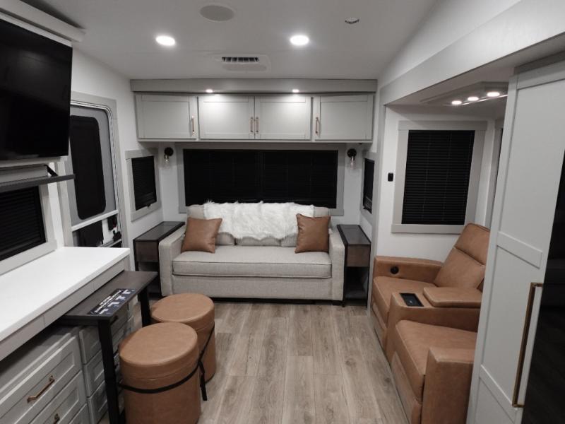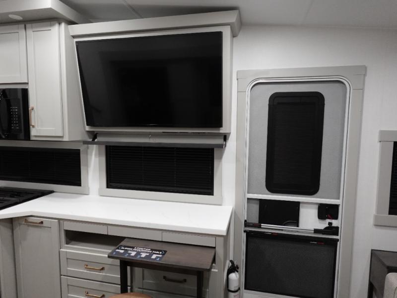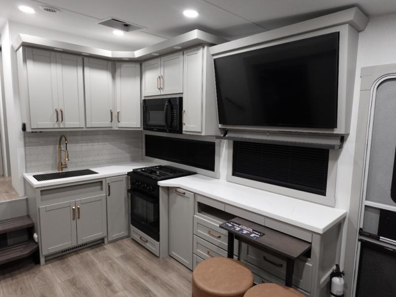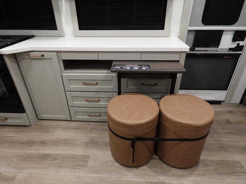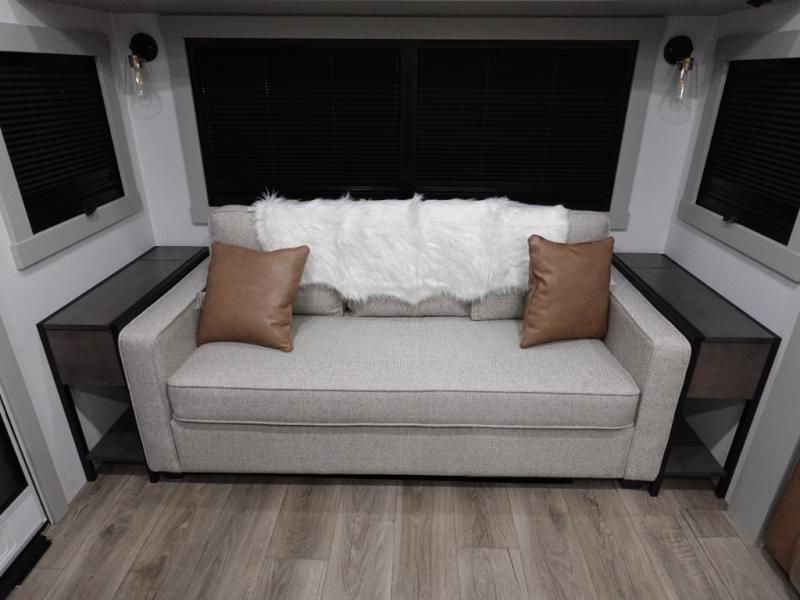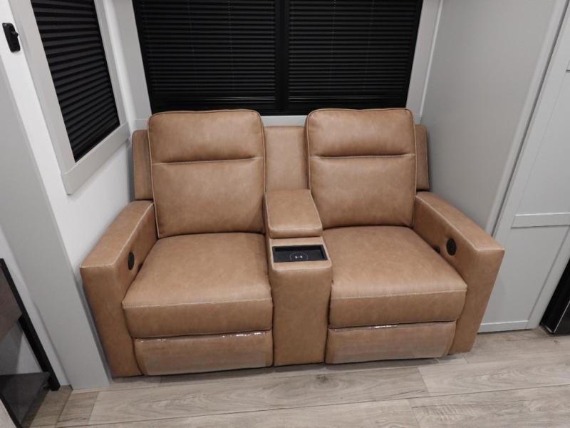 You'll love every minute spent in this luxury fifth wheel! Your crew can get comfortable in the rear living room on the 72" tri-fold sofa that converts to a 62" x 70" bed, or on the theater seating within the slide out. There is also a sliding dining table and a TV with swivel so everyone can have a good view of the movie. A full kitchen, complete with a cooktop, 30" residential microwave, and 16 cu. ft. refrigerator will let you cook and store food, and there is a handy trash bin with a Stow N' Go paper towel holder for easy clean up. The full bath will let you freshen up before heading to bed in the front private bedroom!