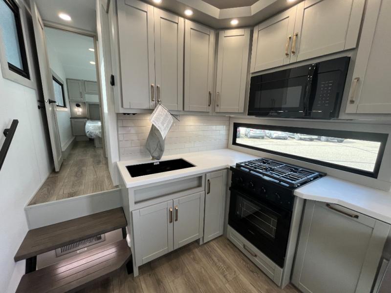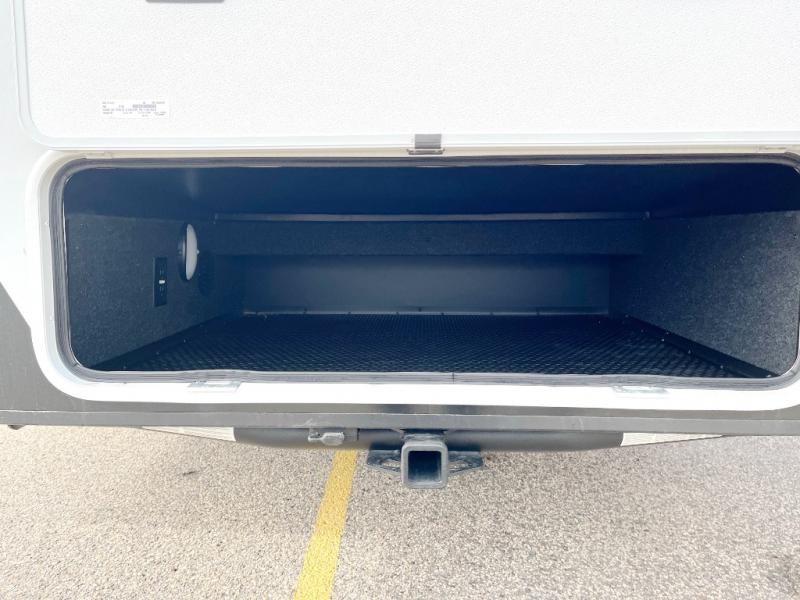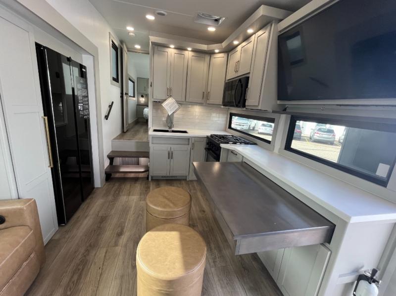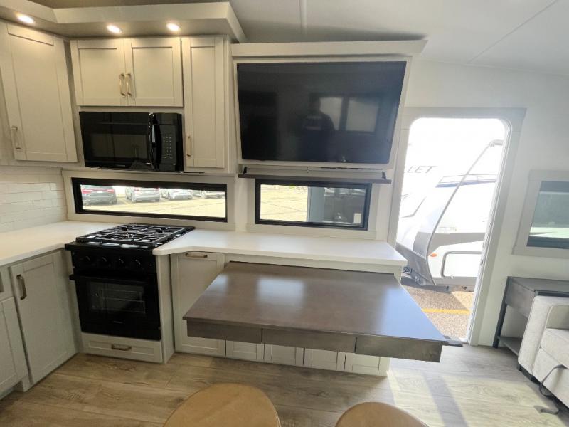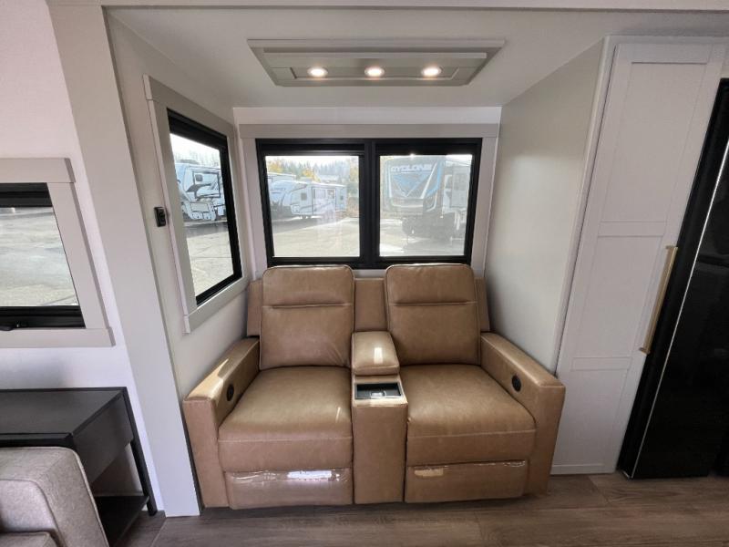 You'll love every minute spent in this luxury fifth wheel! Your crew can get comfortable in the rear living room on the 72" tri-fold sofa that converts to a 62" x 70" bed, or on the theater seating within the slide out. There is also a sliding dining table and a TV with swivel so everyone can have a good view of the movie. A full kitchen, complete with a cooktop, 30" residential microwave, and 16 cu. ft. refrigerator will let you cook and store food, and there is a handy trash bin with a Stow N' Go paper towel holder for easy clean up. The full bath will let you freshen up before heading to bed in the front private bedroom!
