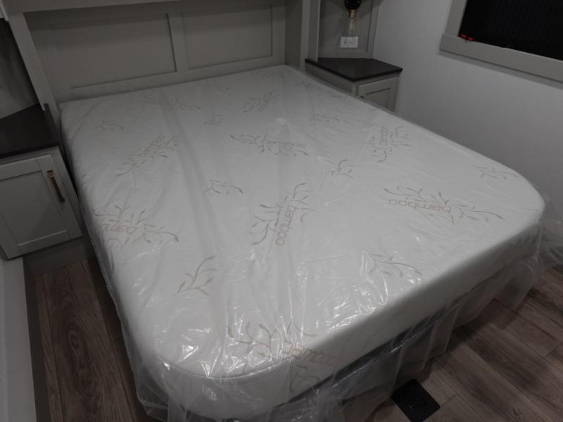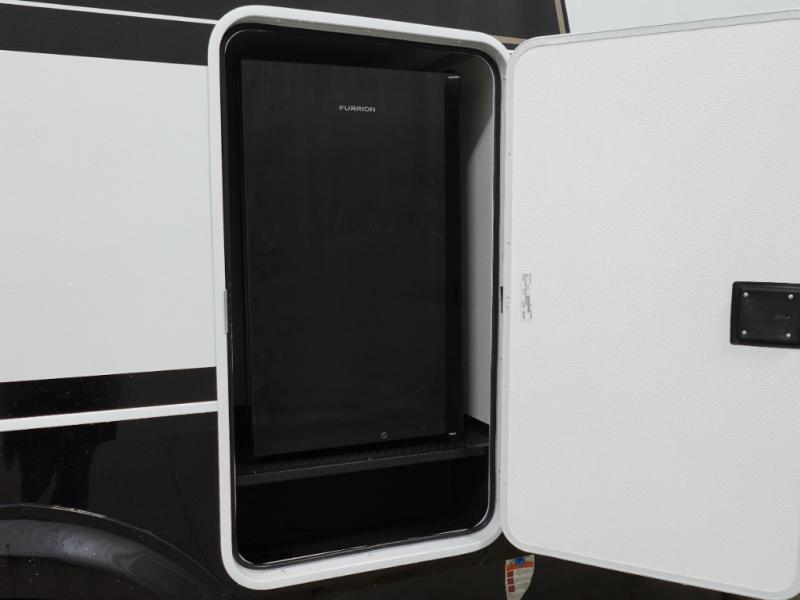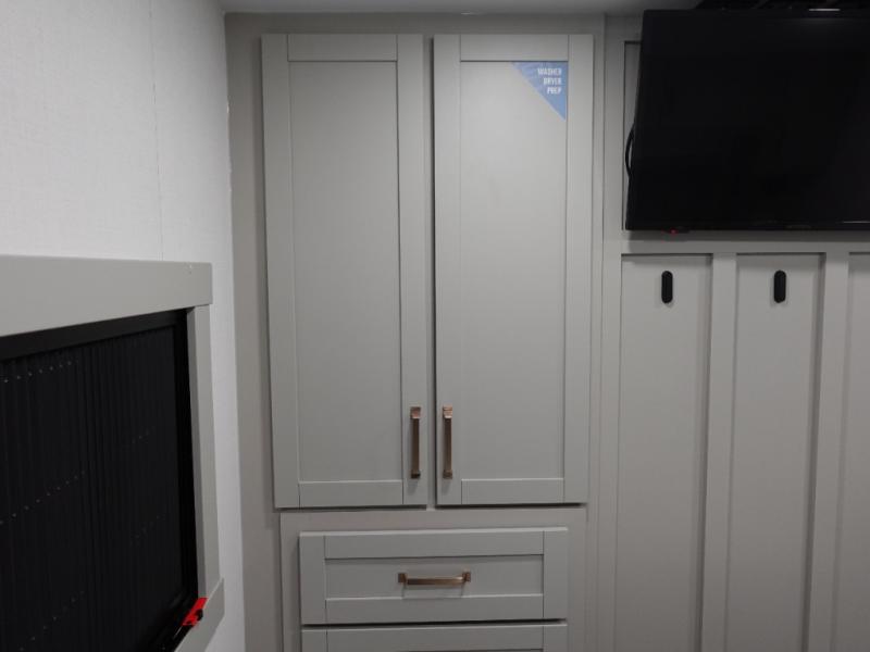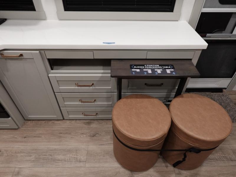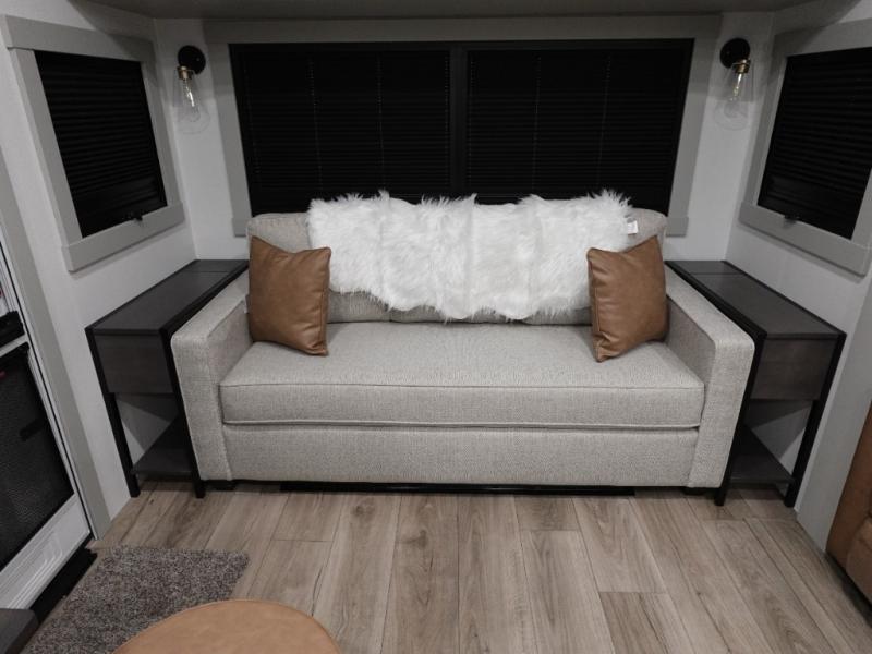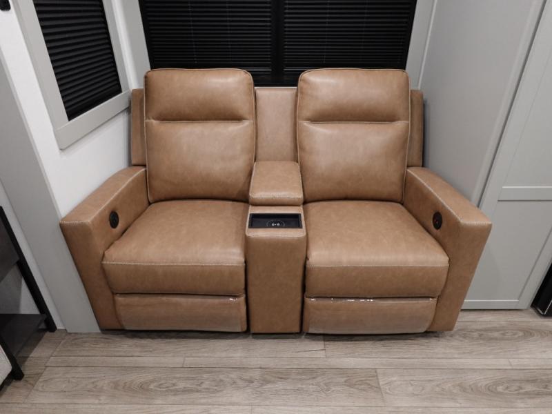 You'll love every minute spent in this luxury fifth wheel! Your crew can get comfortable in the rear living room on the 72" tri-fold sofa that converts to a 62" x 70" bed, or on the theater seating within the slide out. There is also a sliding dining table and a TV with swivel so everyone can have a good view of the movie. A full kitchen, complete with a cooktop, 30" residential microwave, and 16 cu. ft. refrigerator will let you cook and store food, and there is a handy trash bin with a Stow N' Go paper towel holder for easy clean up. The full bath will let you freshen up before heading to bed in the front private bedroom!