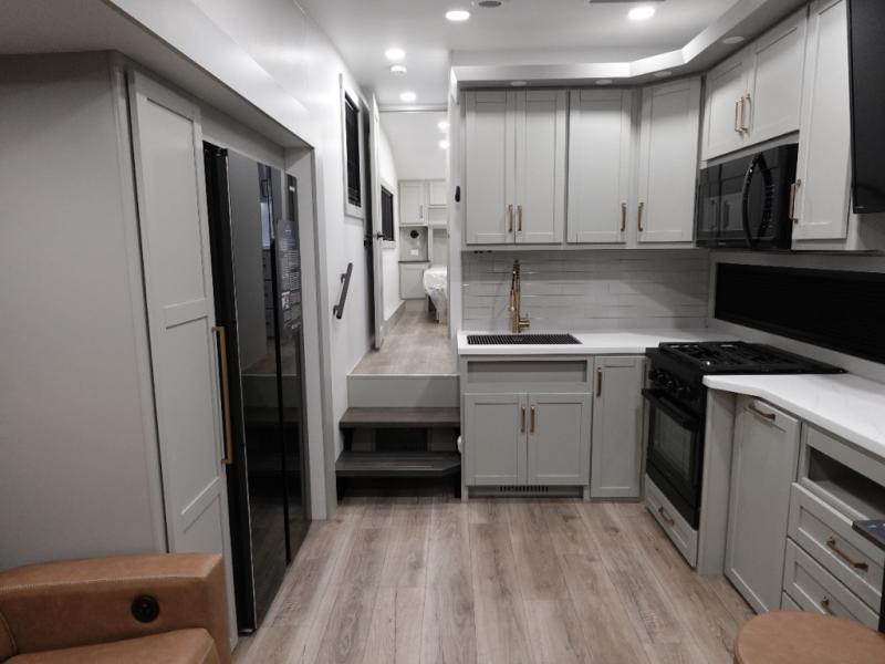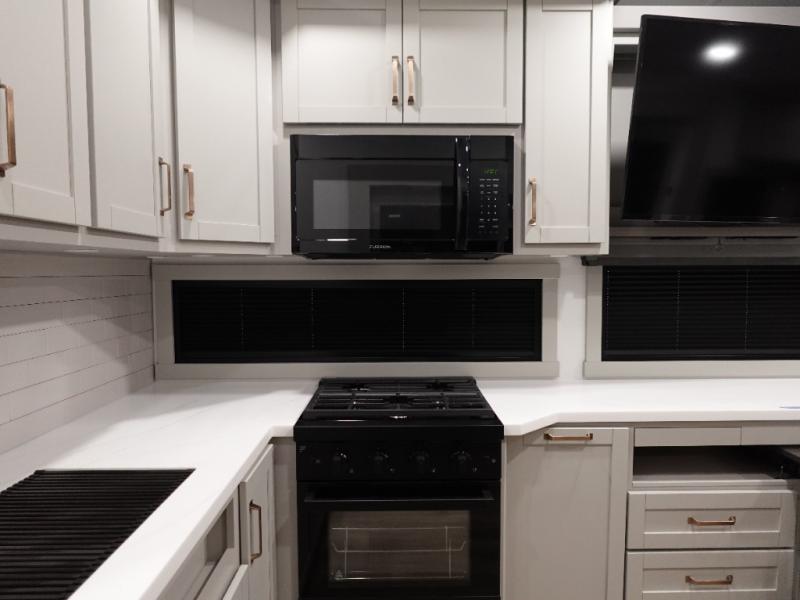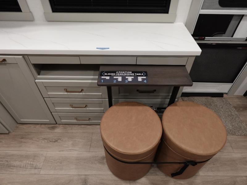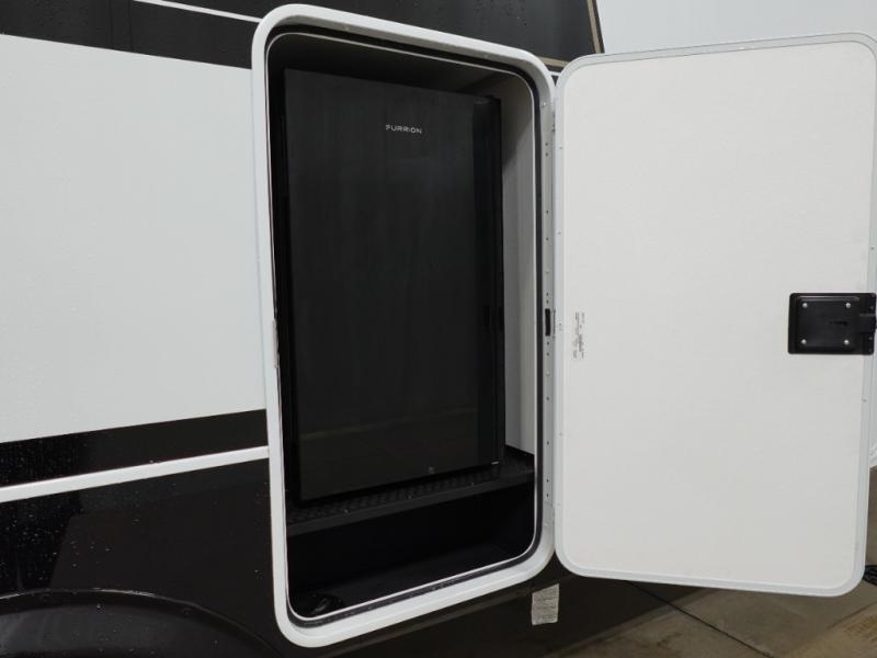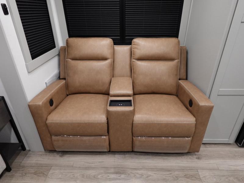 You'll love every minute spent in this luxury fifth wheel! Your crew can get comfortable in the rear living room on the 72" tri-fold sofa that converts to a 62" x 70" bed, or on the theater seating within the slide out. There is also a sliding dining table and a TV with swivel so everyone can have a good view of the movie. A full kitchen, complete with a cooktop, 30" residential microwave, and 16 cu. ft. refrigerator will let you cook and store food, and there is a handy trash bin with a Stow N' Go paper towel holder for easy clean up. The full bath will let you freshen up before heading to bed in the front private bedroom!