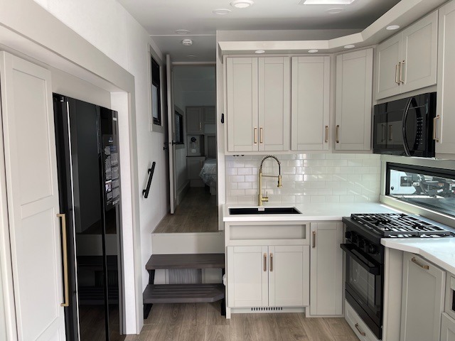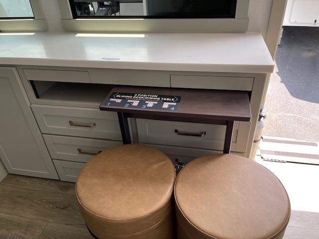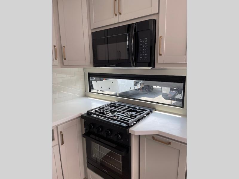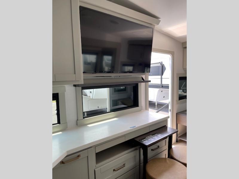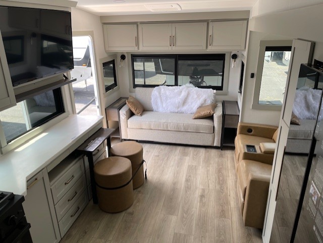 You'll love every minute spent in this luxury fifth wheel! Your crew can get comfortable in the rear living room on the 72" tri-fold sofa that converts to a 62" x 70" bed, or on the theater seating within the slide out. There is also a sliding dining table and a TV with swivel so everyone can have a good view of the movie. A full kitchen, complete with a cooktop, 30" residential microwave, and 16 cu. ft. refrigerator will let you cook and store food, and there is a handy trash bin with a Stow N' Go paper towel holder for easy clean up. The full bath will let you freshen up before heading to bed in the front private bedroom!