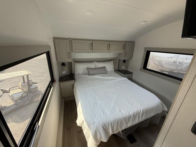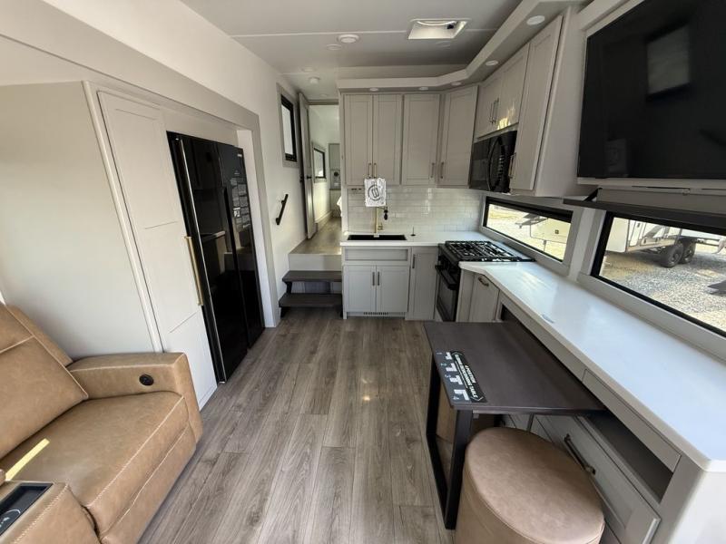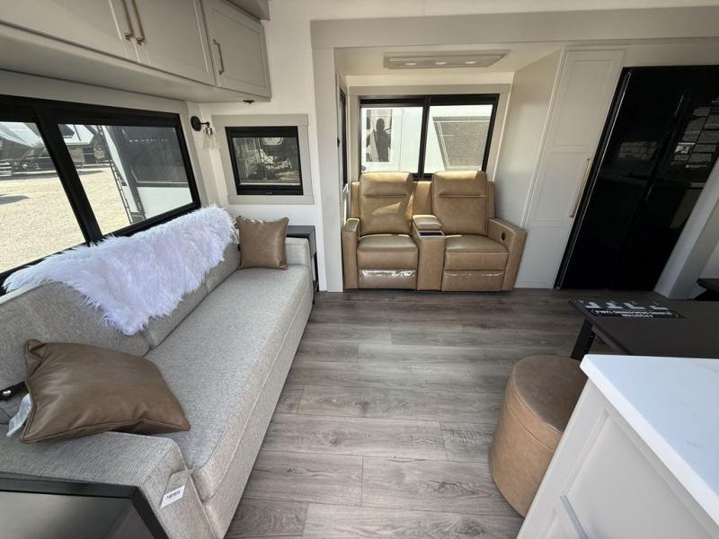 * You'll love every minute spent in this luxury fifth wheel! Your crew can get comfortable in the rear living room on the 72" tri-fold sofa that converts to a 62" x 70" bed, or on the theater seating within the slide out. There is also a sliding dining table and a TV with swivel so everyone can have a good view of the movie. A full kitchen, complete with a cooktop, 30" residential microwave, and 16 cu. ft. refrigerator will let you cook and store food, and there is a handy trash bin with a Stow N' Go paper towel holder for easy clean up. The full bath will let you freshen up before heading to bed in the front private bedroom!