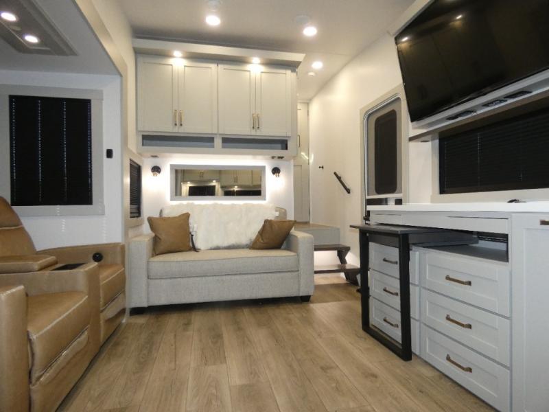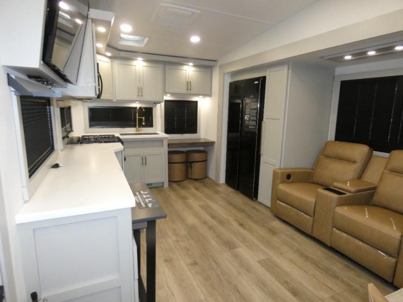 You'll love every minute spent in this spacious fifth wheel that can sleep four each night. There is a front private bedroom with a queen bed and 4x under-bed drawers to keep your space tidy. Your guests can sleep on the tri-fold sofa that extends to a 54" x 70" bed at night. The theater seating sits directly across from the 50" articulating TV for movie nights, and the pantry with drawers is right next to the theater seating for quick access to snacks! The chef of your group is sure to love the kitchen with its ample counter space, 30" residential microwave, and a sliding dining table with a drawer for even more storage. The desk in the back will allow you to get some work done if needed, or you can just spend your days outdoors under the two power awnings. There is also an exterior 12V refrigerator and storage, exterior speakers and controls, and a pass-thru storage for camp gear!