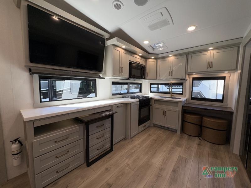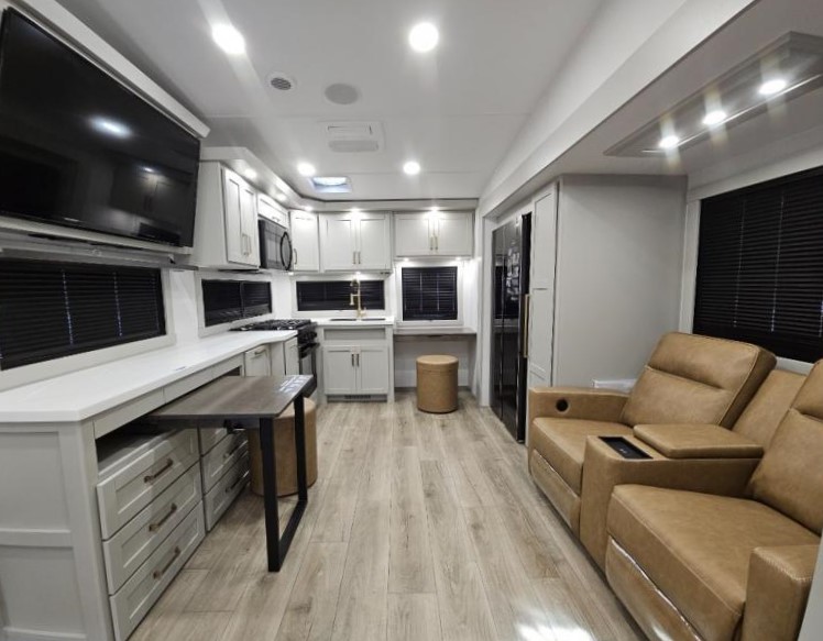 Spacious Living Areas: The interior focus is on providing a comfortable and upscale living experience, with a full kitchen, entertainment systems, and high-quality furnishings.