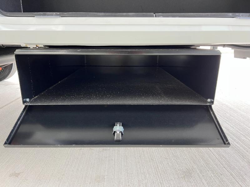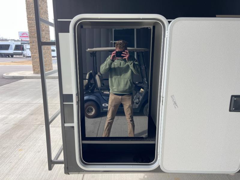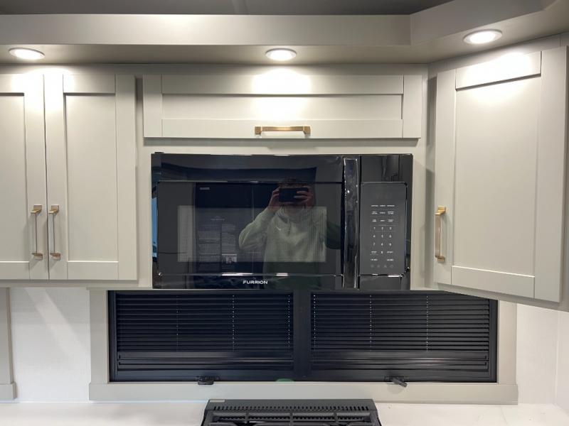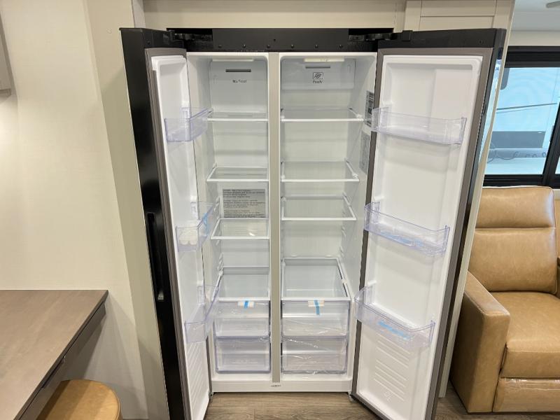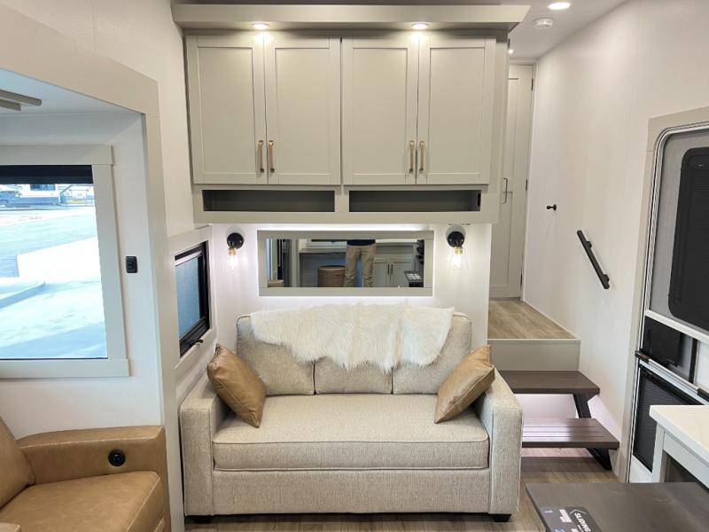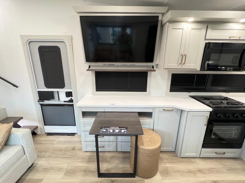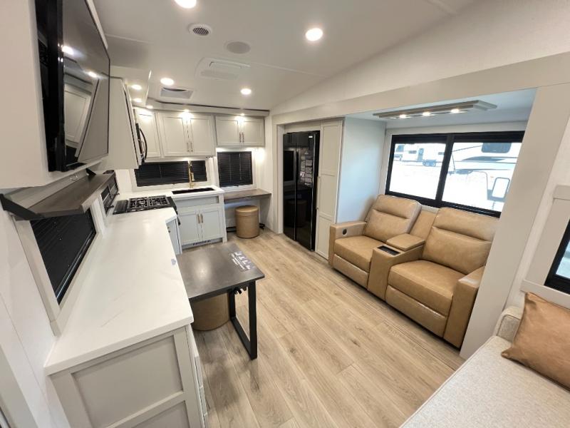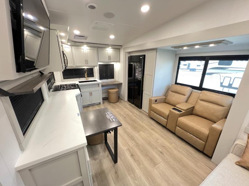 You'll love every minute spent in this spacious fifth wheel that can sleep four each night. There is a front private bedroom with a queen bed and 4x under-bed drawers to keep your space tidy. Your guests can sleep on the tri-fold sofa that extends to a 54" x 70" bed at night. The theater seating sits directly across from the 50" articulating TV for movie nights, and the pantry with drawers is right next to the theater seating for quick access to snacks! The chef of your group is sure to love the kitchen with its ample counter space, 30" residential microwave, and a sliding dining table with a drawer for even more storage. The desk in the back will allow you to get some work done if needed, or you can just spend your days outdoors under the two power awnings. There is also an exterior 12V refrigerator and storage, exterior speakers and controls, and a pass-thru storage for camp gear!