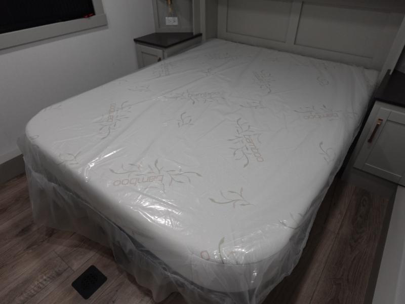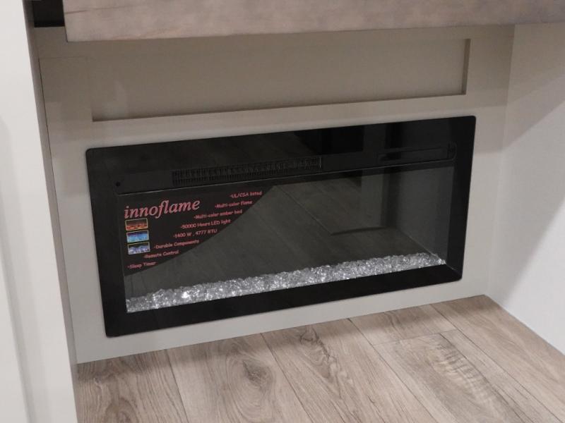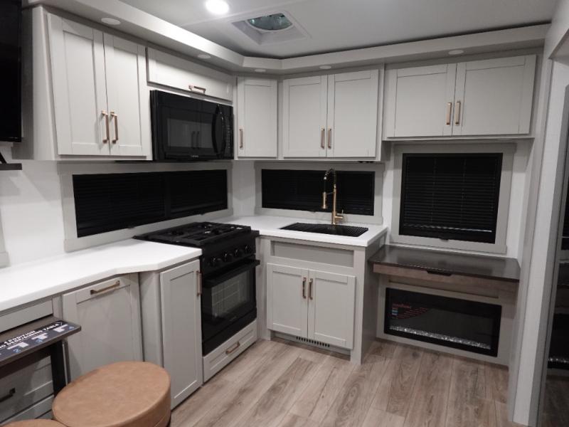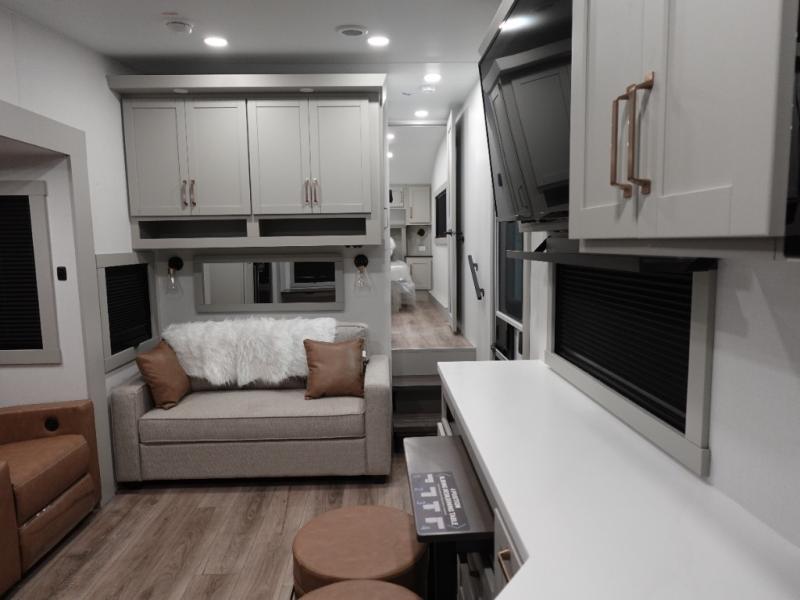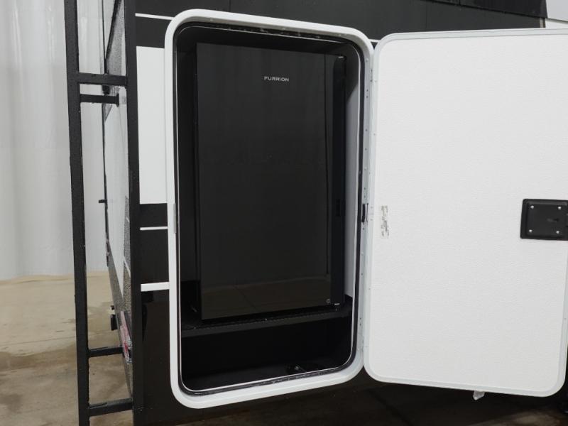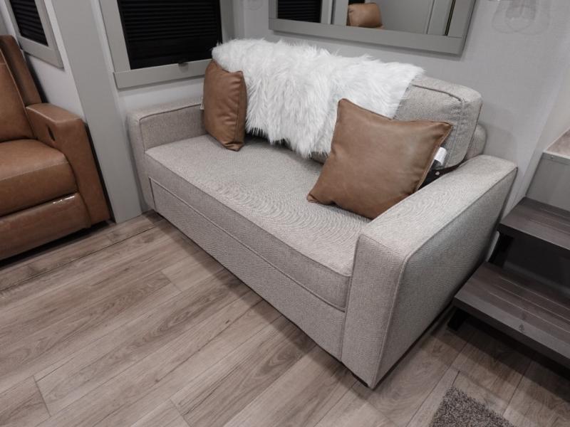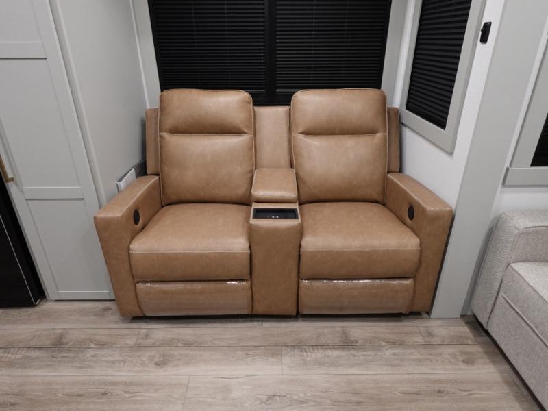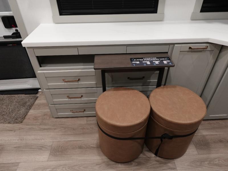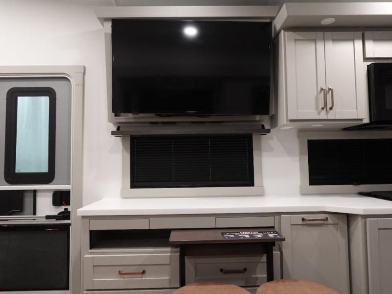 You'll love every minute spent in this spacious fifth wheel that can sleep four each night. There is a front private bedroom with a queen bed and 4x under-bed drawers to keep your space tidy. Your guests can sleep on the tri-fold sofa that extends to a 54" x 70" bed at night. The theater seating sits directly across from the 50" articulating TV for movie nights, and the pantry with drawers is right next to the theater seating for quick access to snacks! The chef of your group is sure to love the kitchen with its ample counter space, 30" residential microwave, and a sliding dining table with a drawer for even more storage. The desk in the back will allow you to get some work done if needed, or you can just spend your days outdoors under the two power awnings. There is also an exterior 12V refrigerator and storage, exterior speakers and controls, and a pass-thru storage for camp gear!