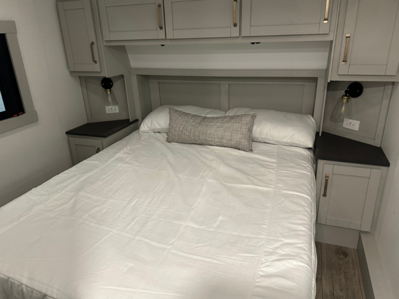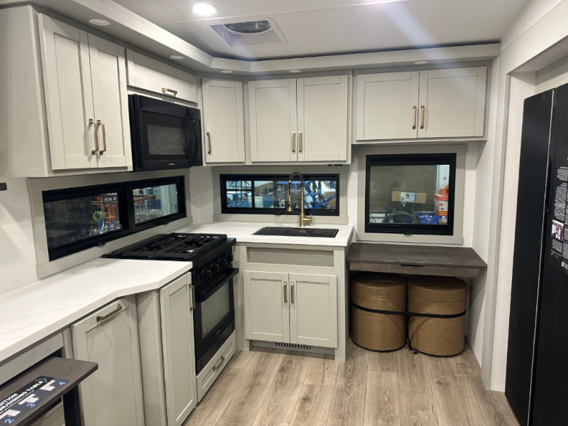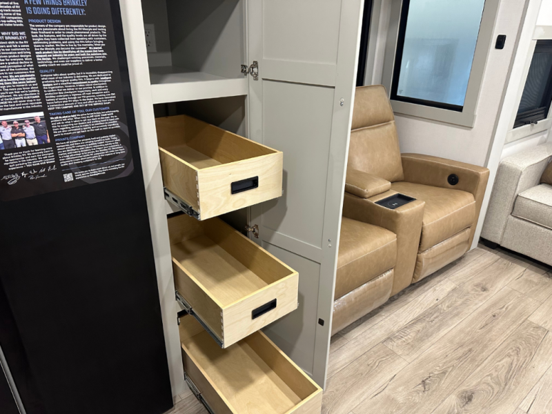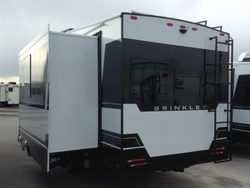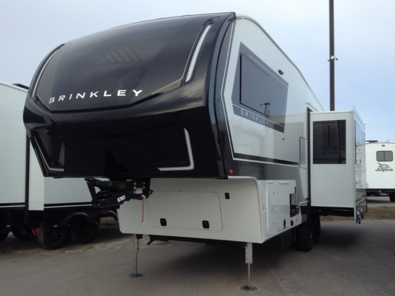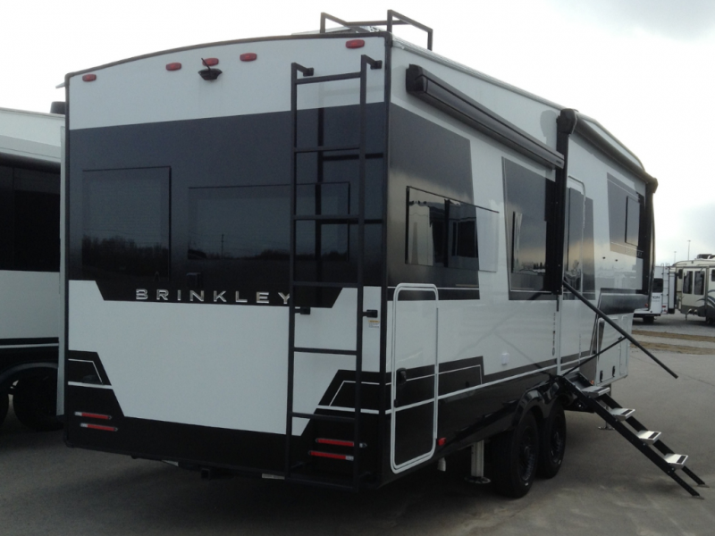 The Brinkley mid-profile Model Z fifth wheels bring you clean lines and an upscale look with plenty of style and exciting new features like the industry first brass plumbing connections. These units also feature an automotive grade front cap, plenty of exterior storage, dual exterior hot and cold showers, and wide stance leveling jacks for easy set up. Residential frameless windows provide a clean look and beautiful views, and ample electrical outlets and USB/USB-C outlets allow all of your electronics and appliances to easily be used and charged.