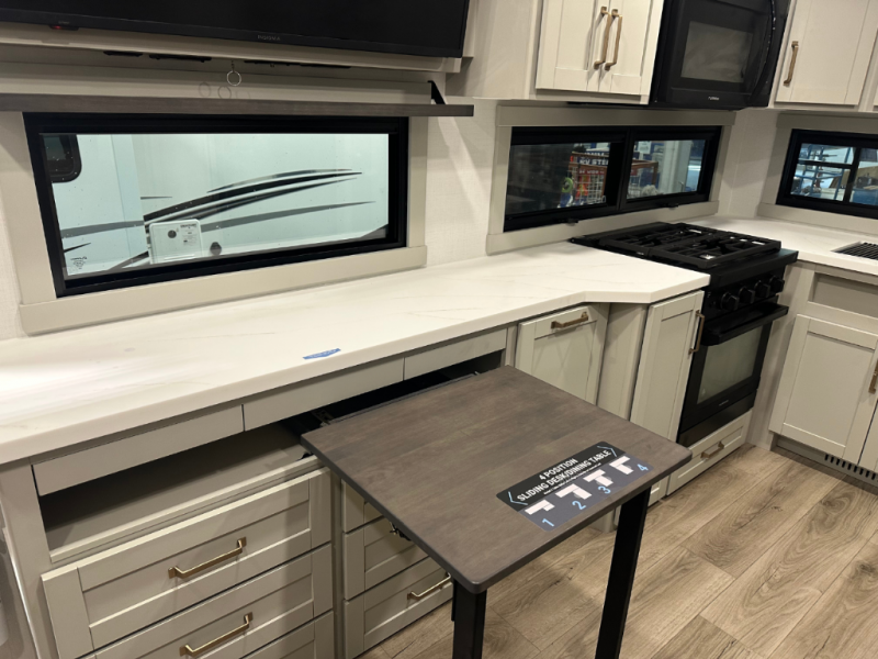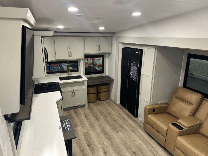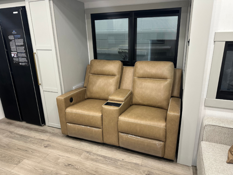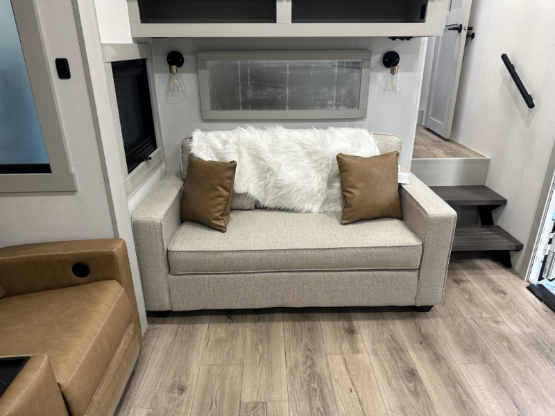 You'll love every minute spent in this spacious fifth wheel that can sleep four each night. There is a front private bedroom with a queen bed and 4x under-bed drawers to keep your space tidy. Your guests can sleep on the tri-fold sofa that extends to a 54" x 70" bed at night. The theater seating sits directly across from the 50" articulating TV for movie nights, and the pantry with drawers is right next to the theater seating for quick access to snacks! The chef of your group is sure to love the kitchen with its ample counter space, 30" residential microwave, and a sliding dining table with a drawer for even more storage. The desk in the back will allow you to get some work done if needed, or you can just spend your days outdoors under the two power awnings. There is also an exterior 12V refrigerator and storage, exterior speakers and controls, and a pass-thru storage for camp gear!