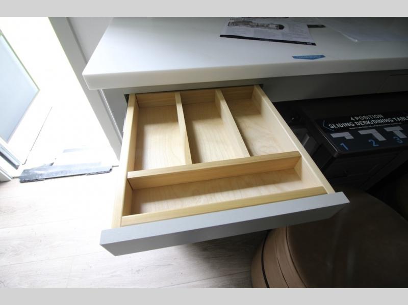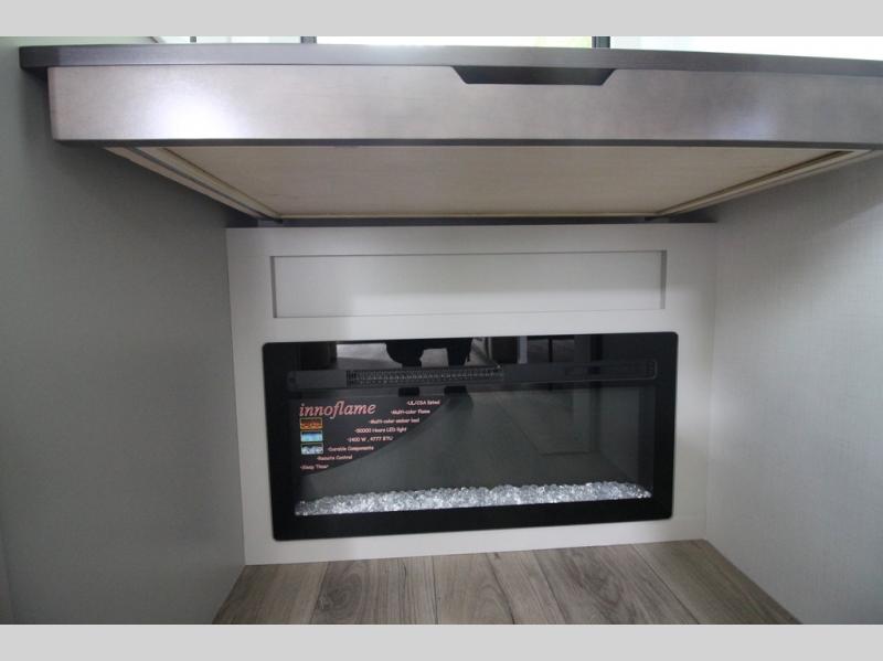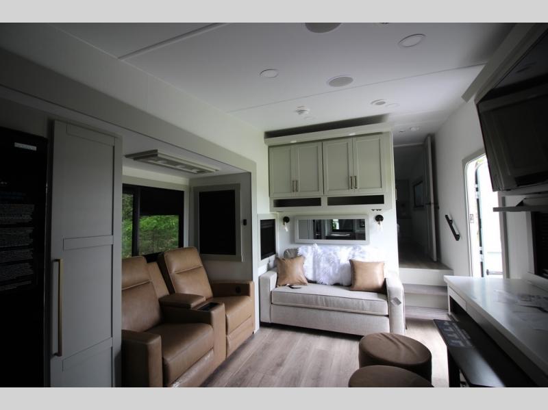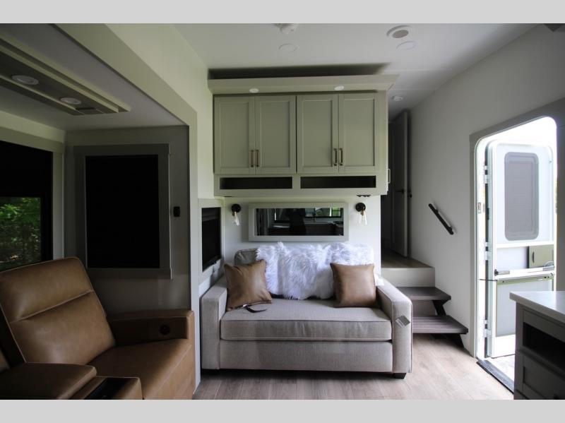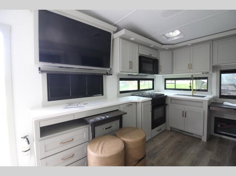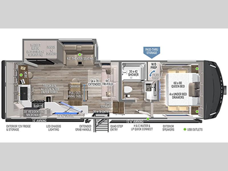 You'll love every minute spent in this spacious fifth wheel that can sleep four each night. There is a front private bedroom with a queen bed and 4x under-bed drawers to keep your space tidy. Your guests can sleep on the tri-fold sofa that extends to a 54" x 70" bed at night. The theater seating sits directly across from the 50" articulating TV for movie nights, and the pantry with drawers is right next to the theater seating for quick access to snacks! The chef of your group is sure to love the kitchen with its ample counter space, 30" residential microwave, and a sliding dining table with a drawer for even more storage. The desk in the back will allow you to get some work done if needed, or you can just spend your days outdoors under the two power awnings. There is also an exterior 12V refrigerator and storage, exterior speakers and controls, and a pass-thru storage for camp gear!