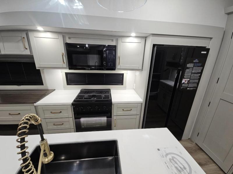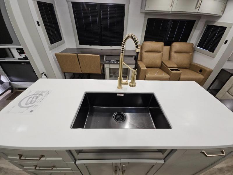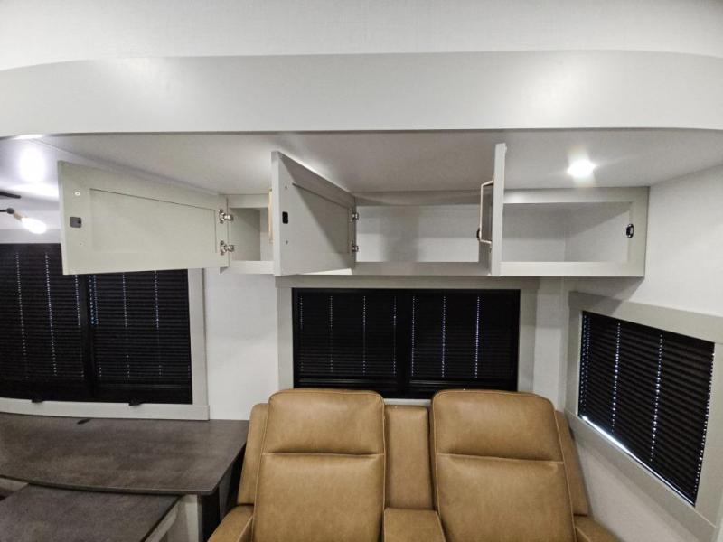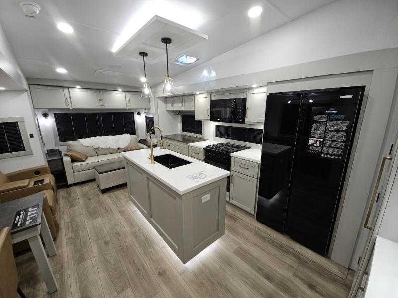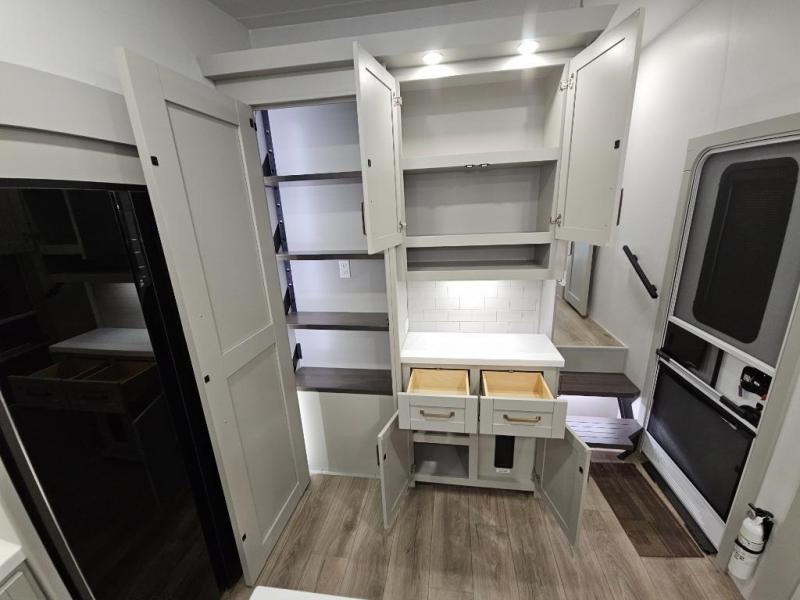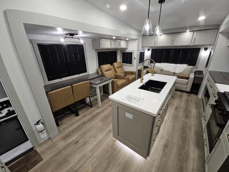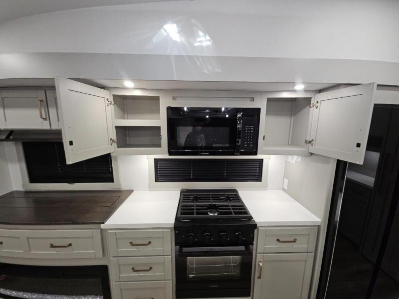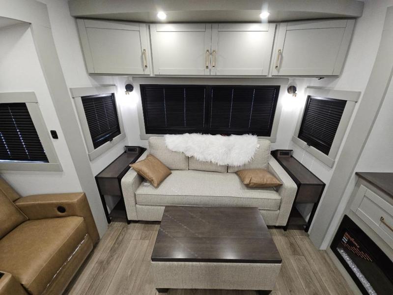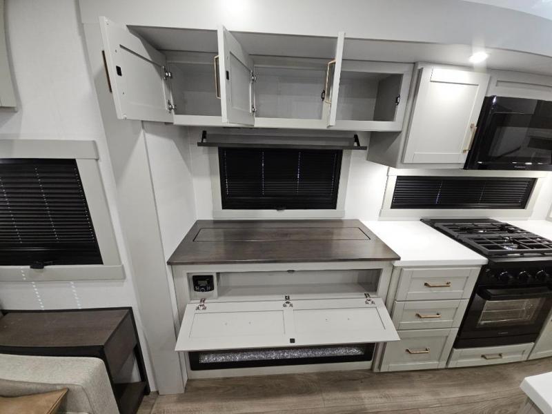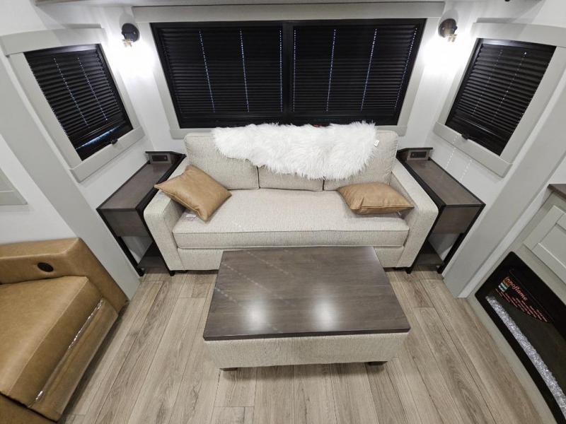 You're going to love every minute spent in this spacious fifth wheel that can sleep four. There is an inviting rear living area with a 72" tri-fold sofa and theater seating across from the televator and fireplace. The chef of your group can whip up dinner on the three burner cooktop or in the 30" residential microwave, and there is a 16 cu. ft. refrigerator that even opens when with the slide out is in. You will also enjoy the kitchen island with a farmhouse sink and roller cover, dual trash bins with a Stow N' Go paper towel holder, plus convenient dog bowls for your furry friends. You can store all your paper goods and snacks in the 84" pantry with adjustable shelving, and there is a hutch for nice dishes plus shoe storage in this model as well. Head to the front master bedroom where you'll find a queen bed with a TV, a large slide out with a wardrobe with drawers, plus a spacious bath.