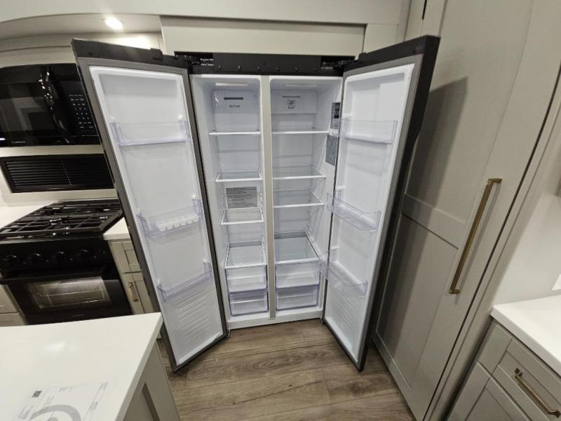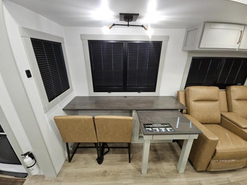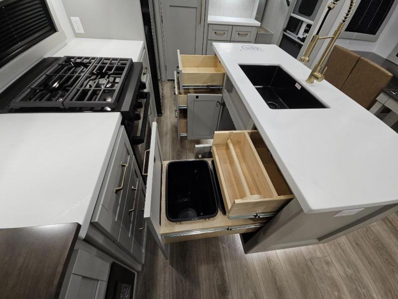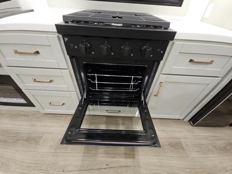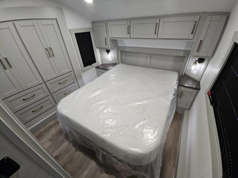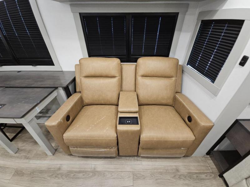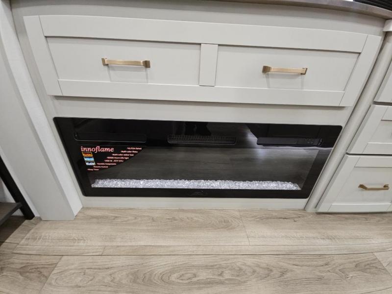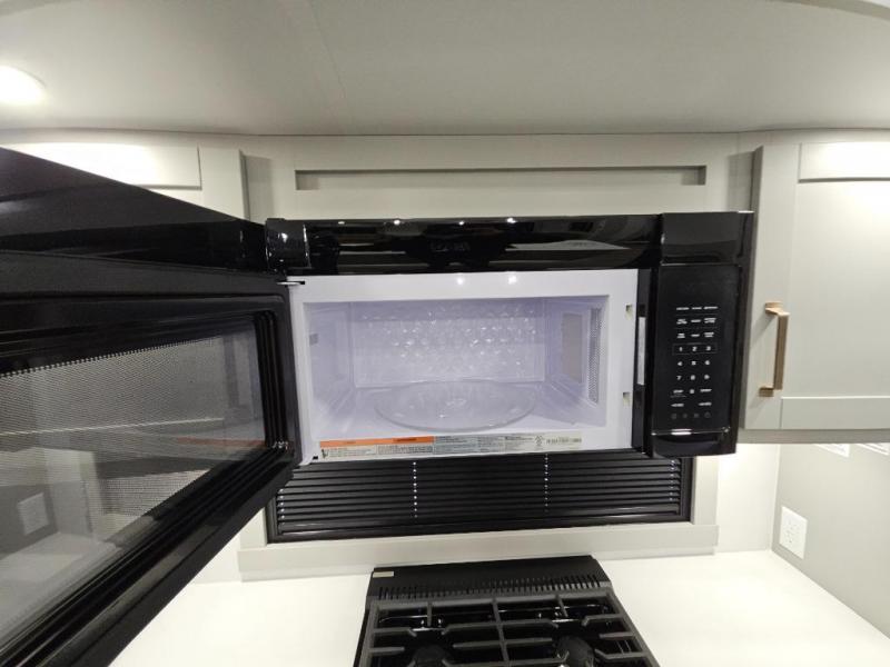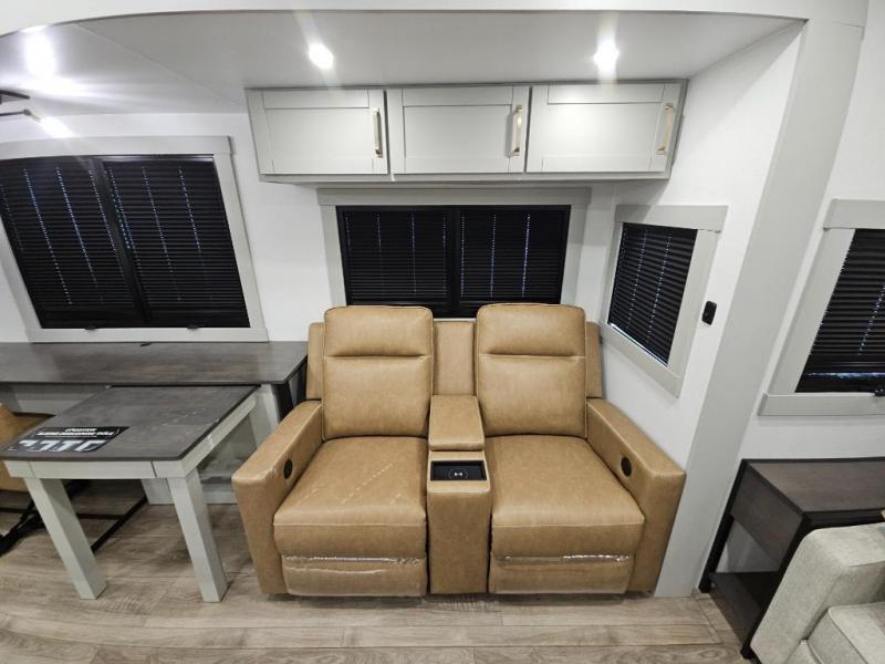 You're going to love every minute spent in this spacious fifth wheel that can sleep four. There is an inviting rear living area with a 72" tri-fold sofa and theater seating across from the televator and fireplace. The chef of your group can whip up dinner on the three burner cooktop or in the 30" residential microwave, and there is a 16 cu. ft. refrigerator that even opens when with the slide out is in. You will also enjoy the kitchen island with a farmhouse sink and roller cover, dual trash bins with a Stow N' Go paper towel holder, plus convenient dog bowls for your furry friends. You can store all your paper goods and snacks in the 84" pantry with adjustable shelving, and there is a hutch for nice dishes plus shoe storage in this model as well. Head to the front master bedroom where you'll find a queen bed with a TV, a large slide out with a wardrobe with drawers, plus a spacious bath.