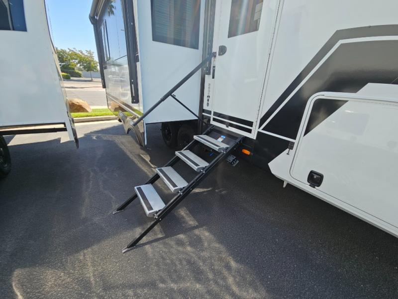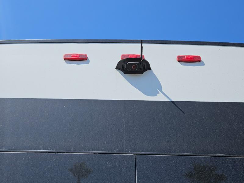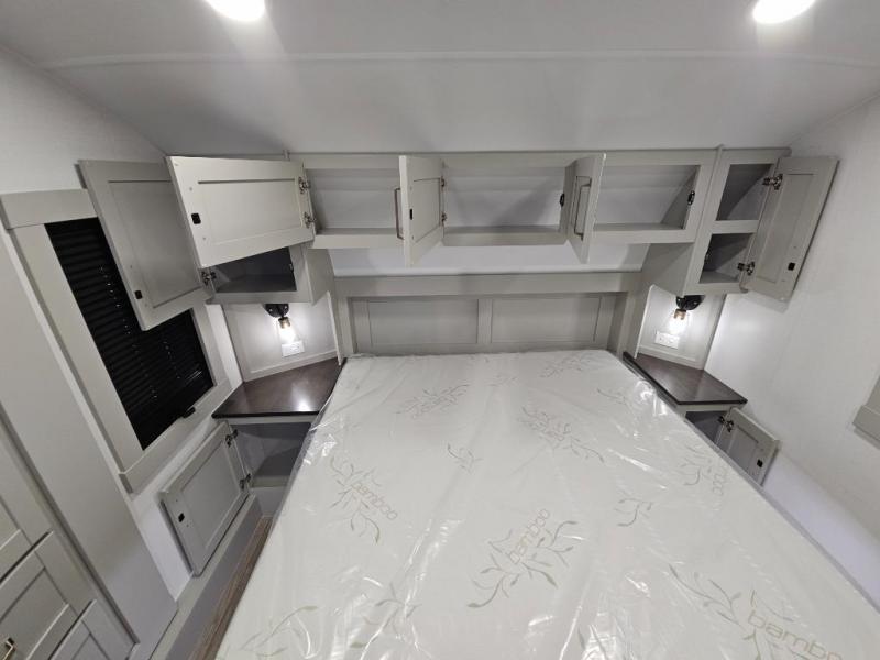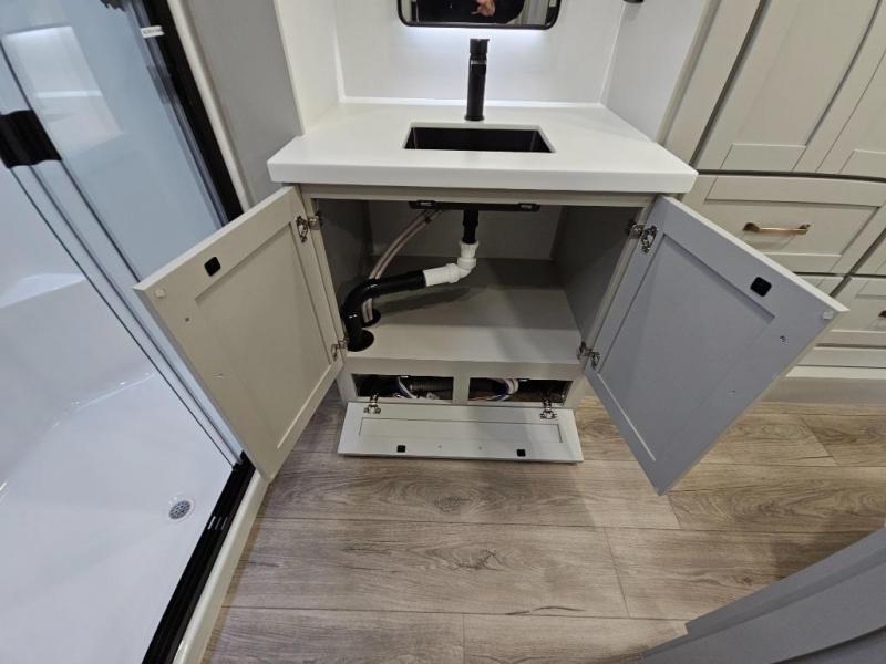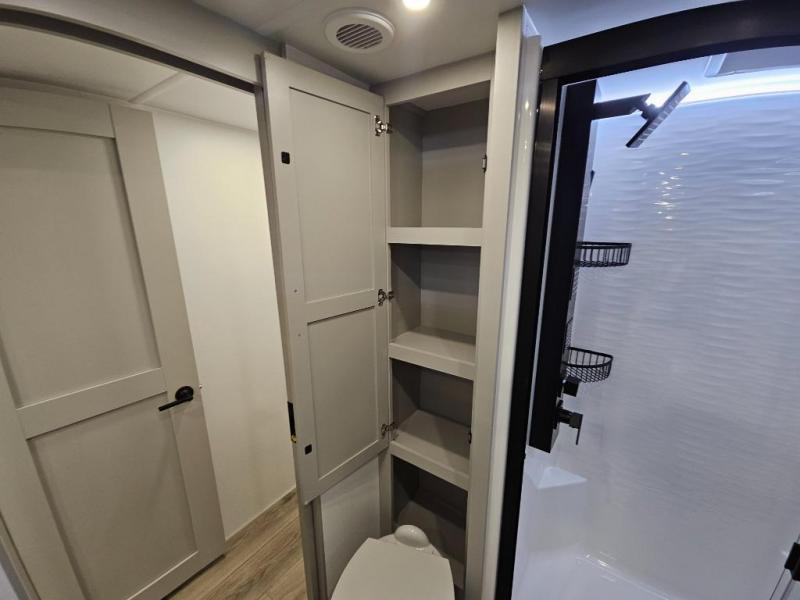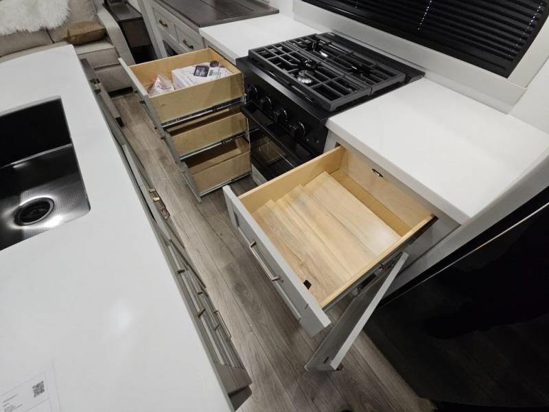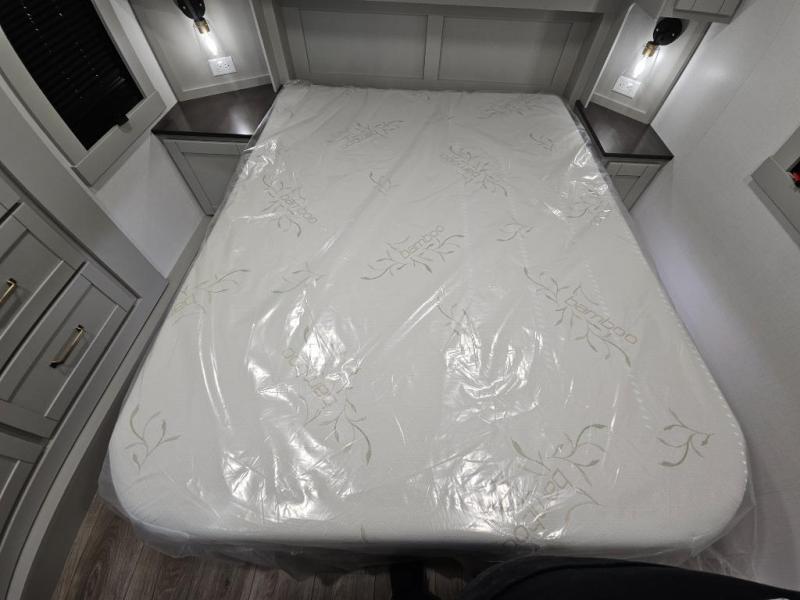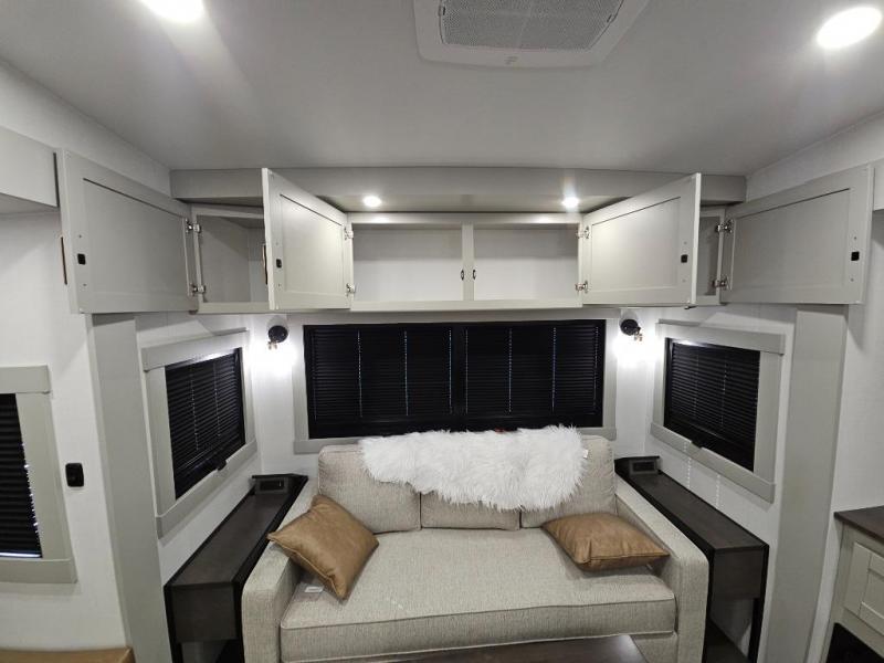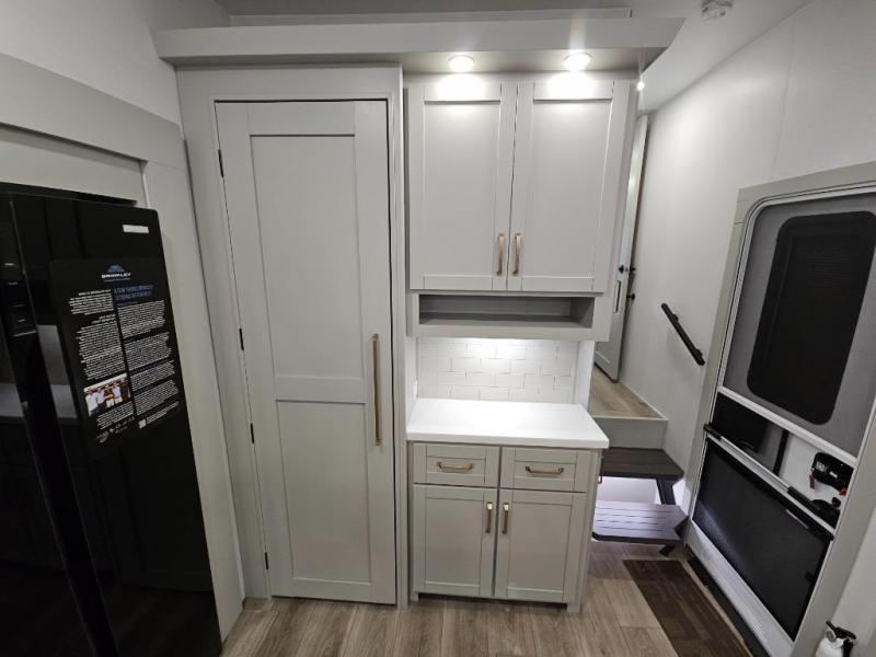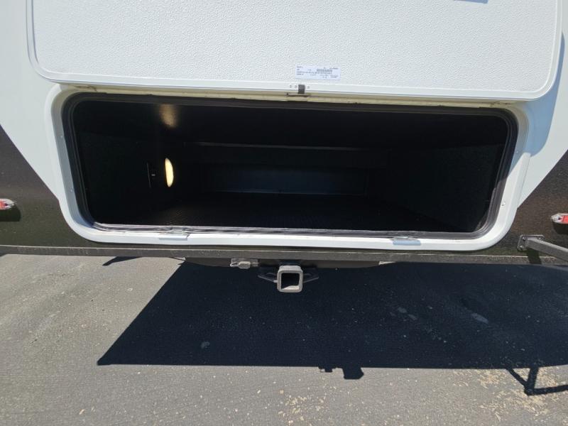 You're going to love every minute spent in this spacious fifth wheel that can sleep four. There is an inviting rear living area with a 72" tri-fold sofa and theater seating across from the televator and fireplace. The chef of your group can whip up dinner on the three burner cooktop or in the 30" residential microwave, and there is a 16 cu. ft. refrigerator that even opens when with the slide out is in. You will also enjoy the kitchen island with a farmhouse sink and roller cover, dual trash bins with a Stow N' Go paper towel holder, plus convenient dog bowls for your furry friends. You can store all your paper goods and snacks in the 84" pantry with adjustable shelving, and there is a hutch for nice dishes plus shoe storage in this model as well. Head to the front master bedroom where you'll find a queen bed with a TV, a large slide out with a wardrobe with drawers, plus a spacious bath.