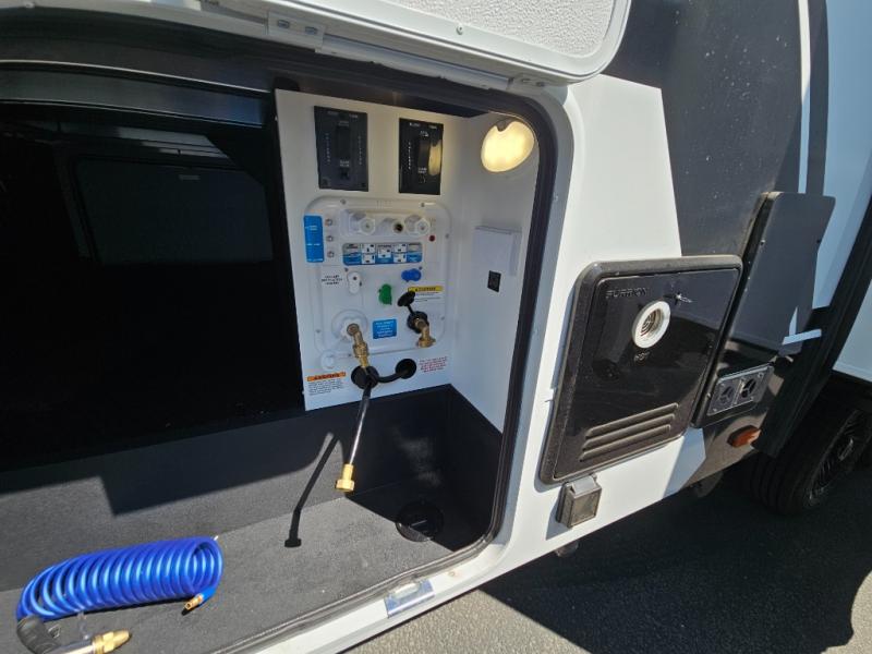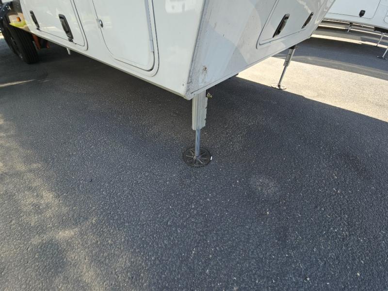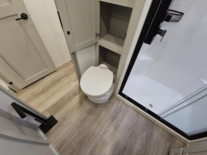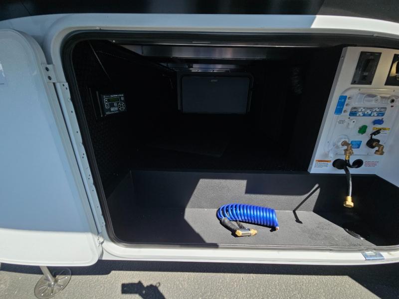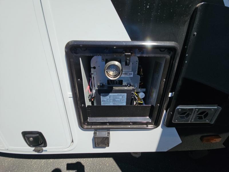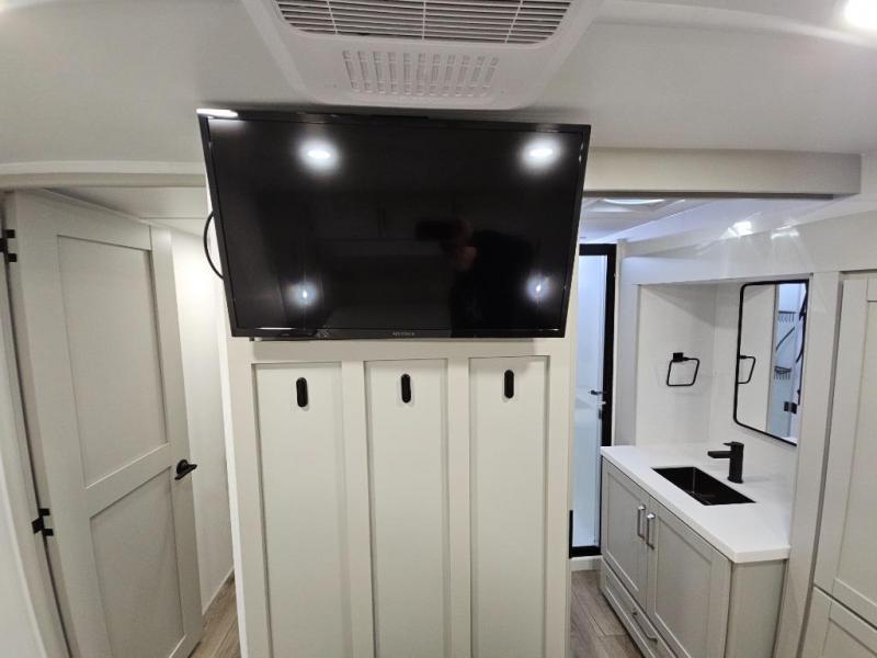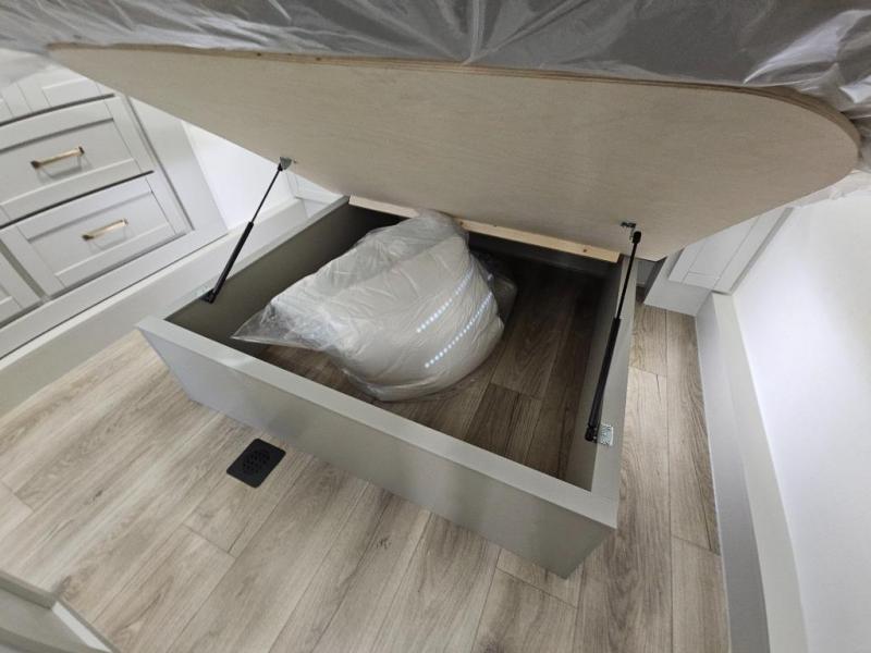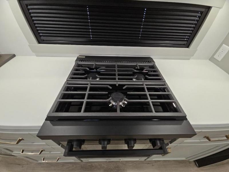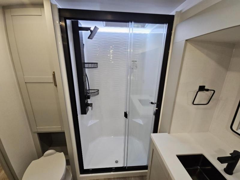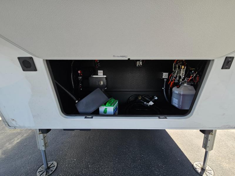 You're going to love every minute spent in this spacious fifth wheel that can sleep four. There is an inviting rear living area with a 72" tri-fold sofa and theater seating across from the televator and fireplace. The chef of your group can whip up dinner on the three burner cooktop or in the 30" residential microwave, and there is a 16 cu. ft. refrigerator that even opens when with the slide out is in. You will also enjoy the kitchen island with a farmhouse sink and roller cover, dual trash bins with a Stow N' Go paper towel holder, plus convenient dog bowls for your furry friends. You can store all your paper goods and snacks in the 84" pantry with adjustable shelving, and there is a hutch for nice dishes plus shoe storage in this model as well. Head to the front master bedroom where you'll find a queen bed with a TV, a large slide out with a wardrobe with drawers, plus a spacious bath.