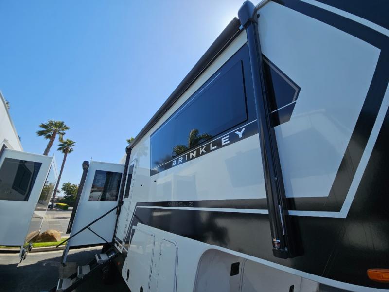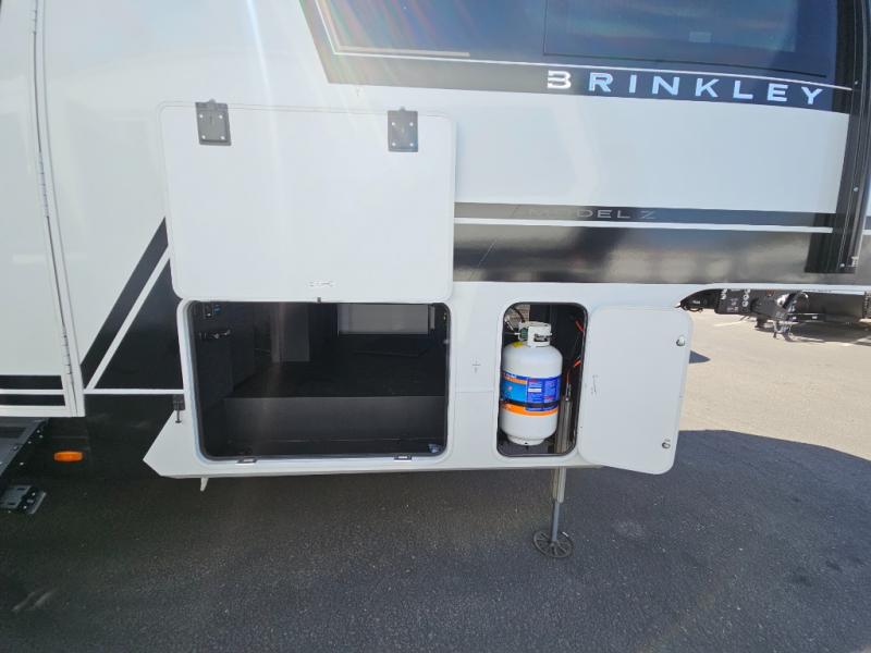 The Brinkley mid-profile Model Z fifth wheels bring you clean lines and an upscale look with plenty of style and exciting new features like the industry first brass plumbing connections. These units also feature an automotive grade front cap, plenty of exterior storage, dual exterior hot and cold showers, and wide stance leveling jacks for easy set up. Residential frameless windows provide a clean look and beautiful views, and ample electrical outlets and USB/USB-C outlets allow all of your electronics and appliances to easily be used and charged.