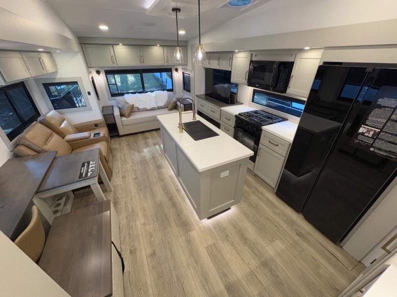 When you want travel accommodations to feel just like home! This Model Z luxury fifth wheel is bright and modern on the inside, with loads of amenities that will have you dreaming of your next trip! Enter and find a spacious combined living/kitchen space thanks to dual opposing slides. There is ample seating with a sliding desk/dining table, 62" theater seating, and a 72" tri-fold sofa along the rear wall. You can easily relax and enjoy the 50" Smart telescoping TV with a cozy fireplace below. The kitchen offers all that you need to prepare and cook meals just like home with a 16 cu. ft. refrigerator for your perishables, a 30" microwave oven, and three burner range top and oven. You will love the integrated spice rack, and the kitchen island all outfitted with dog bowls and double pull out trash bins with an integrated Stow & Go paper towel holder. There is also an 84" pantry with adjustable shelves for all of your canned and dry goods. Head up the steps to a private master suite with king bed slide. You can opt for the queen bed if you like. A sliding dresser top features hidden storage which is perfect for jewelry and other personal belongings. The front wardrobe features mirrored doors and the corner closet has been prepped for a stackable washer and dryer if you choose to add that option. Relax and enjoy a large bath featuring a linen cabinet, a 30" x 42" shower, and vanity with sink, plus medicine cabinet.