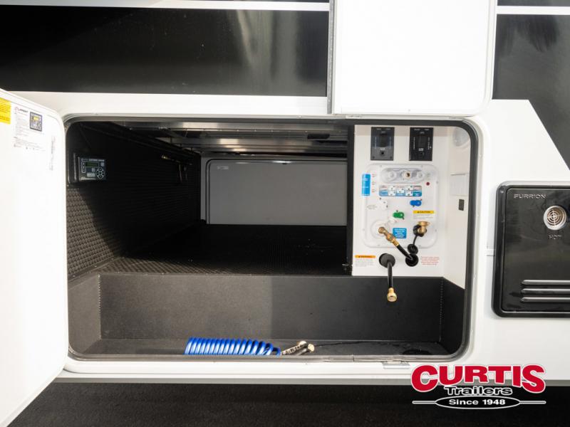 When you want travel accommodations to feel just like home! This Model Z luxury fifth wheel is bright and modern on the inside, with loads of amenities that will have you dreaming of your next trip! Enter and find a spacious combined living/kitchen space thanks to dual opposing slides. There is ample seating with a sliding desk/dining table, 62" theater seating, and a 72" tri-fold sofa along the rear wall. You can easily relax and enjoy the 50" Smart telescoping TV with a cozy fireplace below. The kitchen offers all that you need to prepare and cook meals just like home with a 16 cu. ft. refrigerator for your perishables, a 30" microwave oven, and three burner range top and oven. You will love the integrated spice rack, and the kitchen island all outfitted with dog bowls and double pull out trash bins with an integrated Stow & Go paper towel holder. There is also an 84" pantry with adjustable shelves for all of your canned and dry goods. Head up the steps to a private master suite with king bed slide. You can opt for the queen bed if you like. A sliding dresser top features hidden storage which is perfect for jewelry and other personal belongings. The front wardrobe features mirrored doors and the corner closet has been prepped for a stackable washer and dryer if you choose to add that option. Relax and enjoy a large bath featuring a linen cabinet, a 30" x 42" shower, and vanity with sink, plus medicine cabinet.