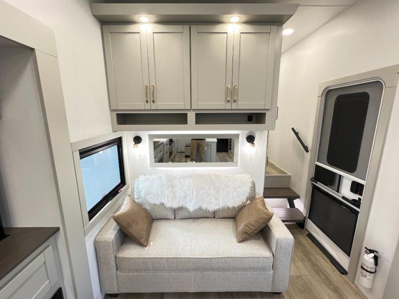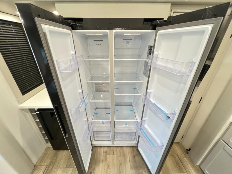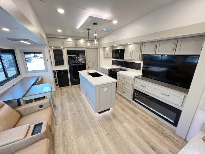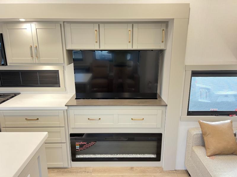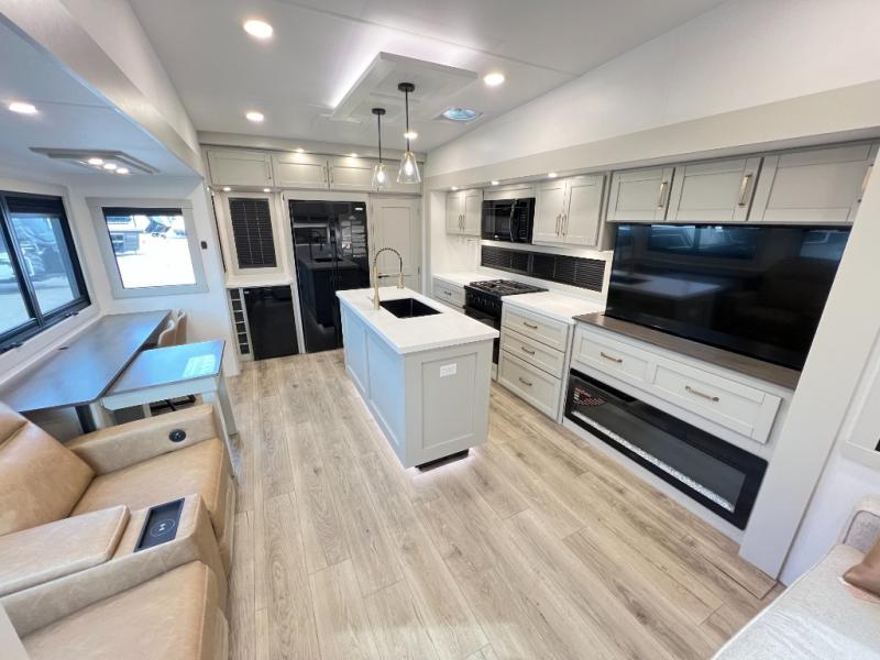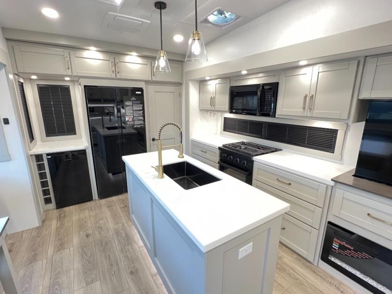 You're going to love every minute spent in this triple slide out fifth wheel! The chef will find everything they need in the kitchen, including a 30" residential microwave, 16 cu. ft. 12V refrigerator, plus a large kitchen island, complete with dual trash bins and dog bowls at the foot. Your crew can get cozy on the tri-fold sofa that extends to a 54" x 70" bed for guests, and there is theater seating across from the televator and fireplace for easy viewing! You will find the front private bedroom ultra accommodating with its king bed slide out, sliding dresser top with hidden storage, your own TV, and a front wardrobe with shelves and a shoe rack. There is even washer and dryer prep if you want the option to make laundry day that much easier!