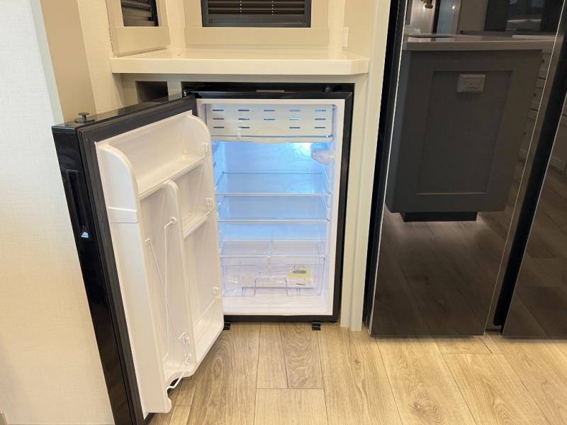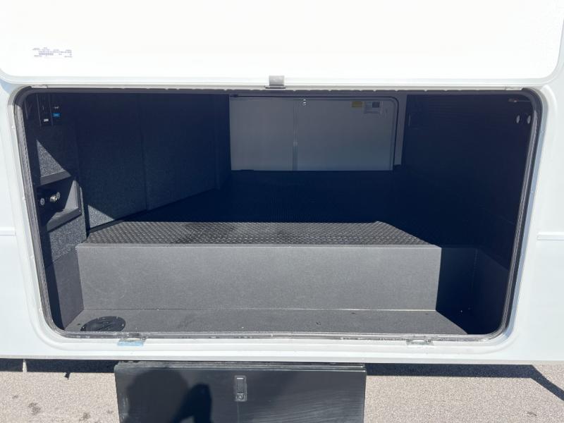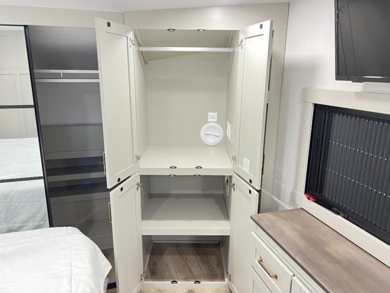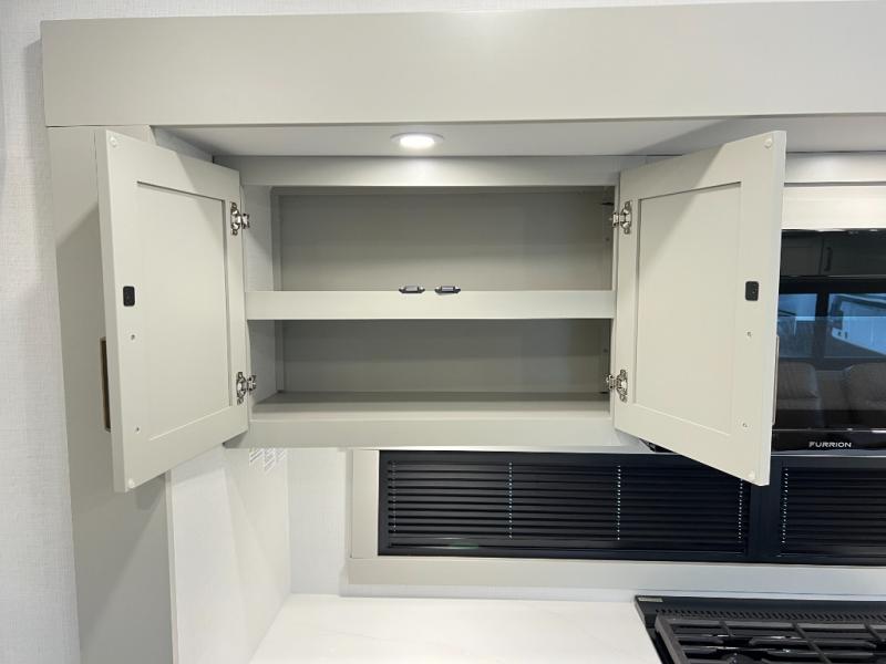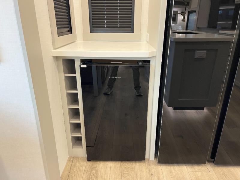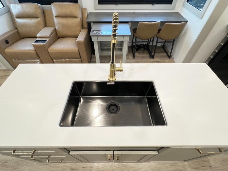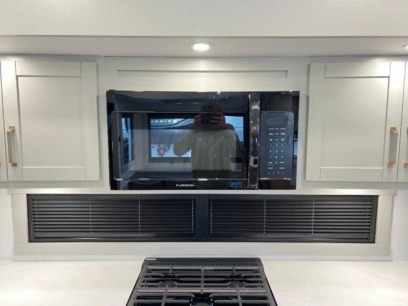 You're going to love every minute spent in this triple slide out fifth wheel! The chef will find everything they need in the kitchen, including a 30" residential microwave, 16 cu. ft. 12V refrigerator, plus a large kitchen island, complete with dual trash bins and dog bowls at the foot. Your crew can get cozy on the tri-fold sofa that extends to a 54" x 70" bed for guests, and there is theater seating across from the televator and fireplace for easy viewing! You will find the front private bedroom ultra accommodating with its king bed slide out, sliding dresser top with hidden storage, your own TV, and a front wardrobe with shelves and a shoe rack. There is even washer and dryer prep if you want the option to make laundry day that much easier!