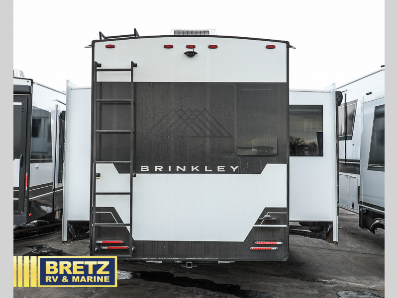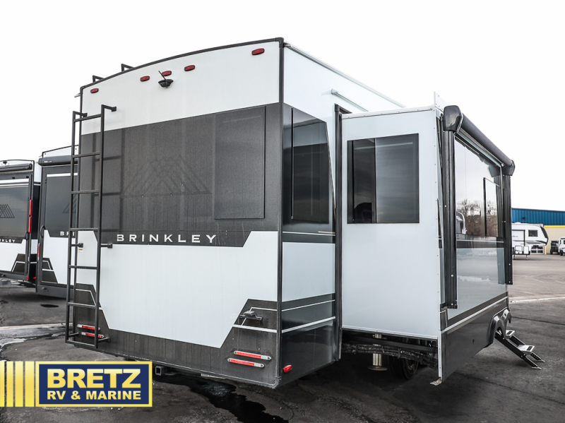 The Brinkley mid-profile Model Z fifth wheels bring you clean lines and an upscale look with plenty of style and exciting new features like the industry first brass plumbing connections. These units also feature an automotive grade front cap, plenty of exterior storage, exterior hot and cold showers, and wide stance leveling jacks for easy set up. Residential frameless windows provide a clean look and beautiful views, and ample electrical outlets and 6 USB/USB-C outlets allow all of your electronics and appliances to easily be used and charged.