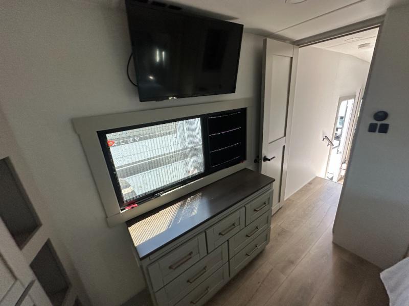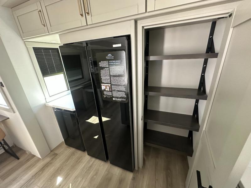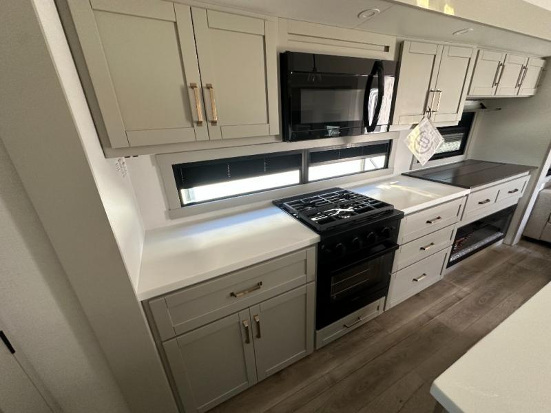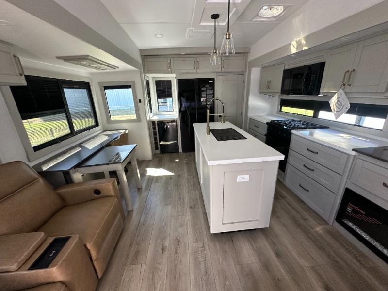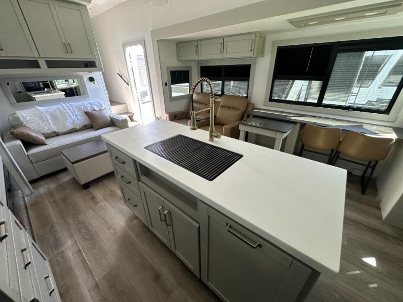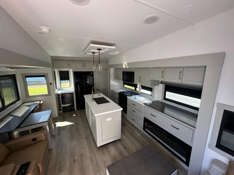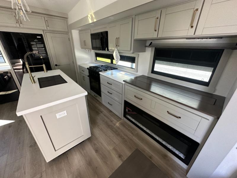 You're going to love every minute spent in this triple slide out fifth wheel! The chef will find everything they need in the kitchen, including a 30" residential microwave, 16 cu. ft. 12V refrigerator, plus a large kitchen island, complete with dual trash bins and dog bowls at the foot. Your crew can get cozy on the tri-fold sofa that extends to a 54" x 70" bed for guests, and there is theater seating across from the televator and fireplace for easy viewing! You will find the front private bedroom ultra accommodating with its king bed slide out, sliding dresser top with hidden storage, your own TV, and a front wardrobe with shelves and a shoe rack. There is even washer and dryer prep if you want the option to make laundry day that much easier!
