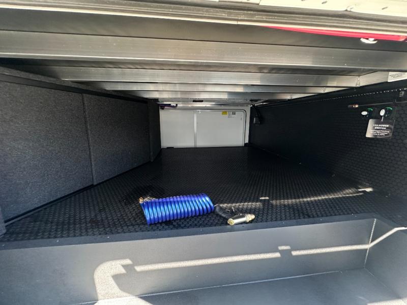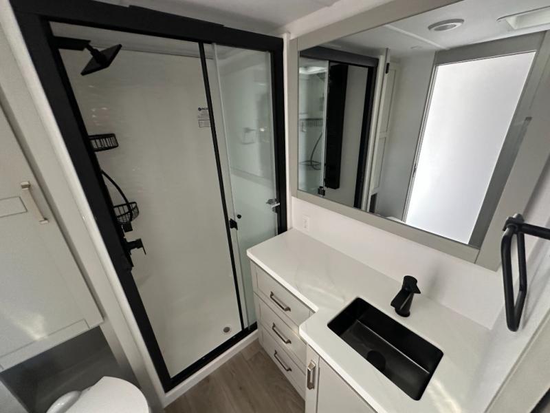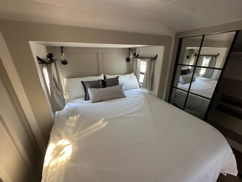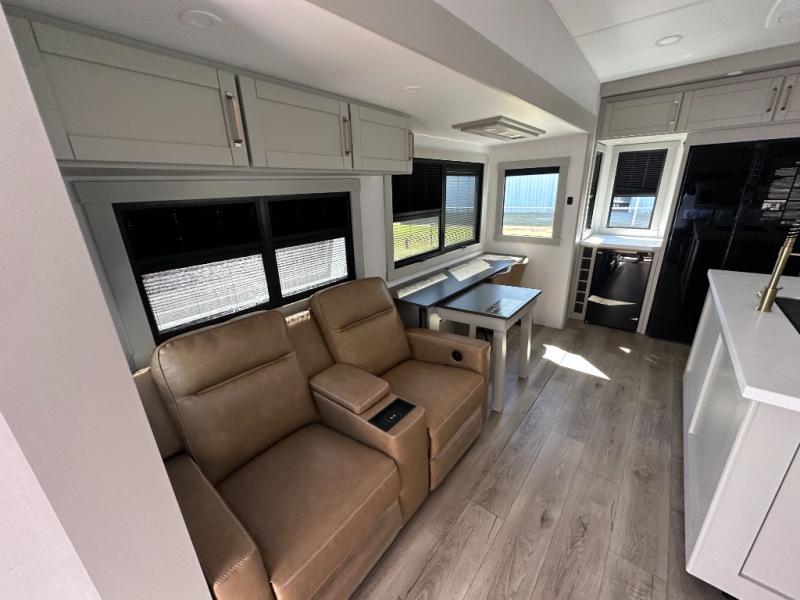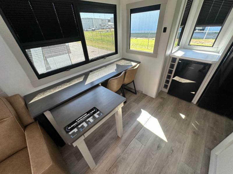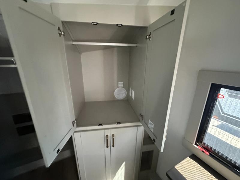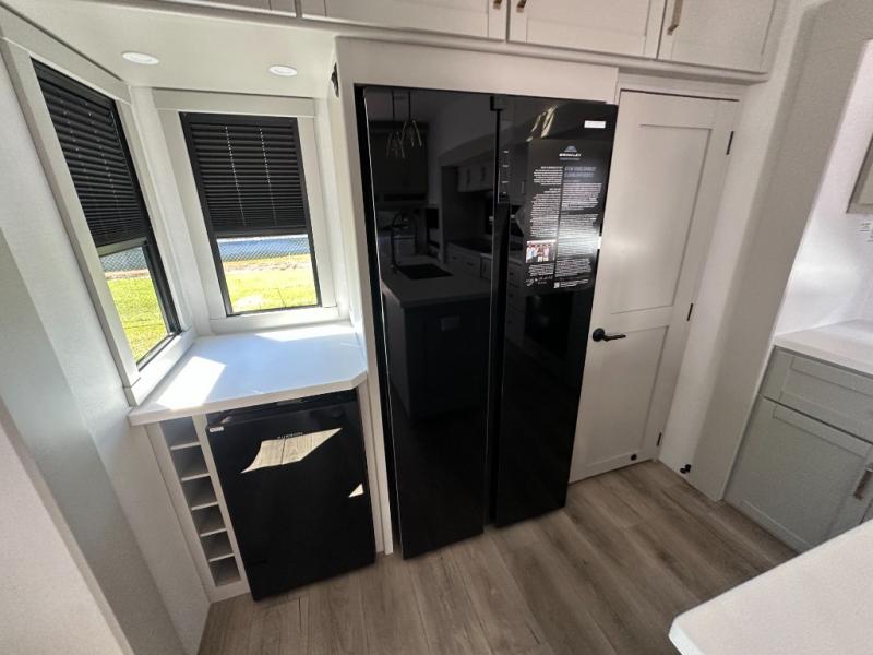 You're going to love every minute spent in this triple slide out fifth wheel! The chef will find everything they need in the kitchen, including a 30" residential microwave, 16 cu. ft. 12V refrigerator, plus a large kitchen island, complete with dual trash bins and dog bowls at the foot. Your crew can get cozy on the tri-fold sofa that extends to a 54" x 70" bed for guests, and there is theater seating across from the televator and fireplace for easy viewing! You will find the front private bedroom ultra accommodating with its king bed slide out, sliding dresser top with hidden storage, your own TV, and a front wardrobe with shelves and a shoe rack. There is even washer and dryer prep if you want the option to make laundry day that much easier!