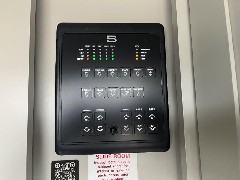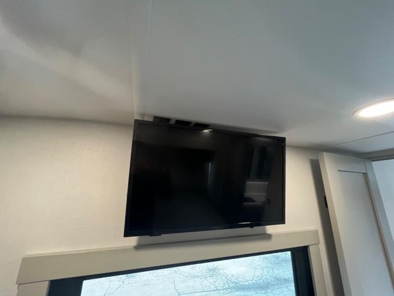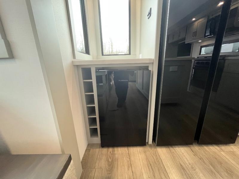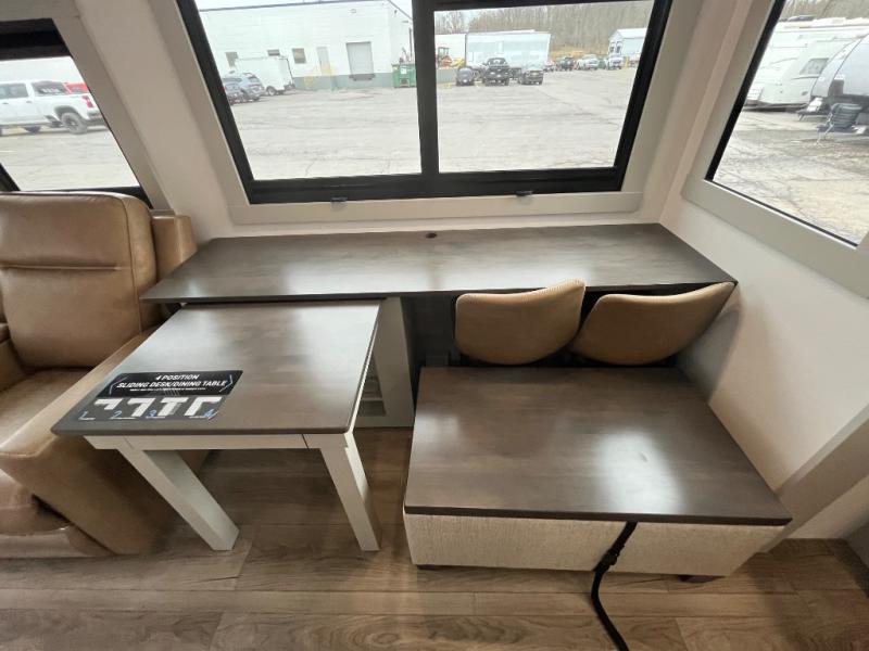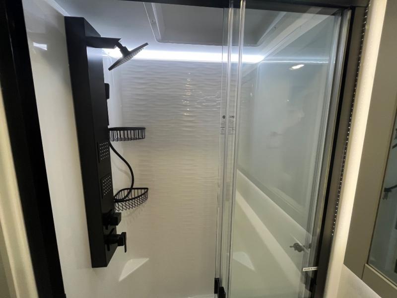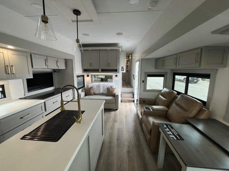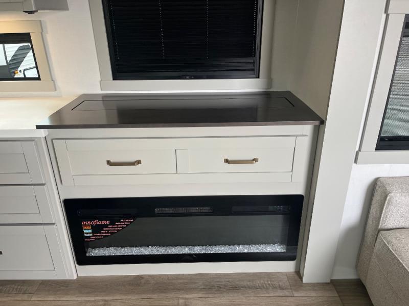 You're going to love every minute spent in this triple slide out fifth wheel! The chef will find everything they need in the kitchen, including a 30" residential microwave, 16 cu. ft. 12V refrigerator, plus a large kitchen island, complete with dual trash bins and dog bowls at the foot. Your crew can get cozy on the tri-fold sofa that extends to a 54" x 70" bed for guests, and there is theater seating across from the televator and fireplace for easy viewing! You will find the front private bedroom ultra accommodating with its king bed slide out, sliding dresser top with hidden storage, your own TV, and a front wardrobe with shelves and a shoe rack. There is even washer and dryer prep if you want the option to make laundry day that much easier!