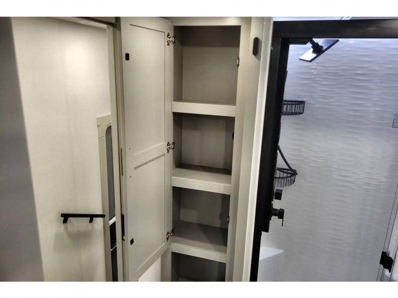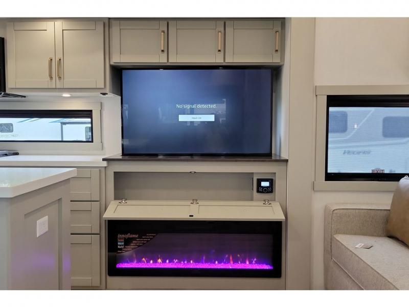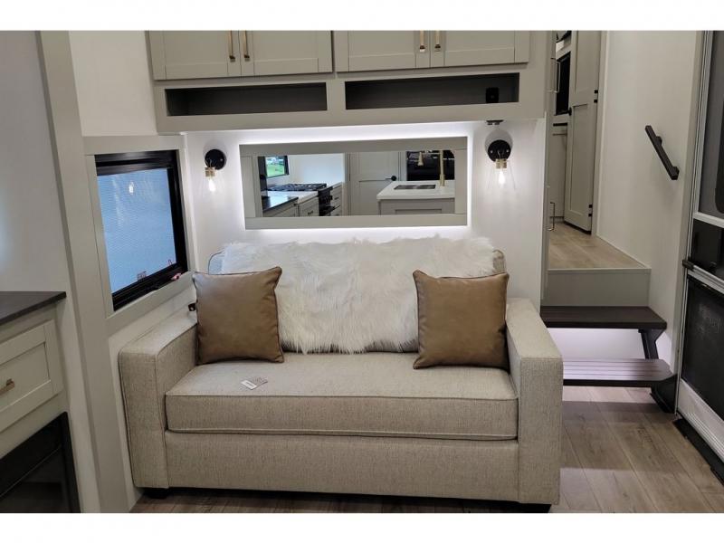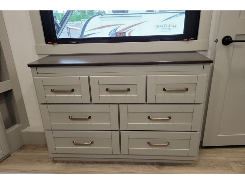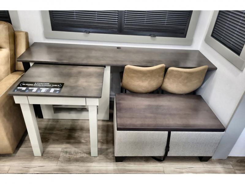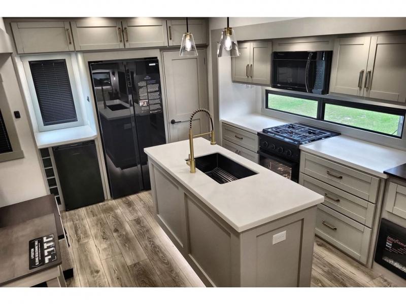 You're going to love every minute spent in this triple slide out fifth wheel! The chef will find everything they need in the kitchen, including a 30" residential microwave, 16 cu. ft. 12V refrigerator, plus a large kitchen island, complete with dual trash bins and dog bowls at the foot. Your crew can get cozy on the tri-fold sofa that extends to a 54" x 70" bed for guests, and there is theater seating across from the televator and fireplace for easy viewing! You will find the front private bedroom ultra accommodating with its king bed slide out, sliding dresser top with hidden storage, your own TV, and a front wardrobe with shelves and a shoe rack. There is even washer and dryer prep if you want the option to make laundry day that much easier!