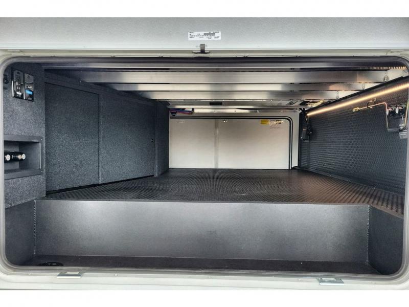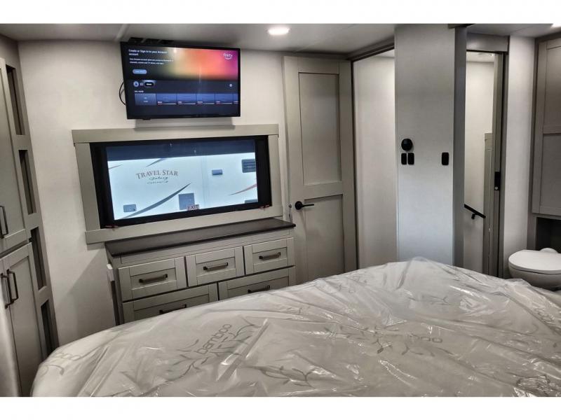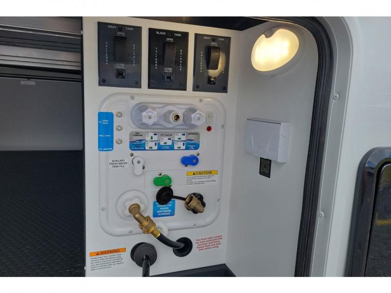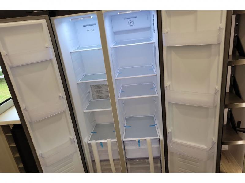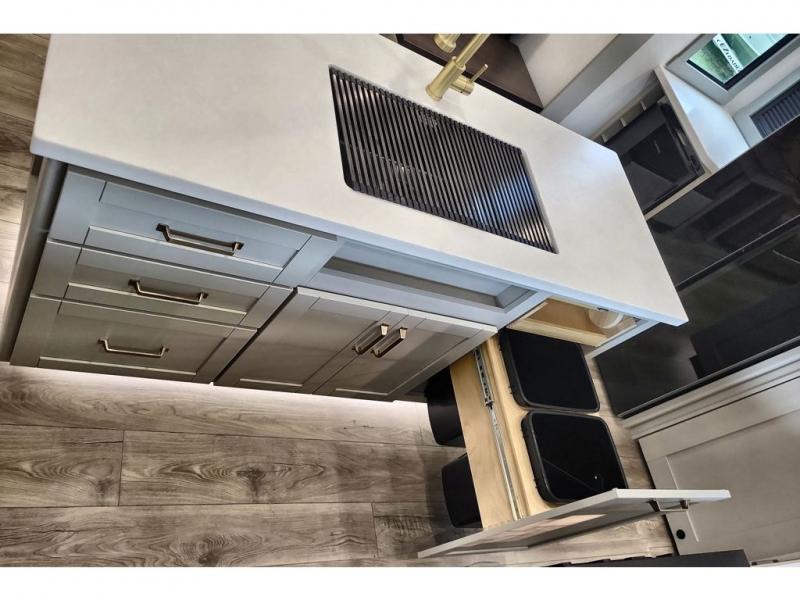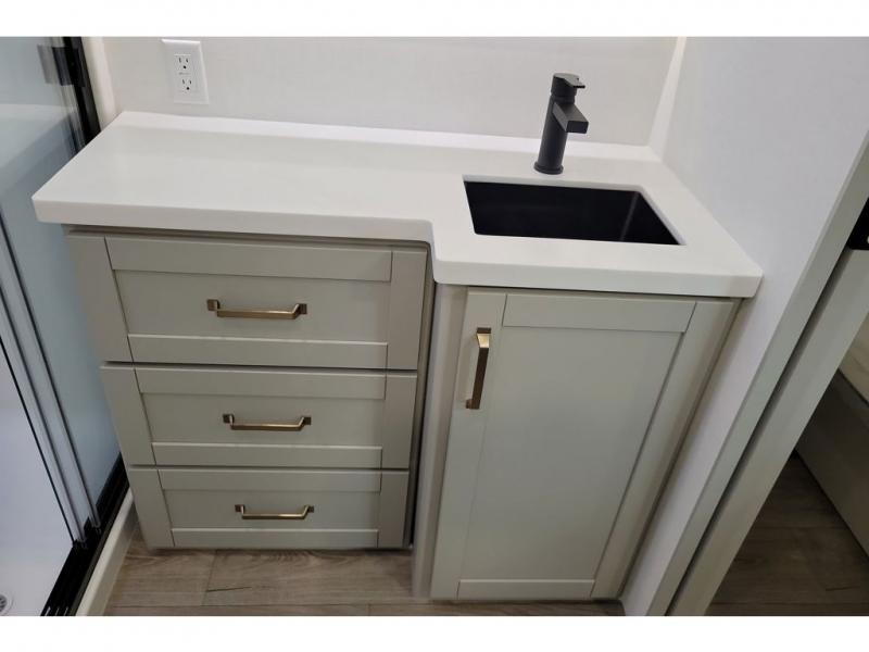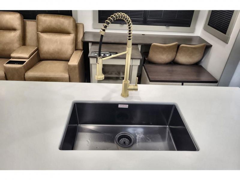 You're going to love every minute spent in this triple slide out fifth wheel! The chef will find everything they need in the kitchen, including a 30" residential microwave, 16 cu. ft. 12V refrigerator, plus a large kitchen island, complete with dual trash bins and dog bowls at the foot. Your crew can get cozy on the tri-fold sofa that extends to a 54" x 70" bed for guests, and there is theater seating across from the televator and fireplace for easy viewing! You will find the front private bedroom ultra accommodating with its king bed slide out, sliding dresser top with hidden storage, your own TV, and a front wardrobe with shelves and a shoe rack. There is even washer and dryer prep if you want the option to make laundry day that much easier!