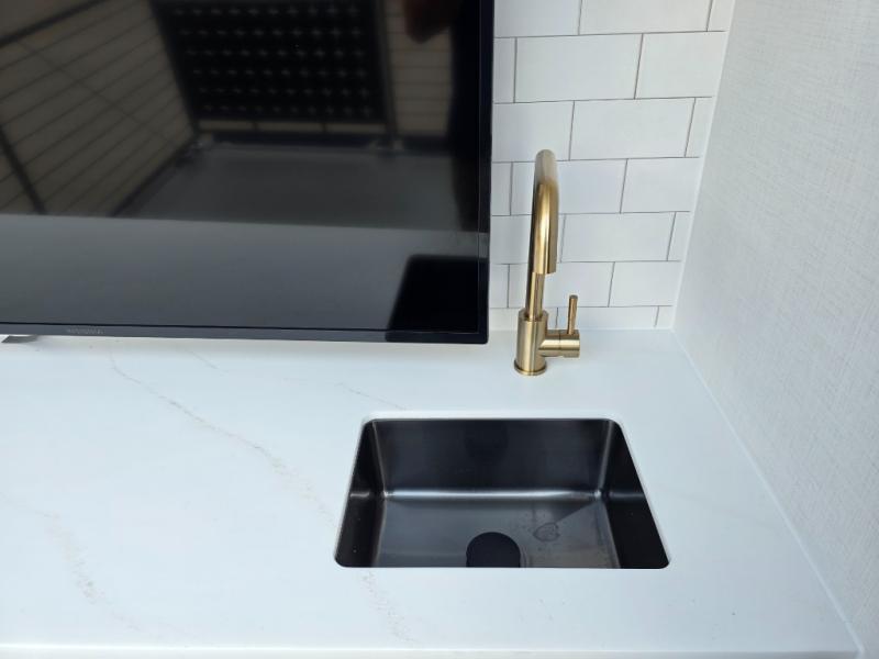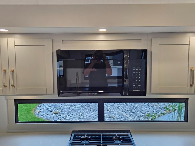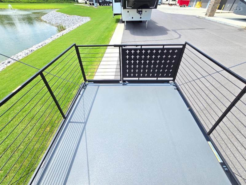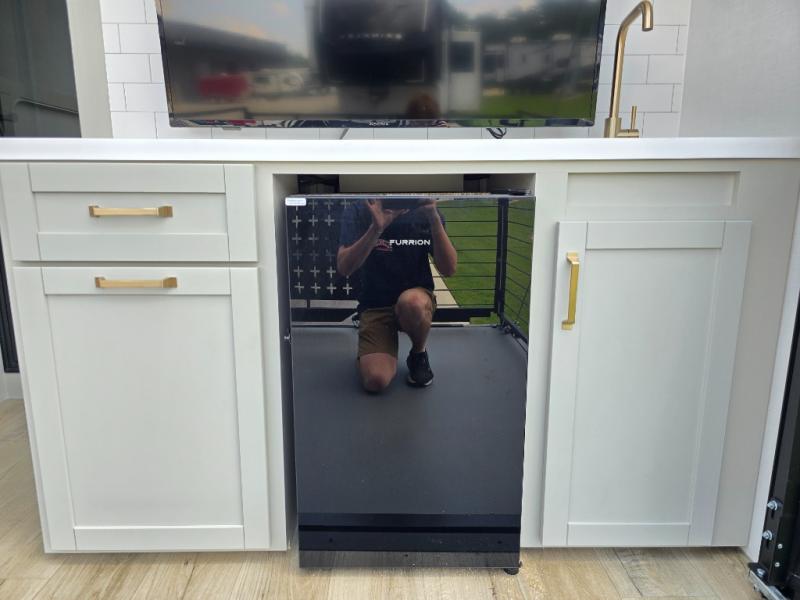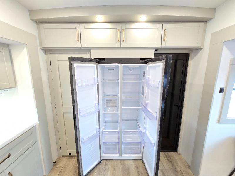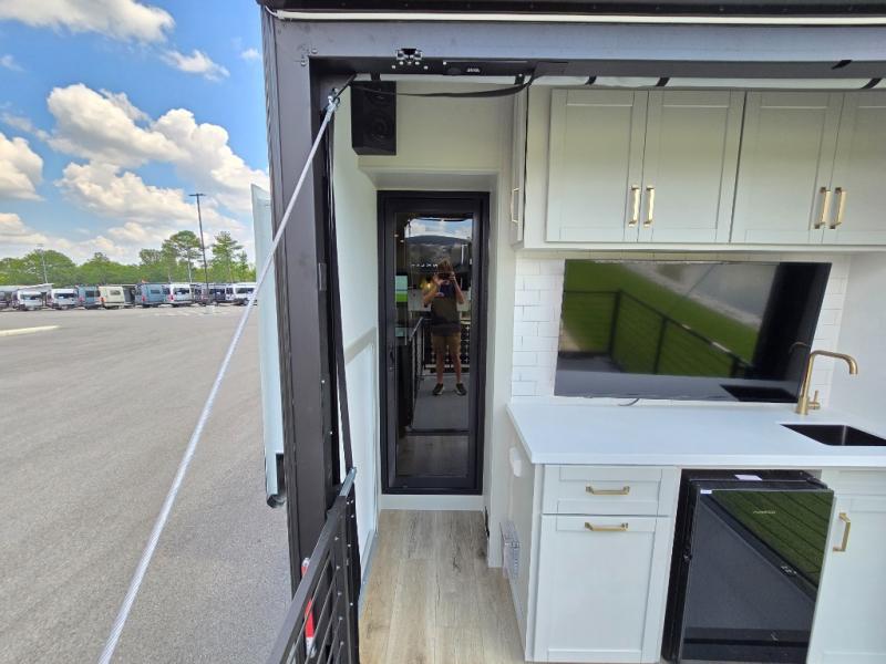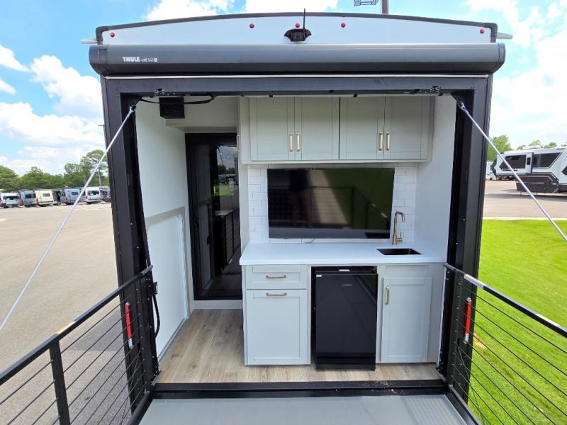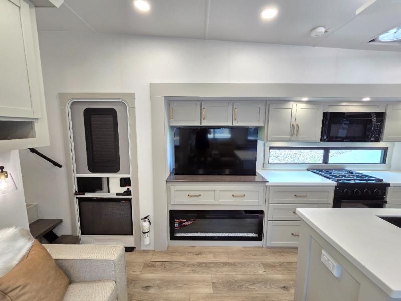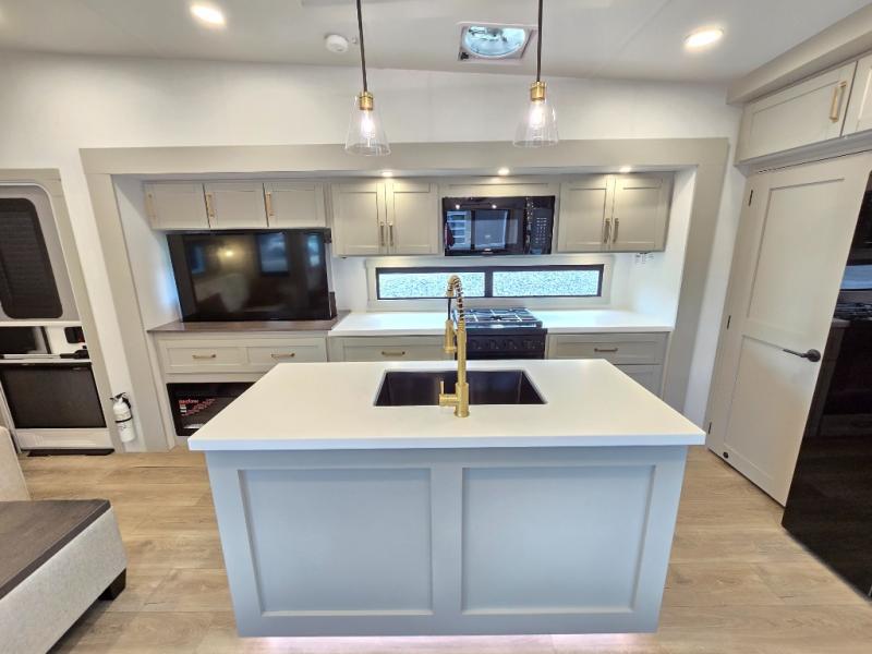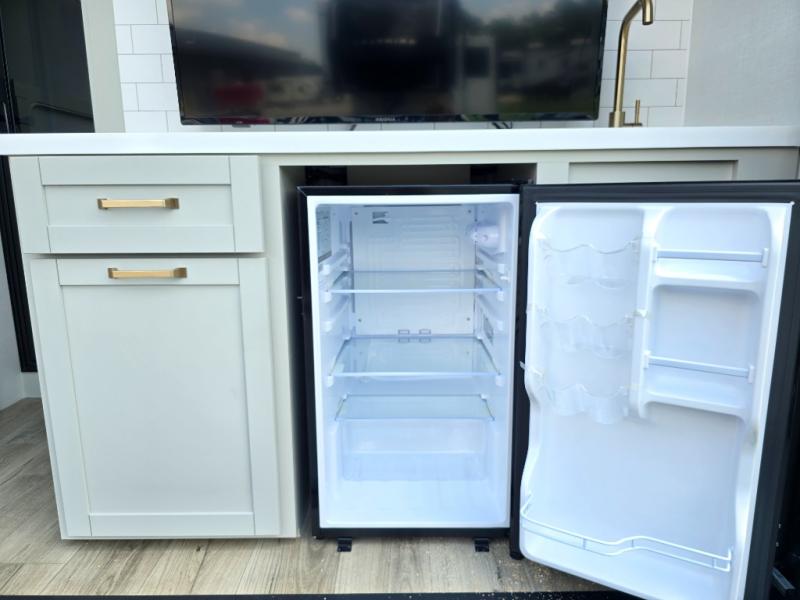 You're going to love every minute spent in this triple slide out fifth wheel! Once you arrive at the campground, you can put out the two side awnings, set up the rear patio and awning, then make lunch on the outdoor kitchen! There is also an outdoor TV here, a bar sink, and a refrigerator to keep drinks close by! Inside, the chef will find everything they need if the weather isn't cooperating, including a 30" residential microwave, 16 cu. ft. refrigerator, plus a large kitchen island, complete with dual trash bins and dog bowls at the foot. Your crew can get cozy on the tri-fold sofa that extends to a 54" x 70" bed for guests, and there is theater seating across from the televator and fireplace for easy viewing! You will find the front private bedroom ultra accommodating with its king bed slide out, sliding dresser top with hidden storage, your own TV, and a front wardrobe with shelves and a shoe rack. There is even washer and dryer prep if you want the option to make laundry day that much easier!