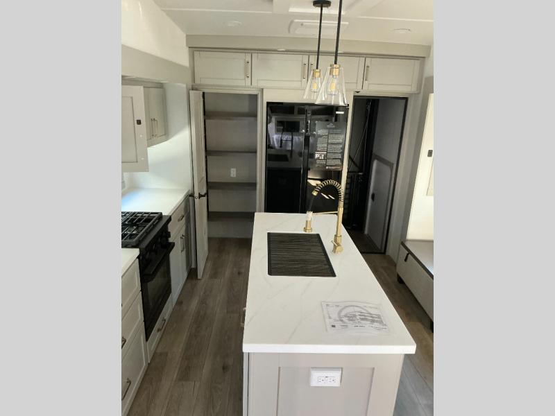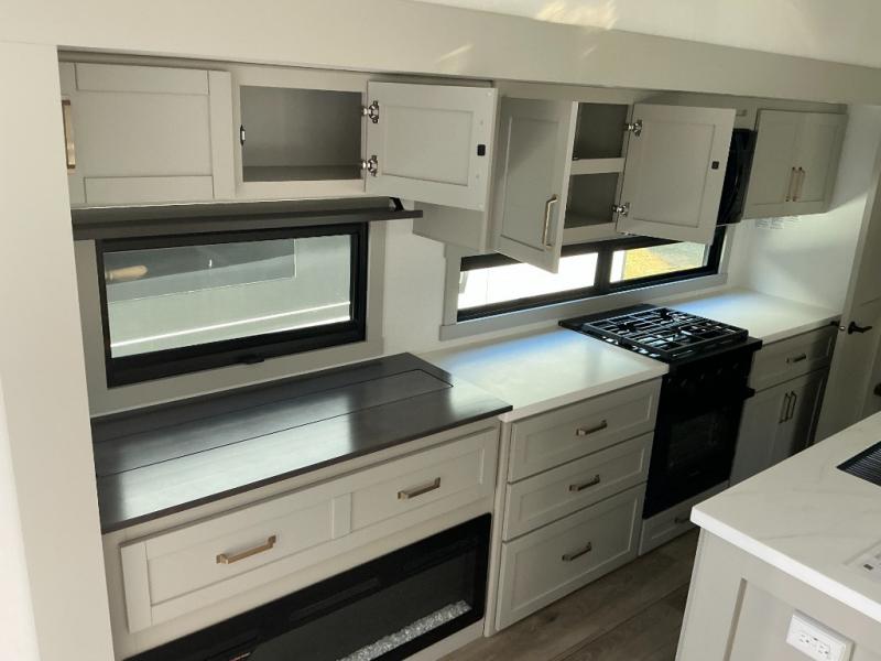 You're going to love every minute spent in this triple slide out fifth wheel! Once you arrive at the campground, you can put out the two side awnings, set up the rear patio and awning, then make lunch on the outdoor kitchen! There is also an outdoor TV here, a bar sink, and a refrigerator to keep drinks close by! Inside, the chef will find everything they need if the weather isn't cooperating, including a 30" residential microwave, 16 cu. ft. refrigerator, plus a large kitchen island, complete with dual trash bins and dog bowls at the foot. Your crew can get cozy on the tri-fold sofa that extends to a 54" x 70" bed for guests, and there is theater seating across from the televator and fireplace for easy viewing! You will find the front private bedroom ultra accommodating with its king bed slide out, sliding dresser top with hidden storage, your own TV, and a front wardrobe with shelves and a shoe rack. There is even washer and dryer prep if you want the option to make laundry day that much easier!
