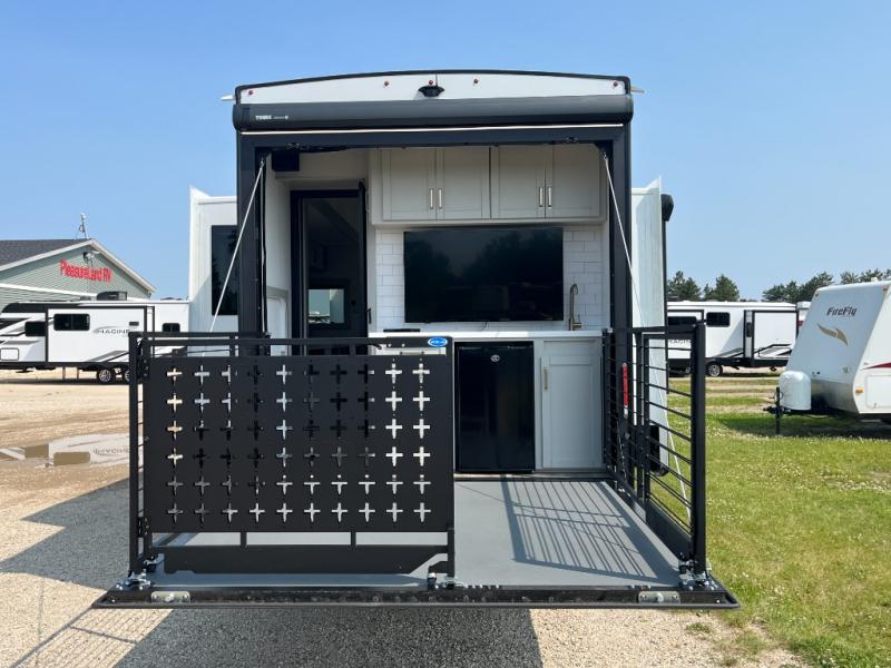 You're going to love every minute spent in this triple slide out fifth wheel! Once you arrive at the campground, you can put out the two side awnings, set up the rear patio and awning, then make lunch on the outdoor kitchen! There is also an outdoor TV here, a bar sink, and a refrigerator to keep drinks close by! Inside, the chef will find everything they need if the weather isn't cooperating, including a 30" residential microwave, 16 cu. ft. refrigerator, plus a large kitchen island, complete with dual trash bins and dog bowls at the foot. Your crew can get cozy on the tri-fold sofa that extends to a 54" x 70" bed for guests, and there is theater seating across from the televator and fireplace for easy viewing! You will find the front private bedroom ultra accommodating with its king bed slide out, sliding dresser top with hidden storage, your own TV, and a front wardrobe with shelves and a shoe rack. There is even washer and dryer prep if you want the option to make laundry day that much easier!